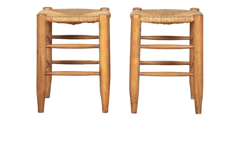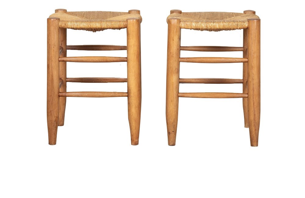 Featuring turned, tapering legs and traditional woven rush seats. In the spirit of Charlotte Perriand. These stools exemplify the French Rustic/Modern tradition and are often associated with the vernacular furniture admired by designers such as Perriand. They work equally well as occasional seating, bedside stools, or accent pieces in both modern and traditional interiors.