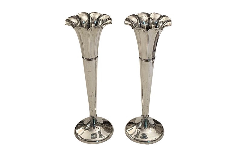 Pair of early 20th Century Edwardian, elegant and refined silver plate fluted specimen vases.