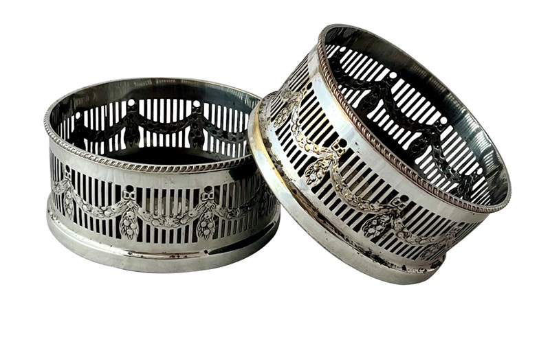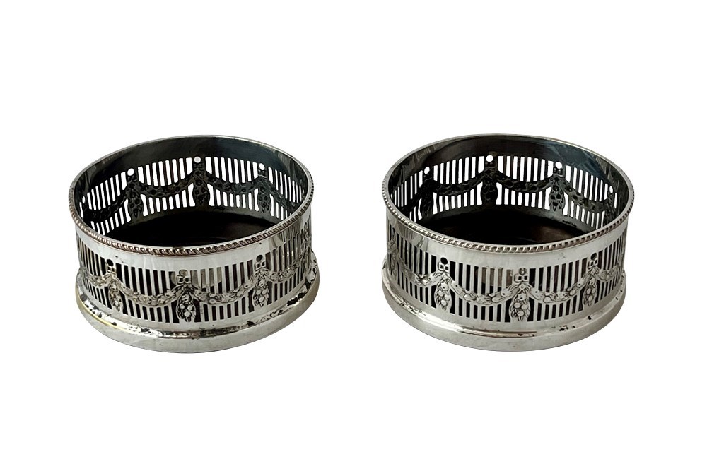 Pair of elegant 20th Century English silver plate wine coasters.