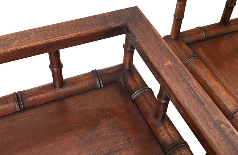 Pair of folding faux bamboo side tables. Each with raised galleries to three sides. Circa 1970, France.