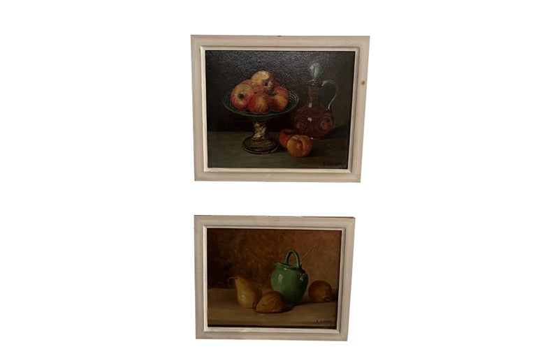 One painting depicts a compote with apples and a glass decanter. The subject of the second is a green pottery jug and pears.