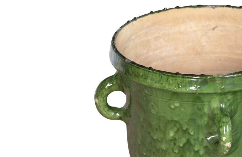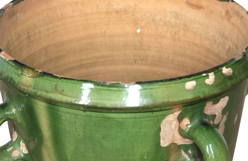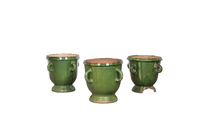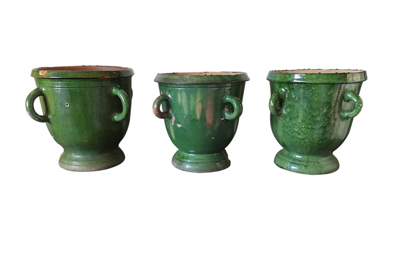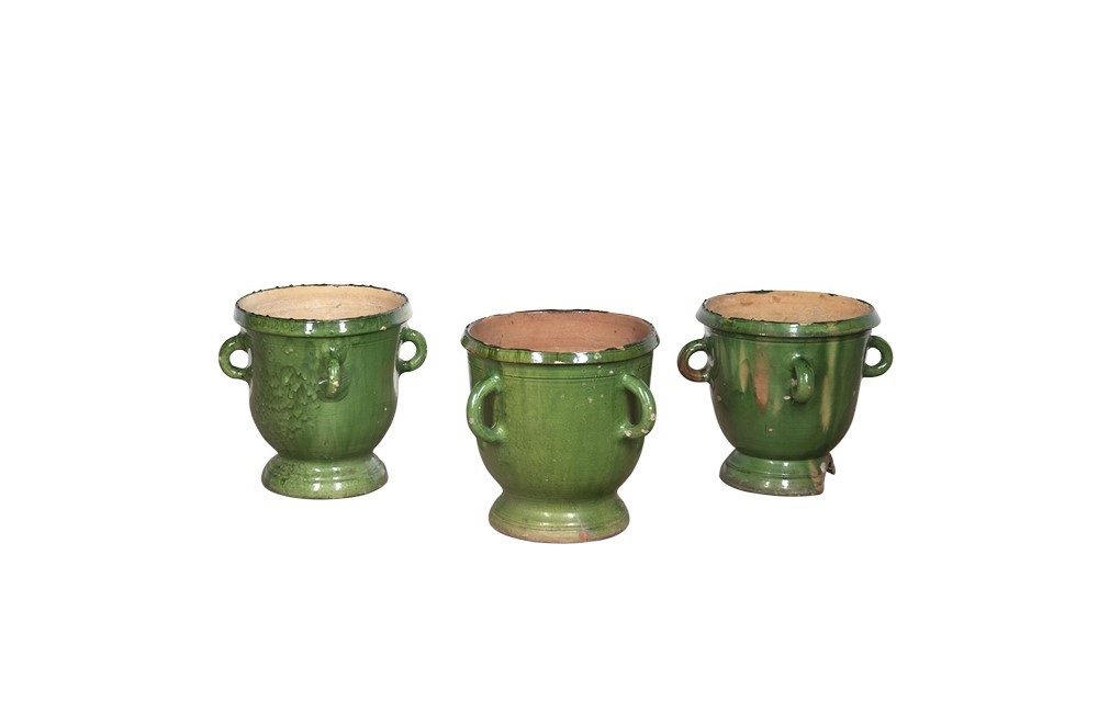 Collection of three large green-glazed Castelnaudary four handled planters.