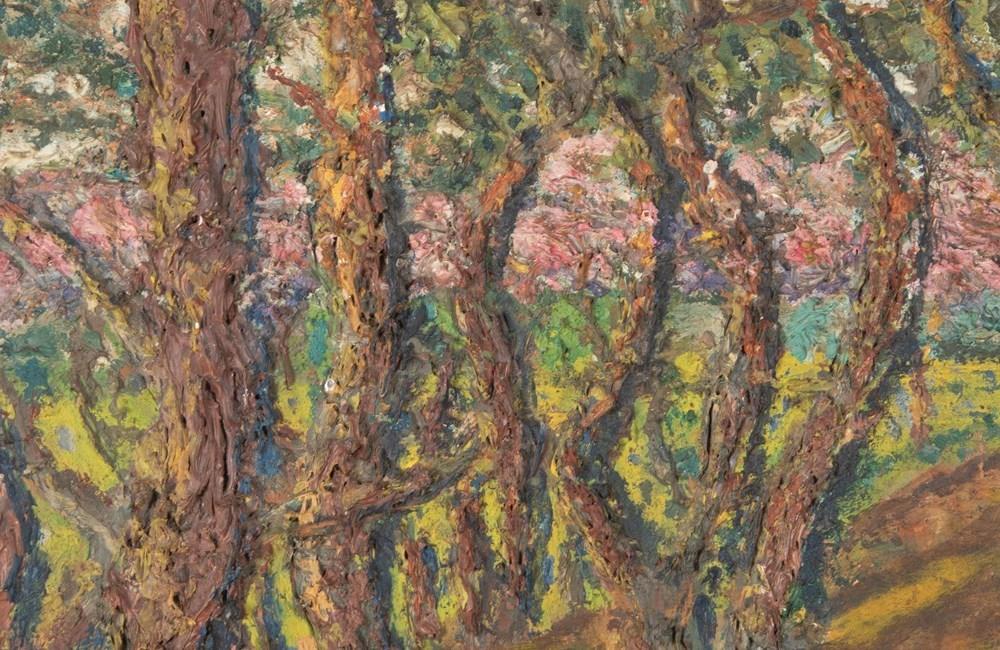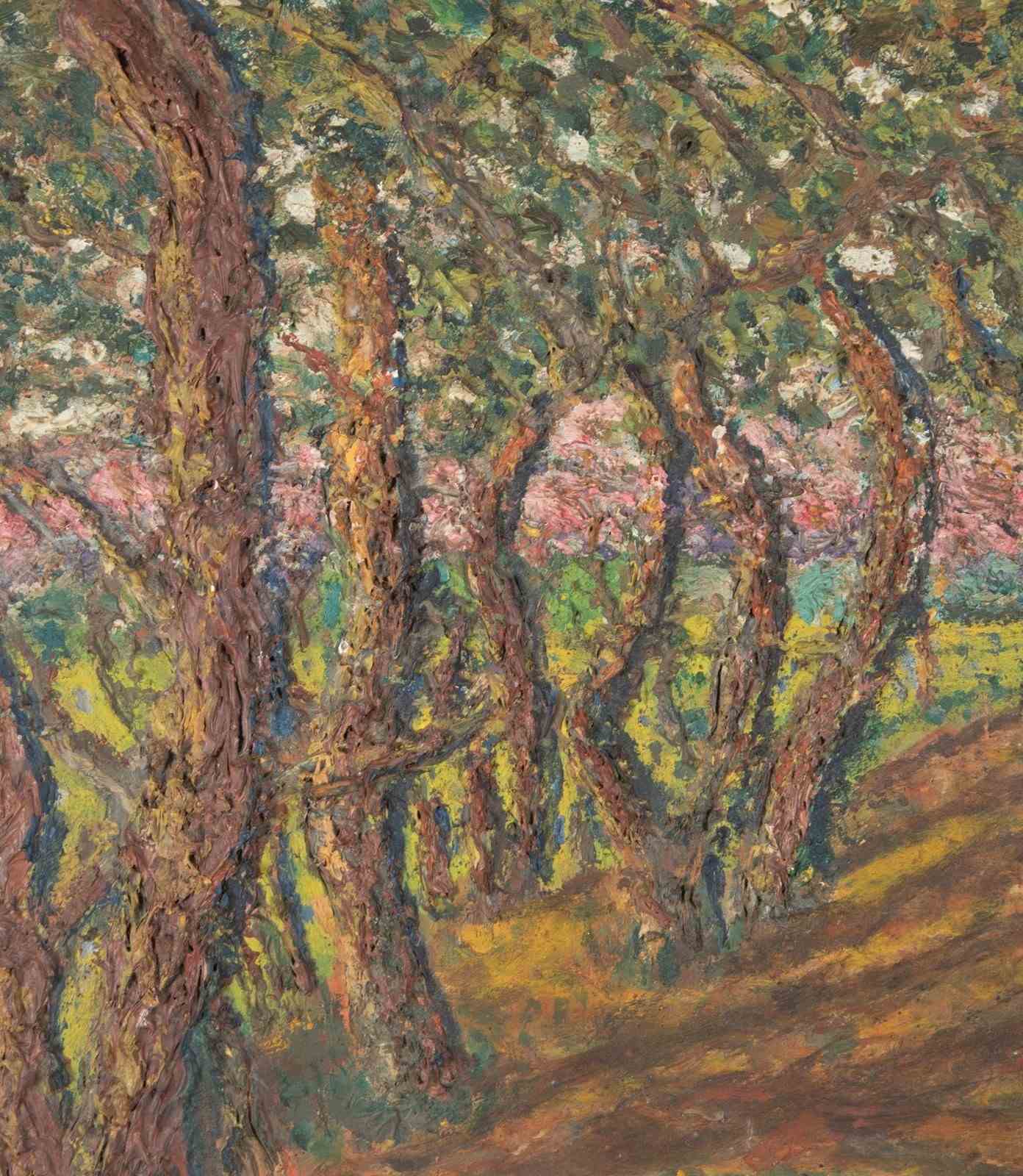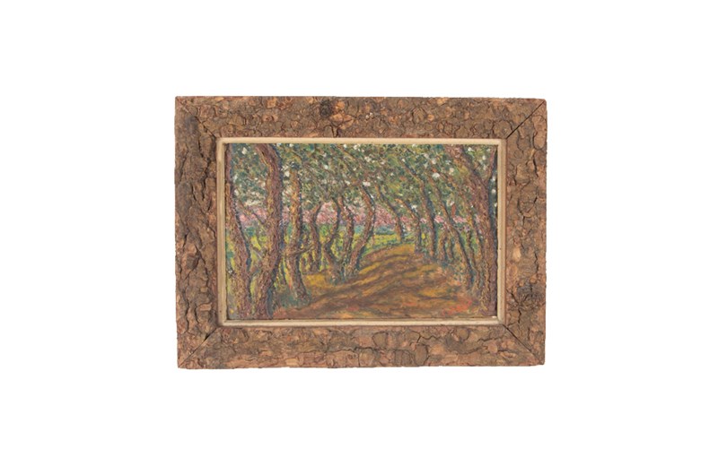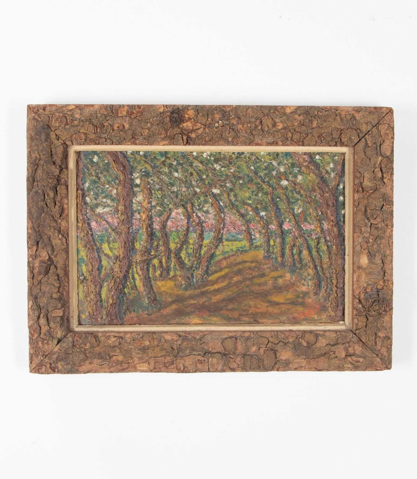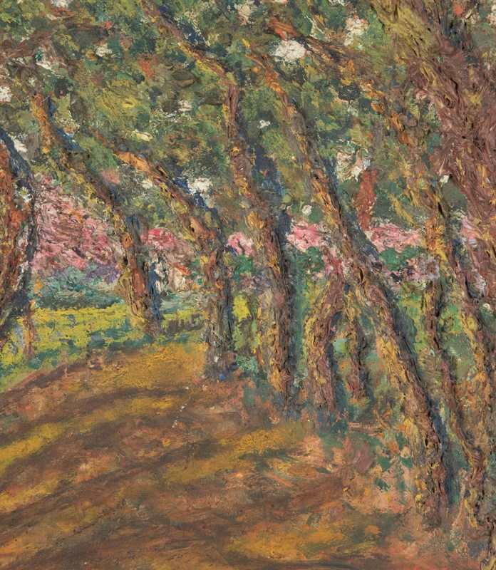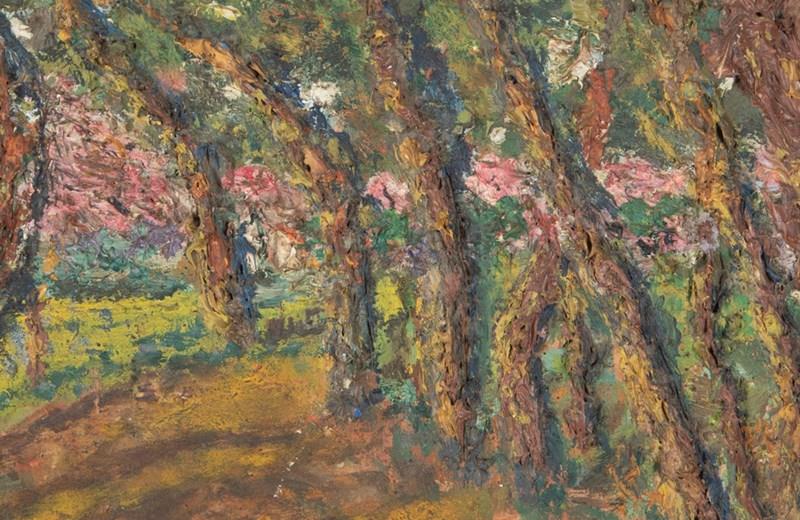 Oil on card painting of a shady forest path. Beyond are pink blossoming trees.