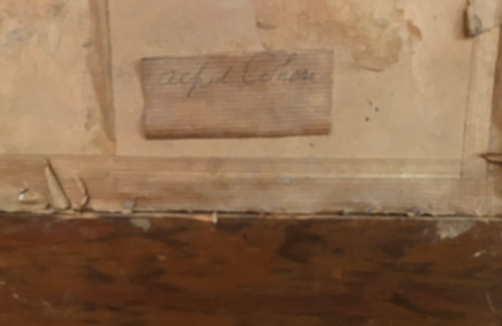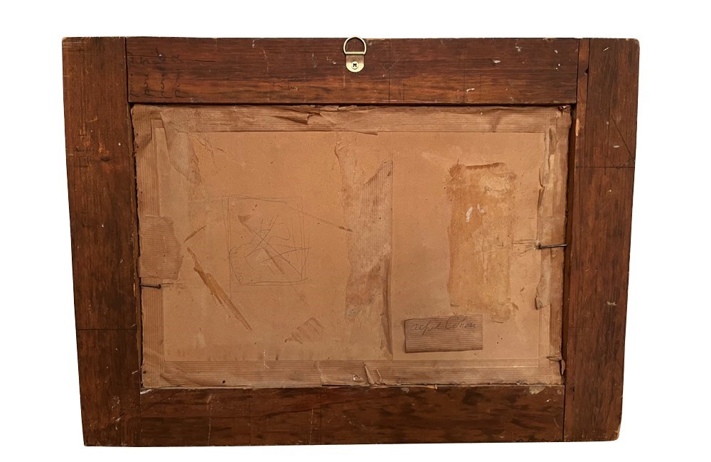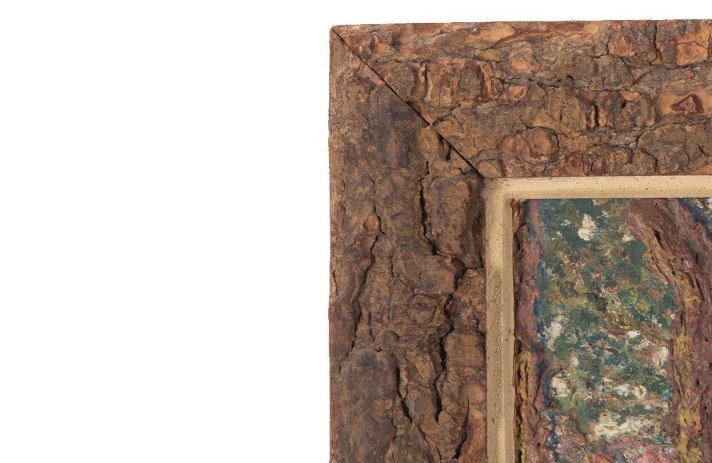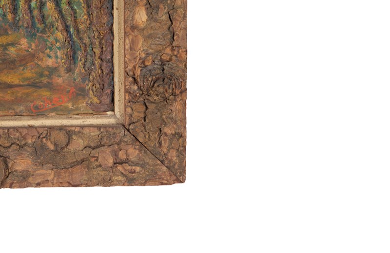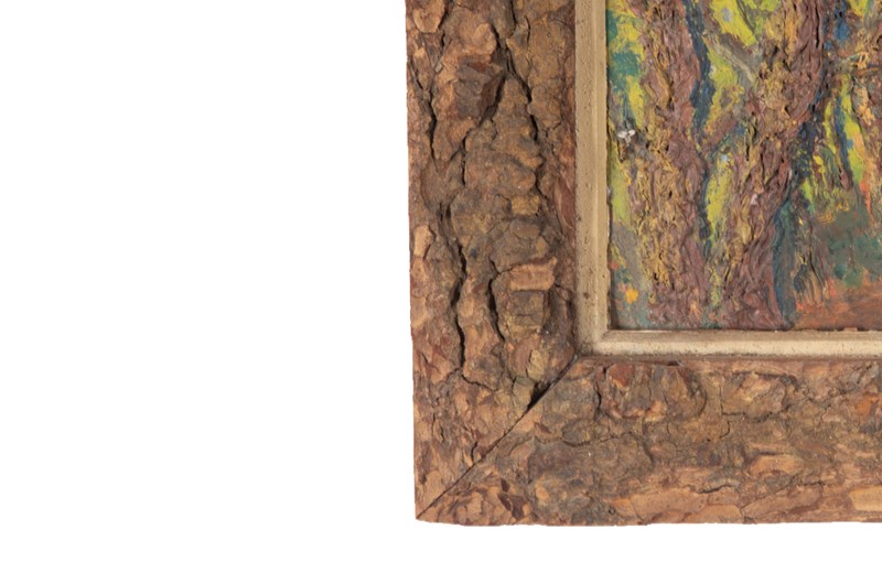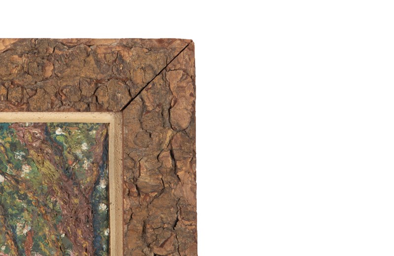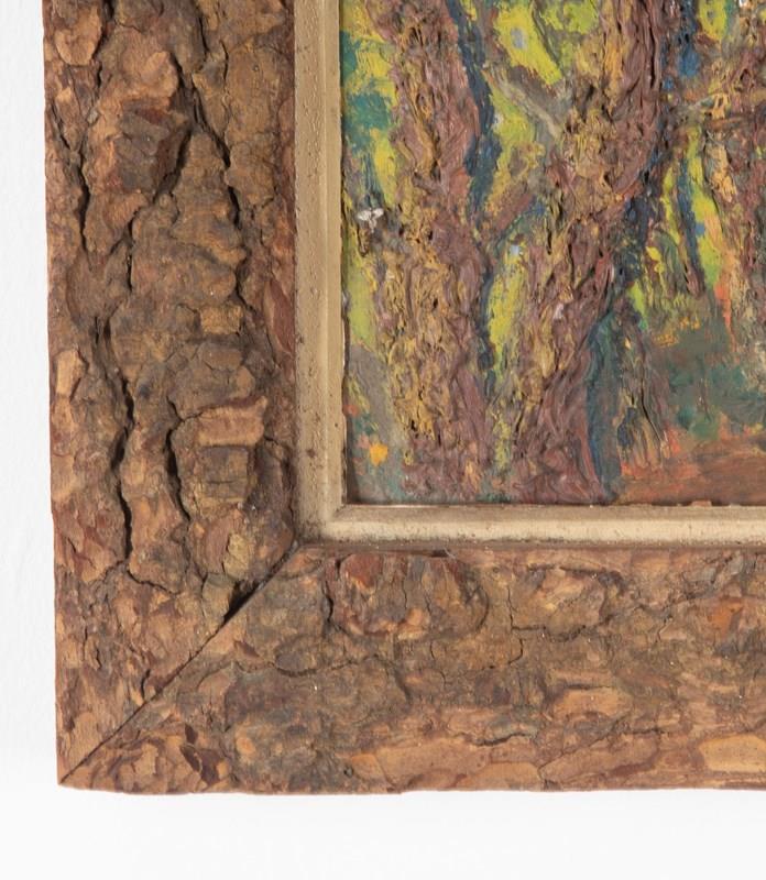 Oil on card painting of a shady forest path. Beyond are pink blossoming trees.