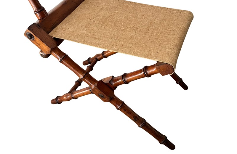 Charming little 19th Century French travel chair in faux bamboo with antique linen seat.