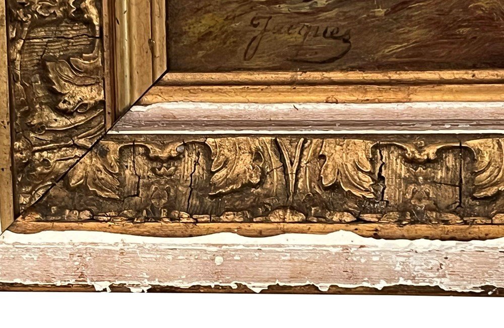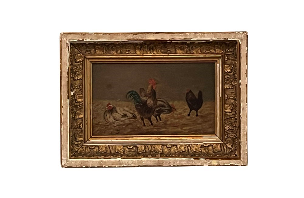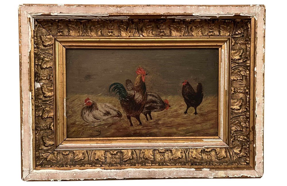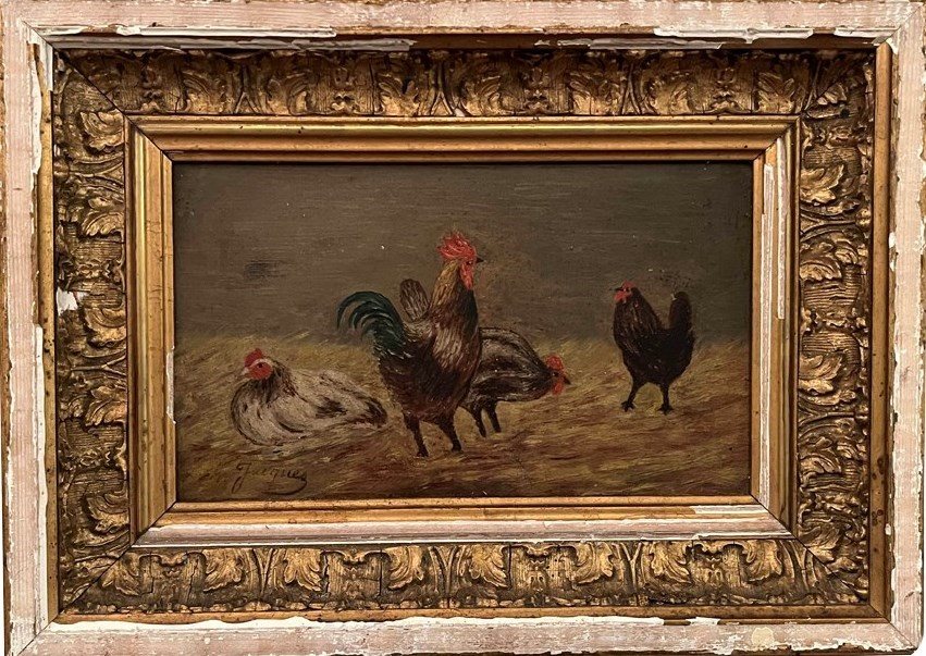 Signed Jacques to the lower left. Depicted is a rooster and three hens.