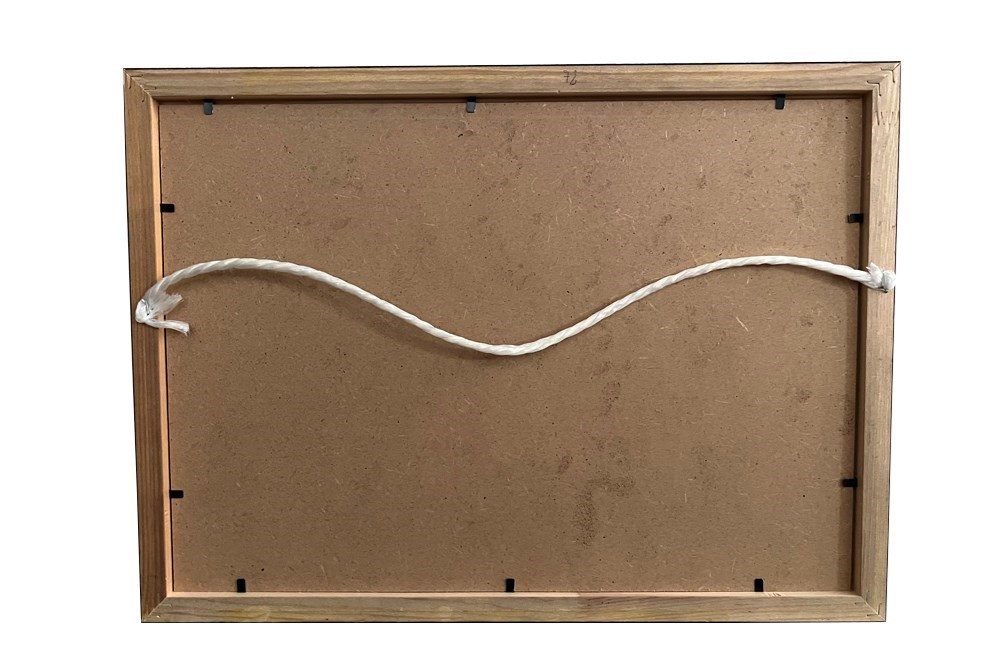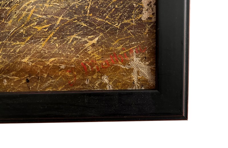 In unrestored condition, it has been framed and stabilised in a simple black wooden frame and backed with a board.
