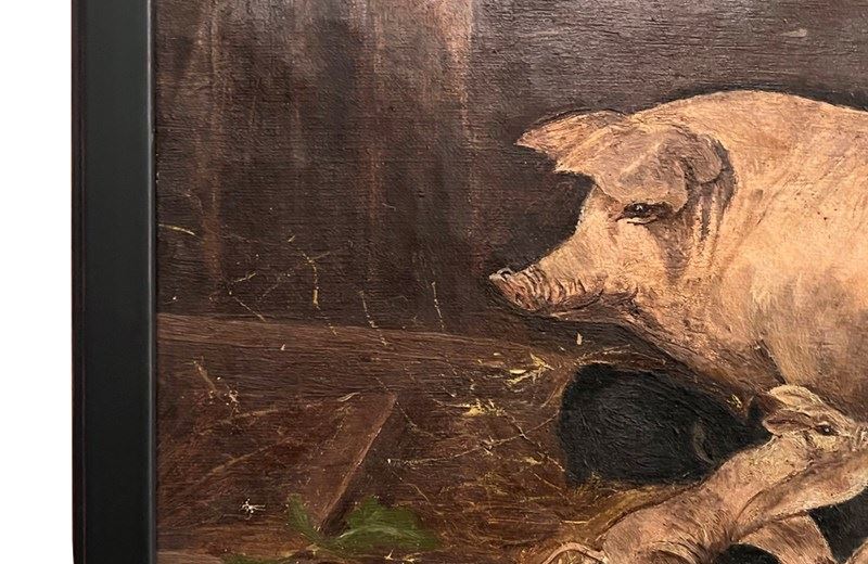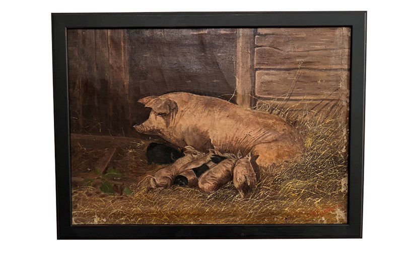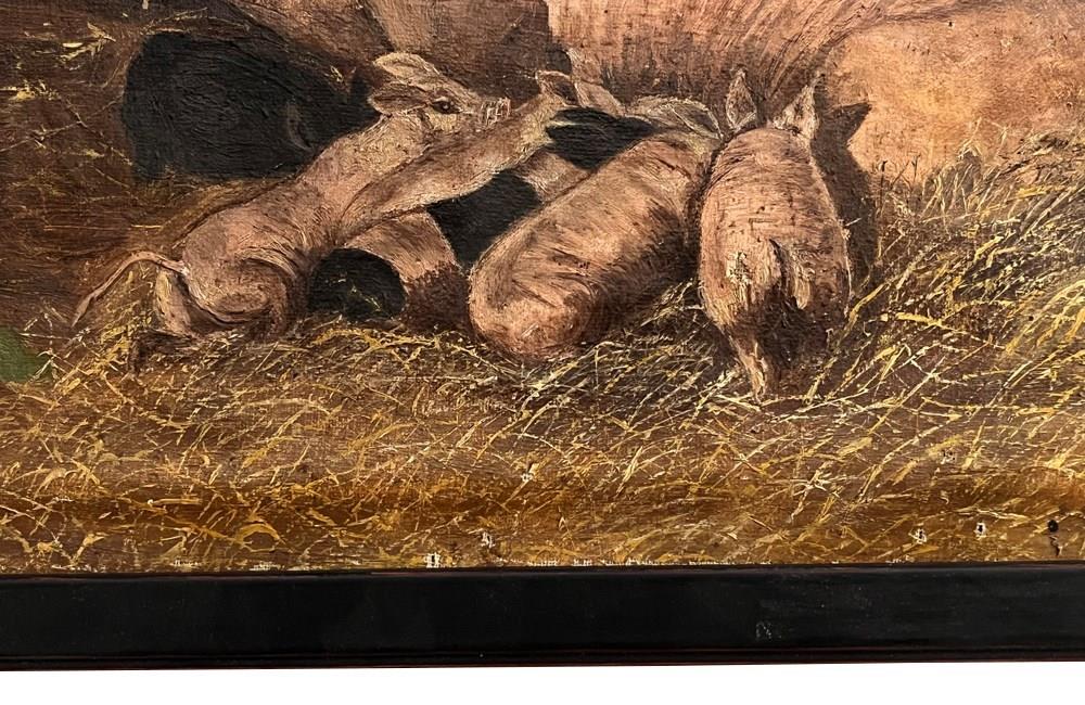 Small 19Th Century Painting 'Sow & Six Piglets'