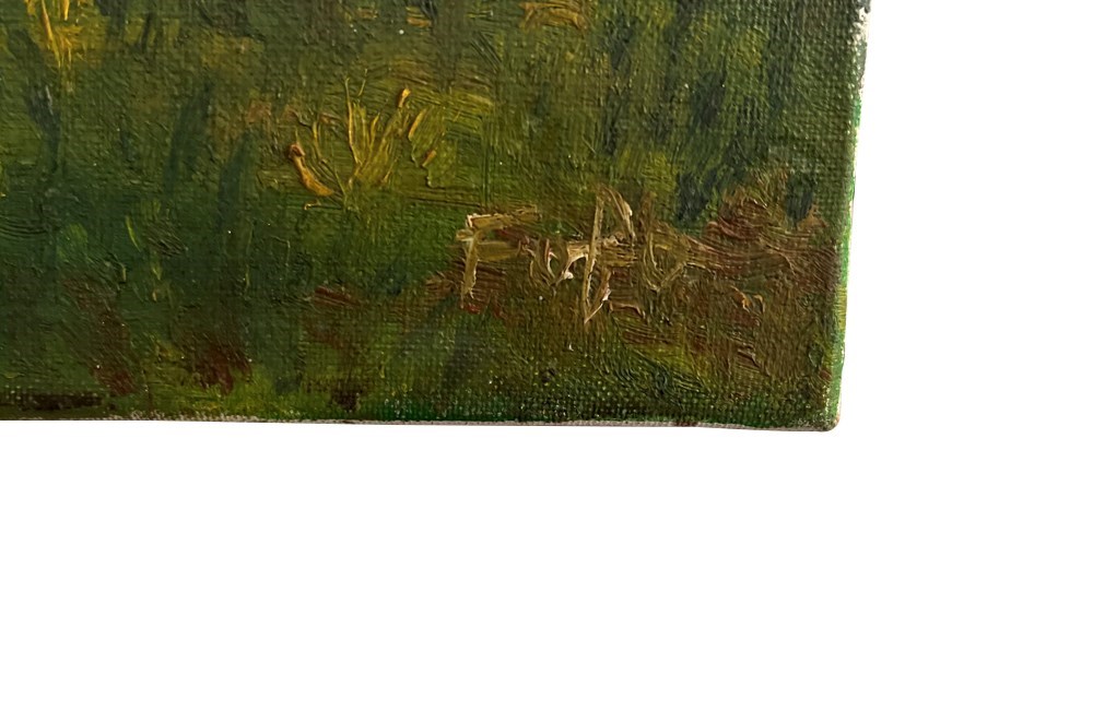 Depicted is a farming couple, sitting under a large shepherds parasol with their small herd of cattle.