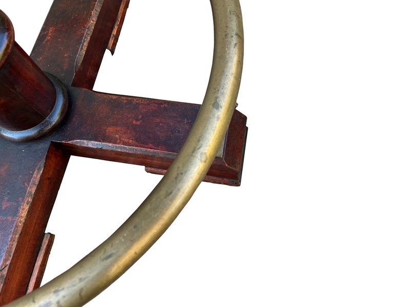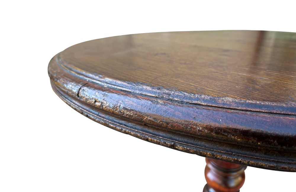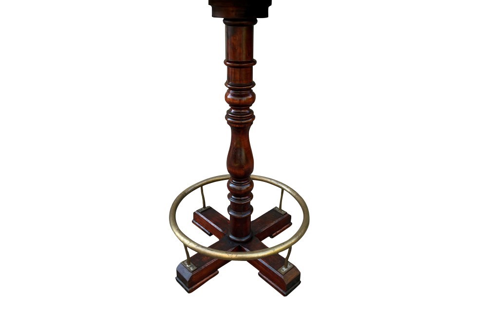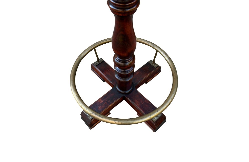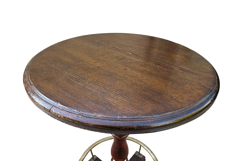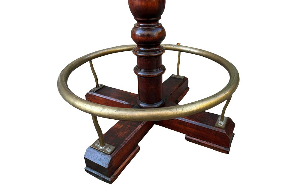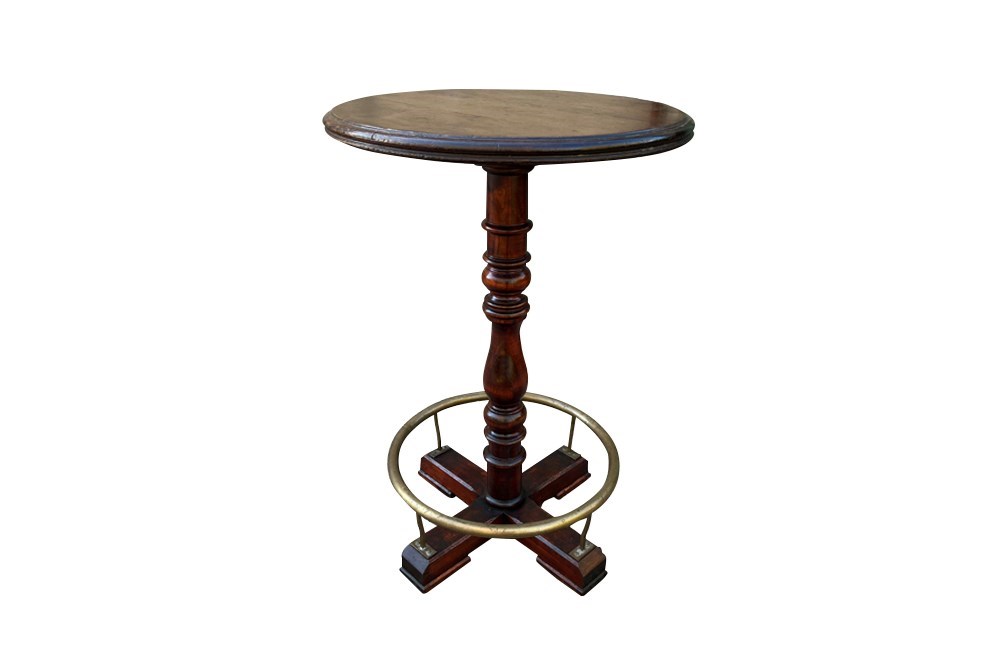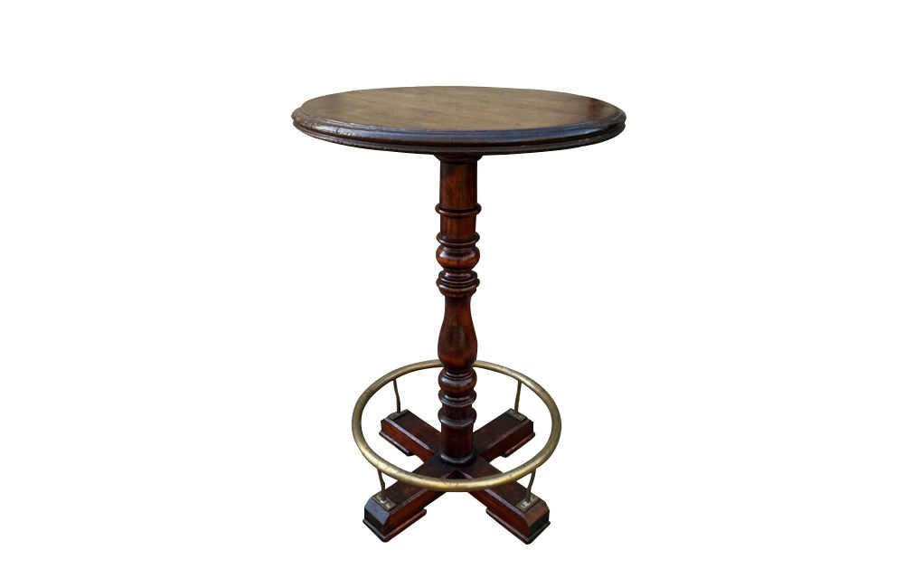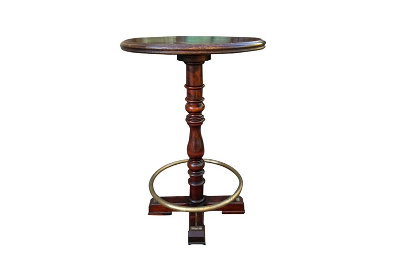 Stylish, French high bistro table. It dates to the early 20th century and has an oak top, mahogany base and brass foot rest ring.
