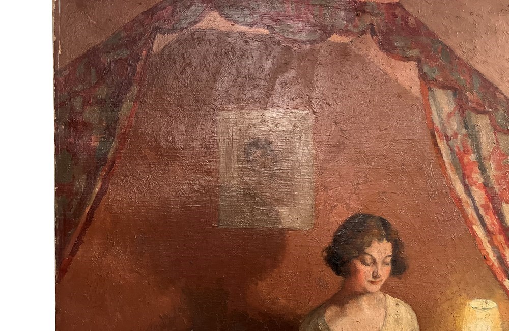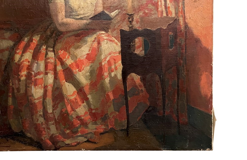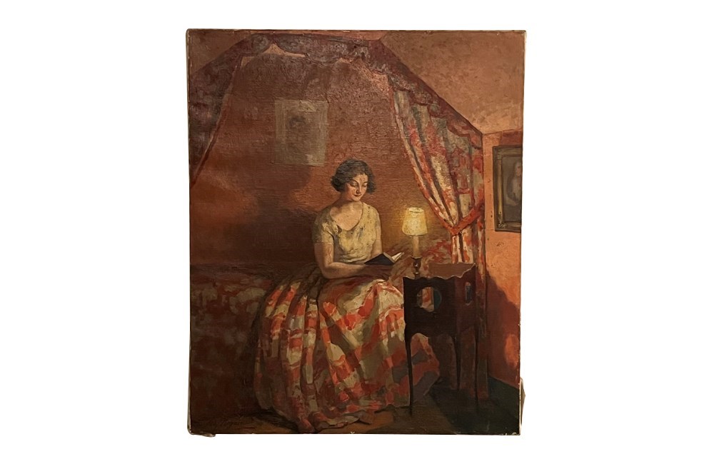 Beautiful, oil on canvas portrait of a woman reading. In a full skirt, she sits, book in hand, serenely reading on a canopied bed.