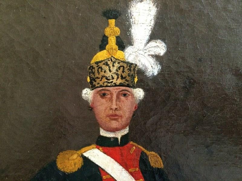 Late 18th Century oil painting of a French Colonel of the' Dragons' Regiment In naive style the plumed officer poses for the unnamed srtist who may have been a soldier in the regiment.