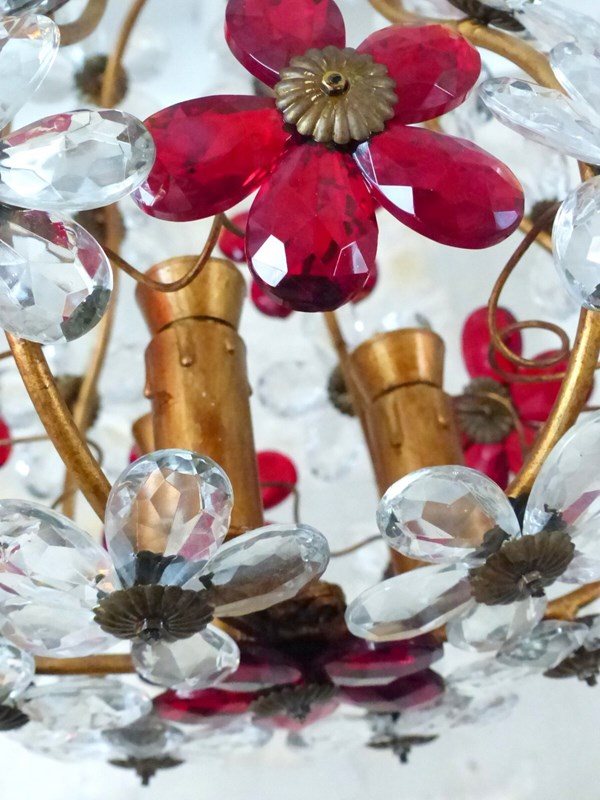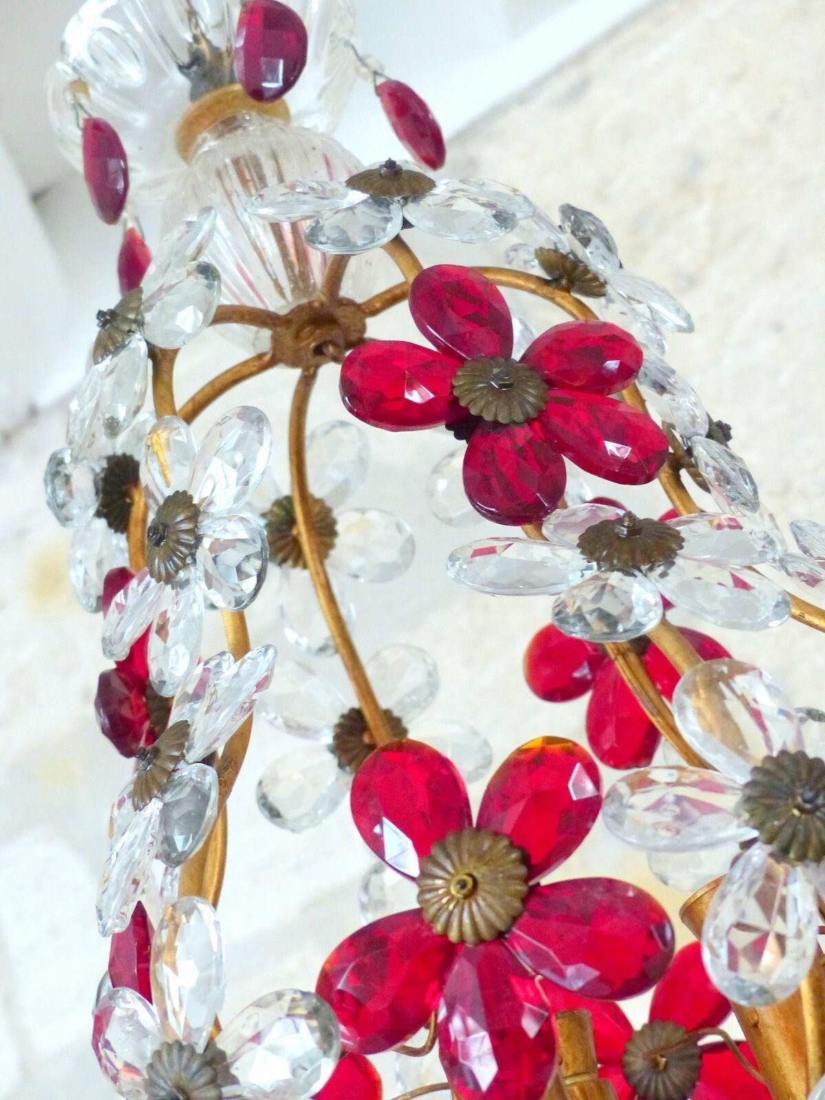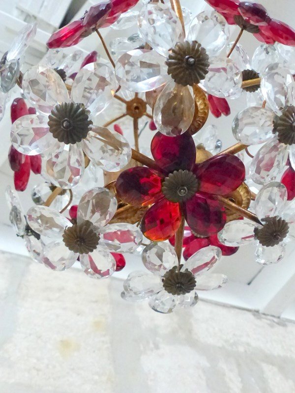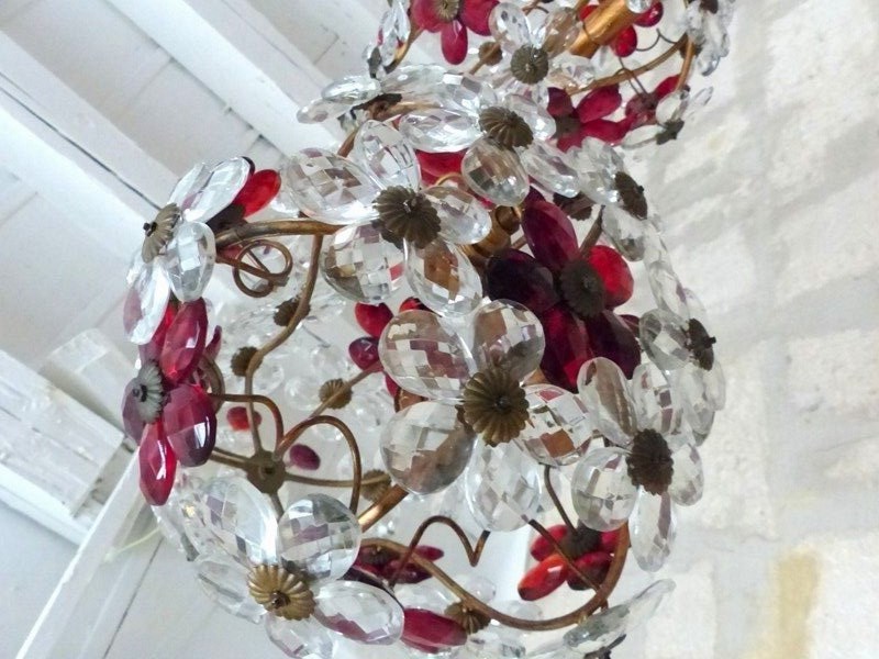 Very attractive Pair of Hanging Chandeliers of Giant Teardrop shape with '5 Leaf Clover' Prisms in red and clear glass..