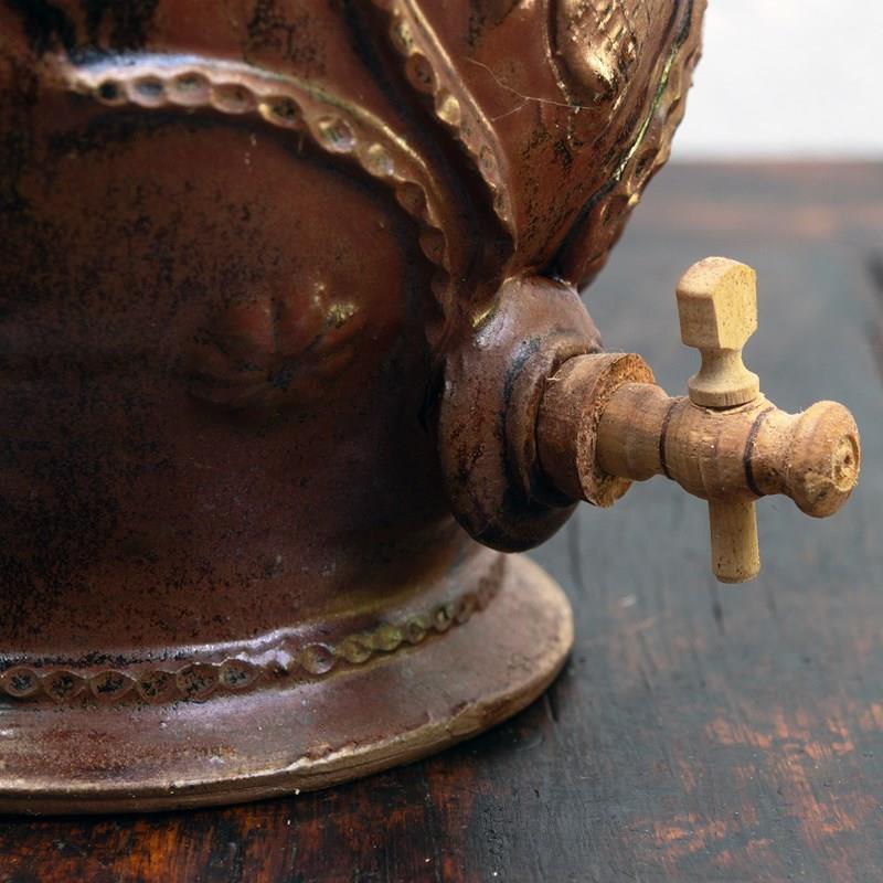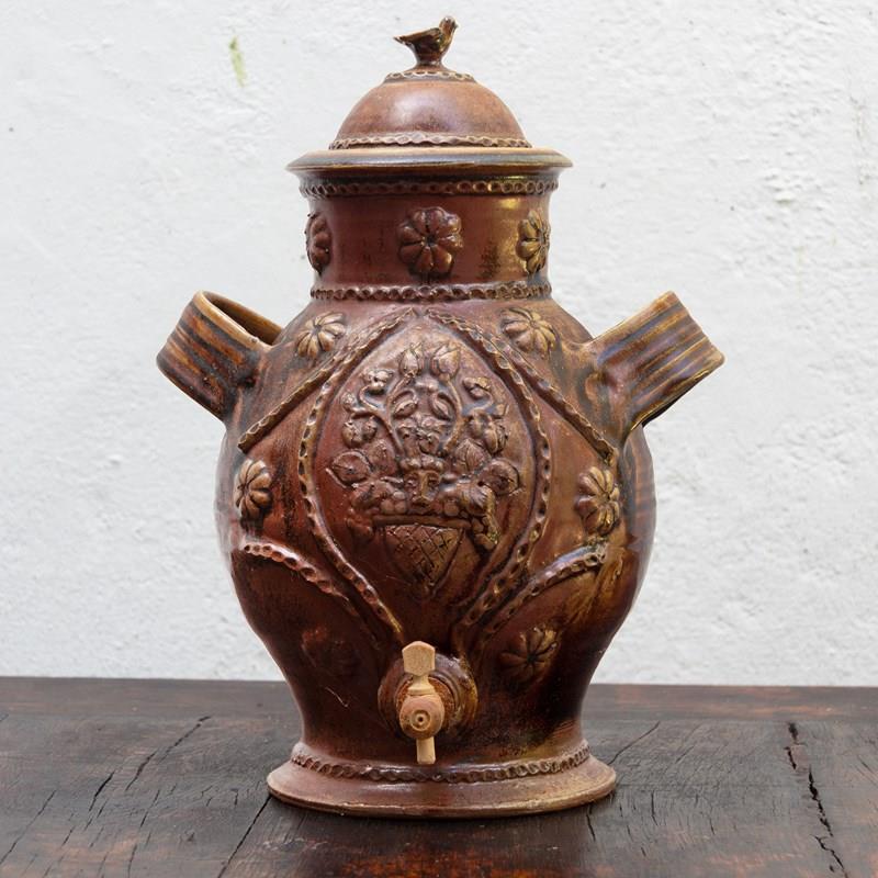 With removable lid surmounted by a dove, and wooden spigot,.