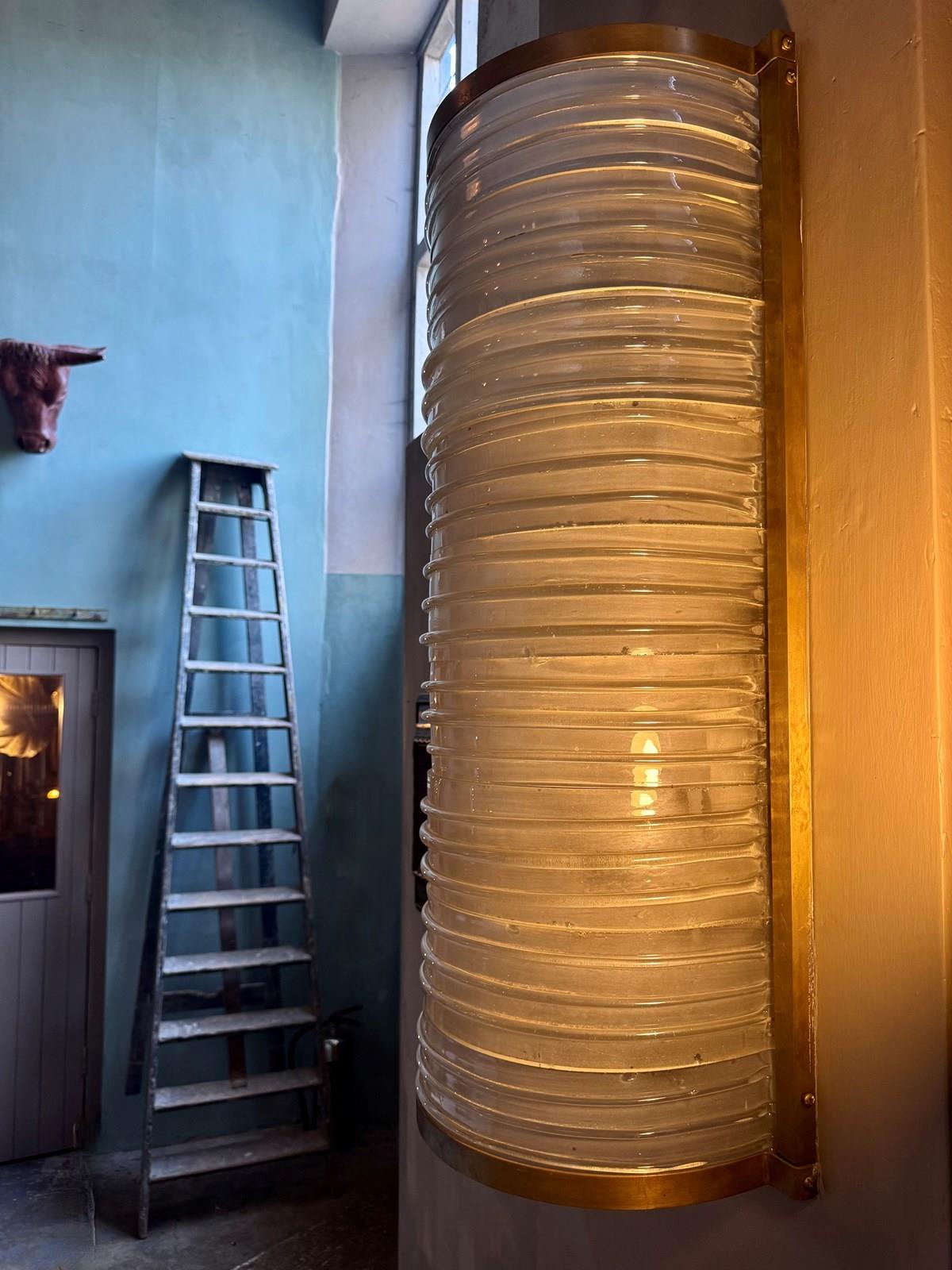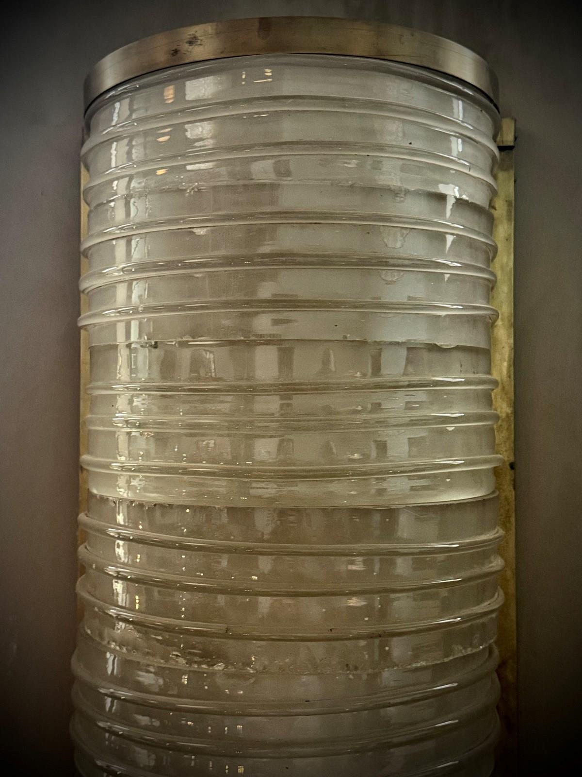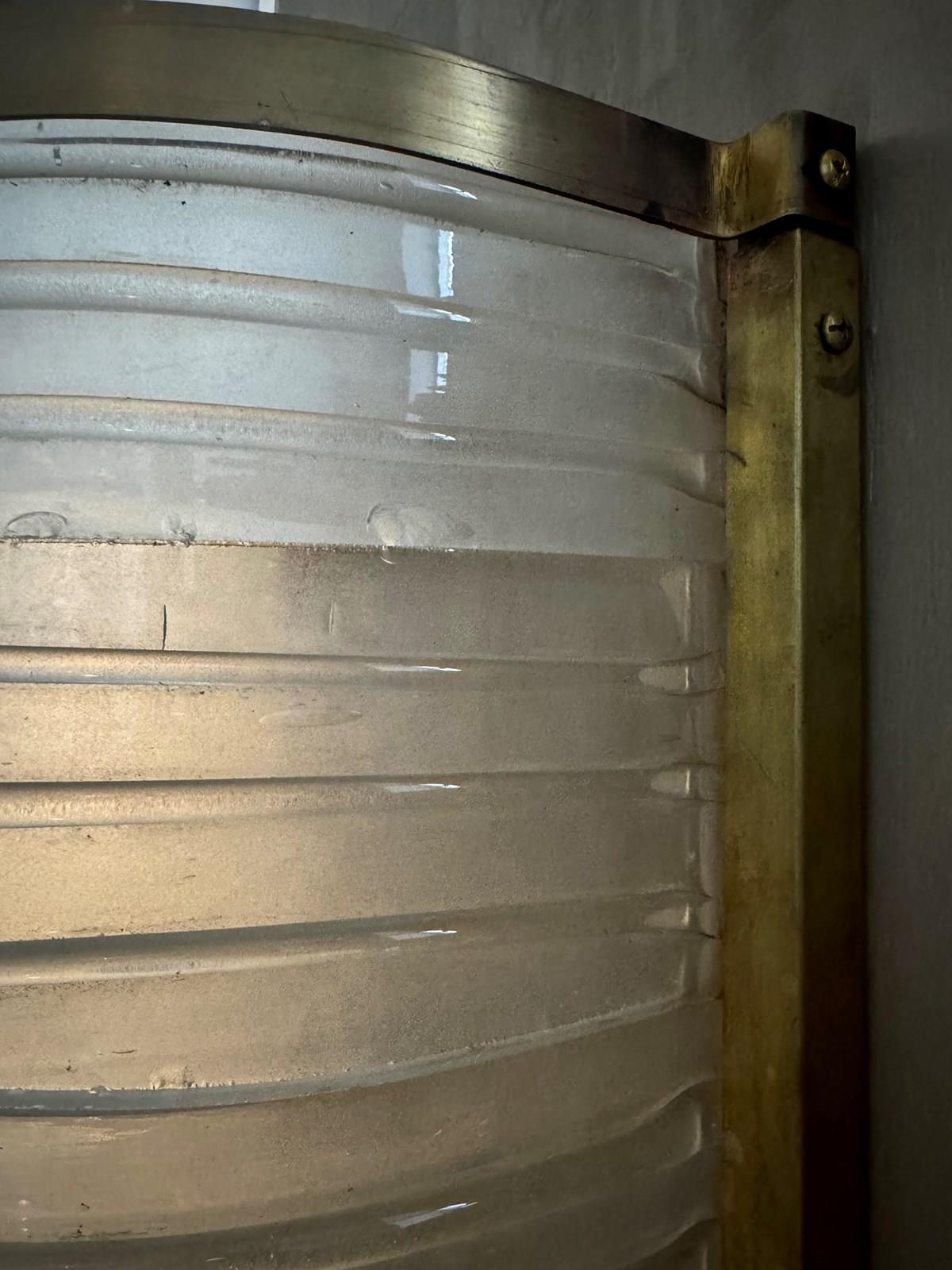 Rare and large scale pair of exceptional brass and opaque hand blown glass cinema lights, circa 1960, Italy.