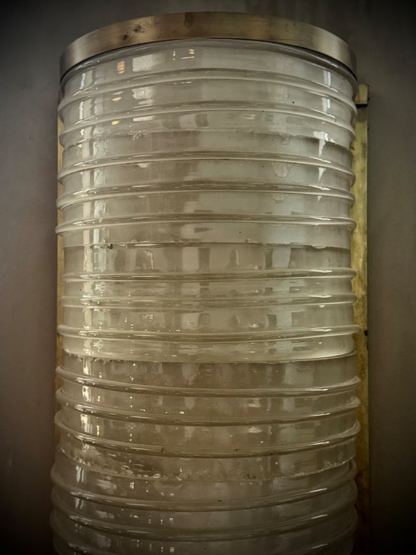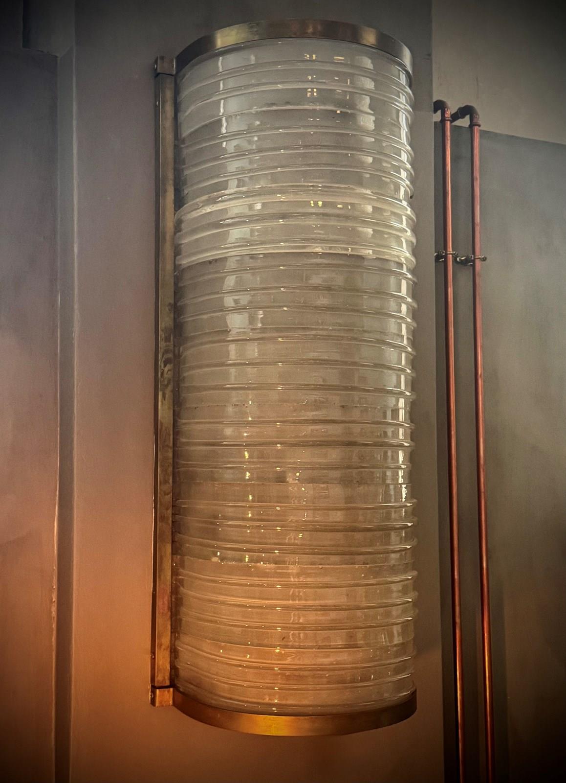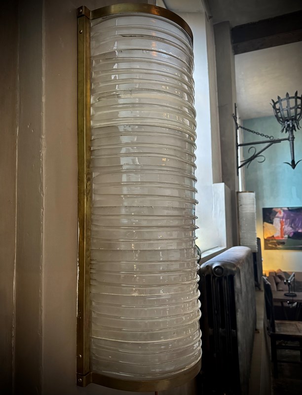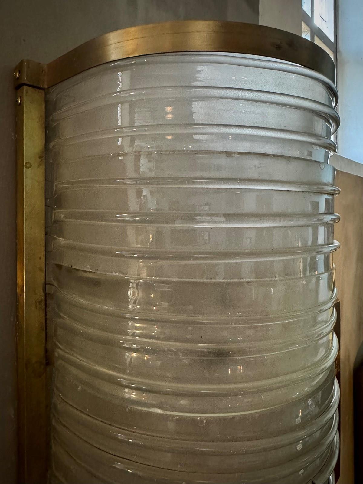Rare and large scale pair of exceptional brass and opaque hand blown glass cinema lights, circa 1960, Italy.
