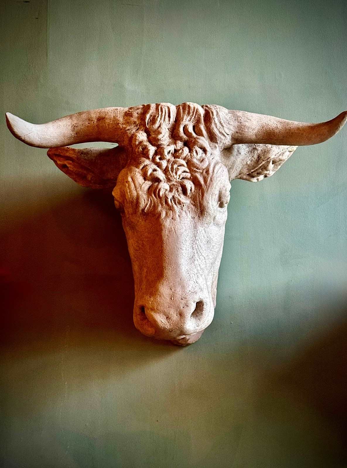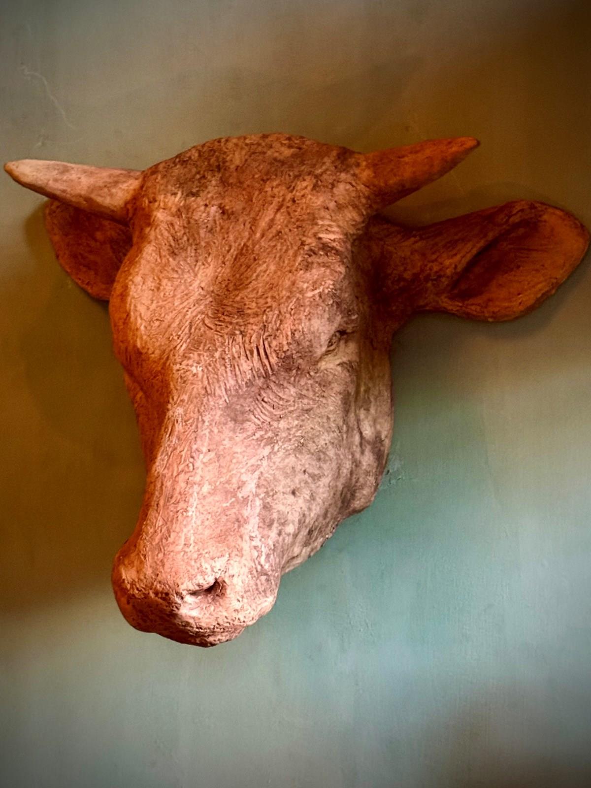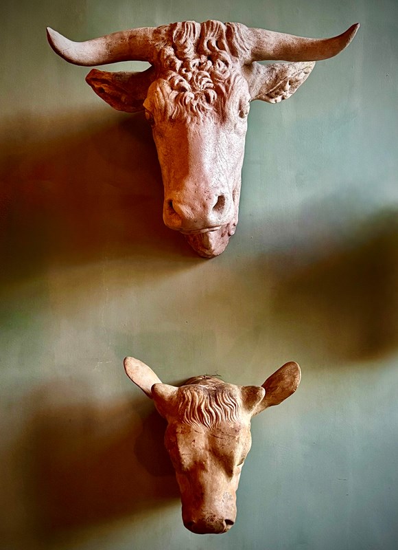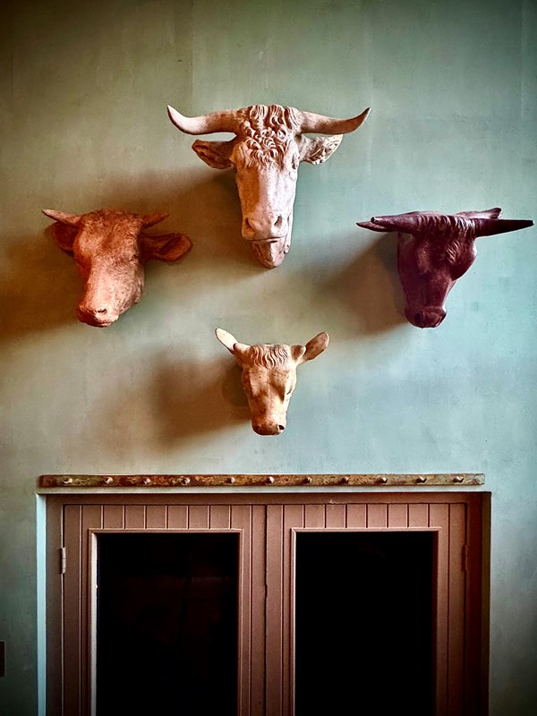 A great collection of 4 19th century terracotta bull's heads used as exterior butcher (boucherie) shop signage, France.