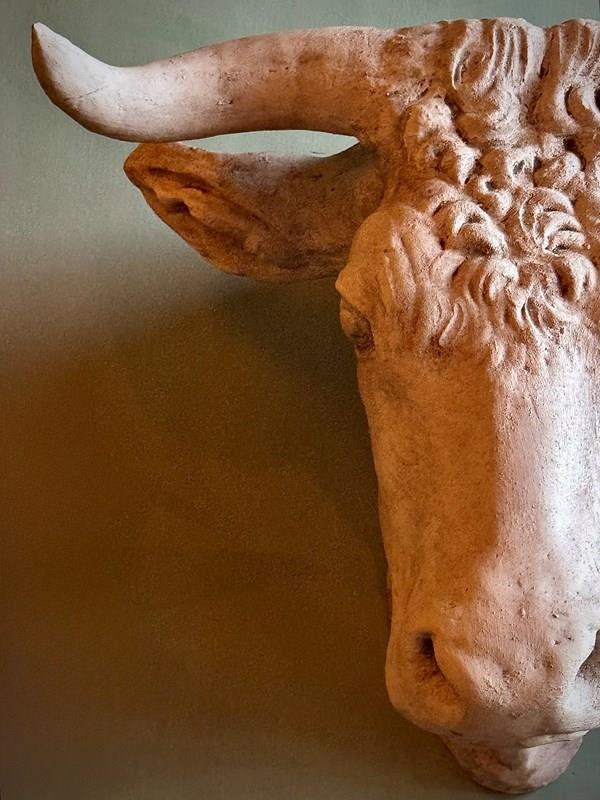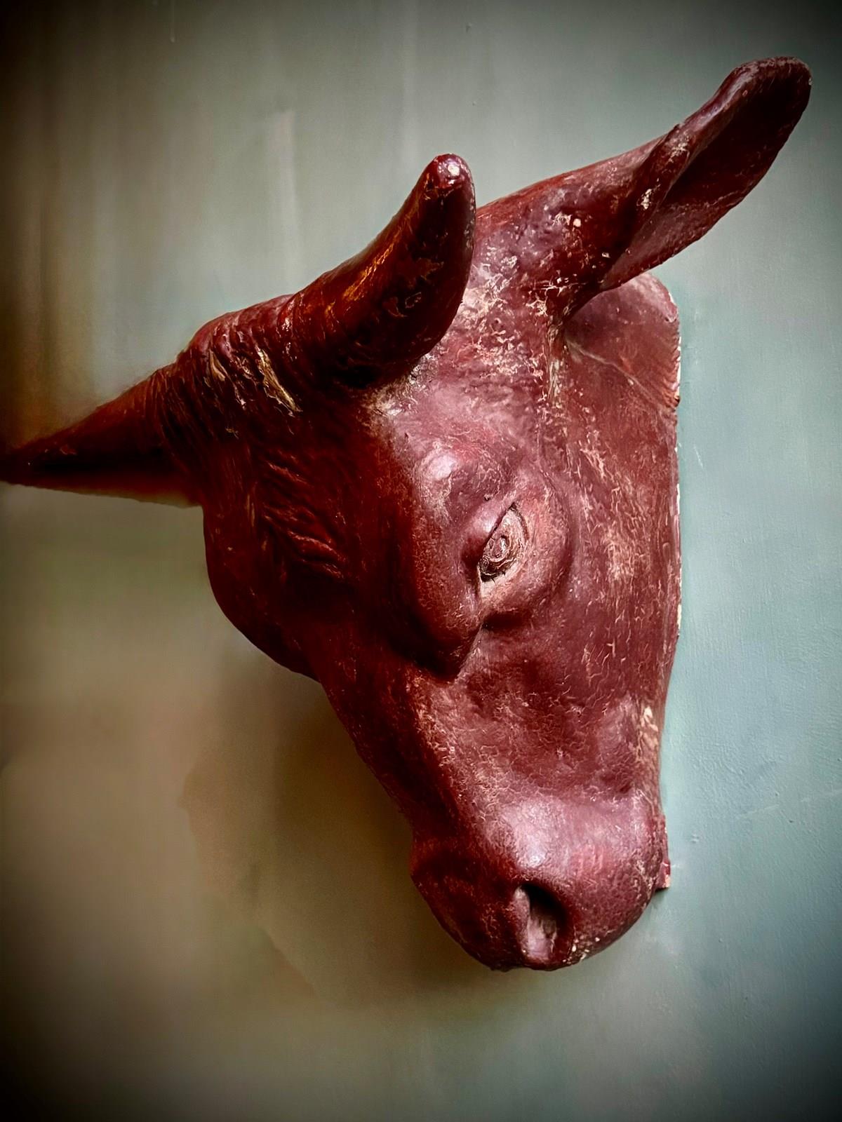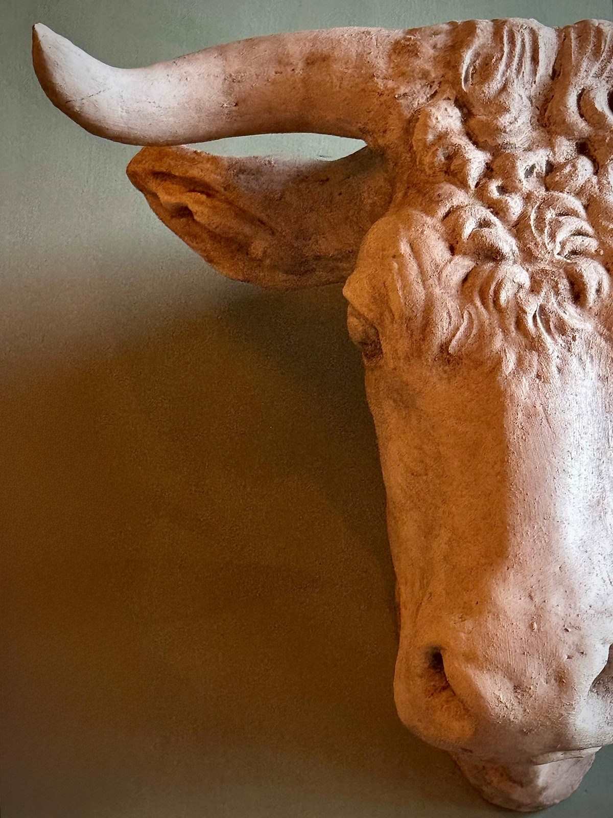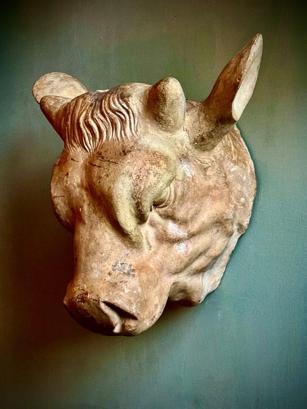 A great collection of 4 19th century terracotta bull's heads used as exterior butcher (boucherie) shop signage, France.