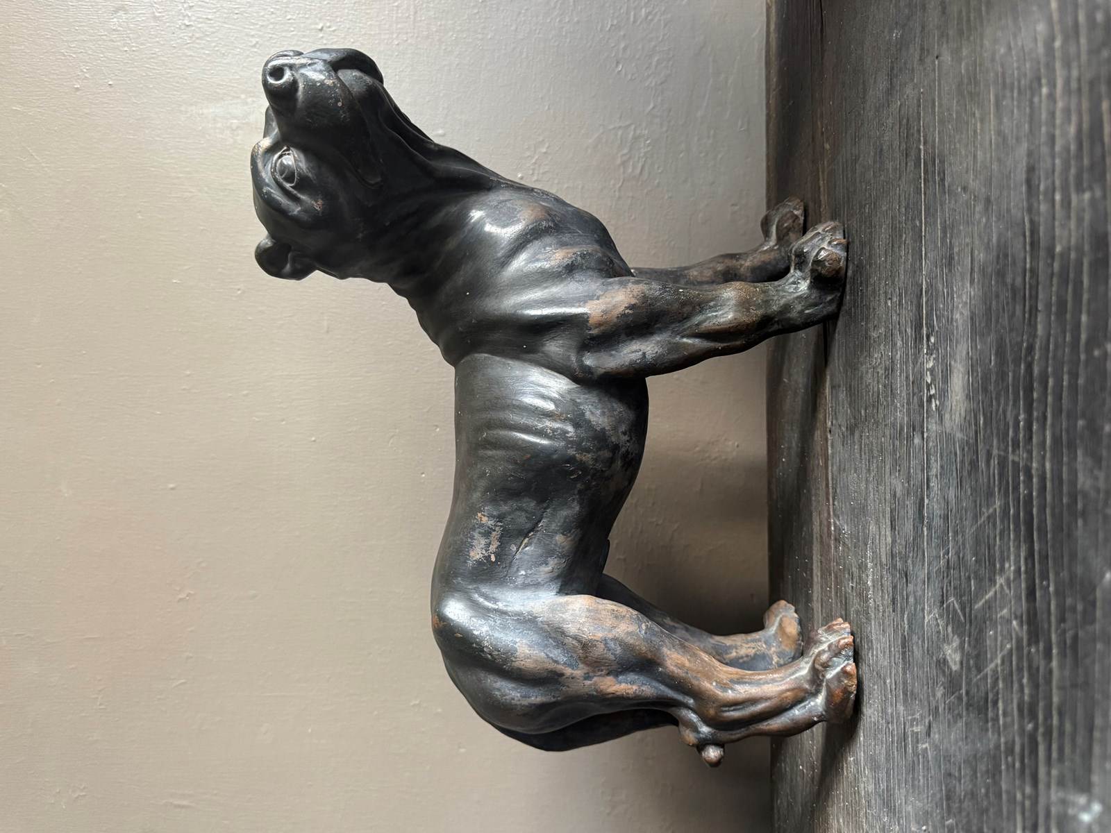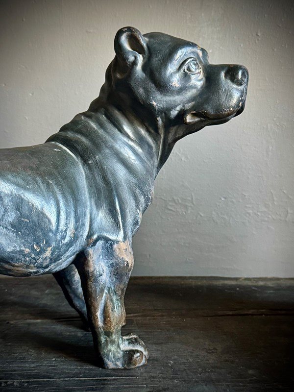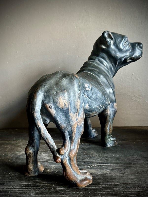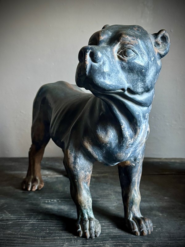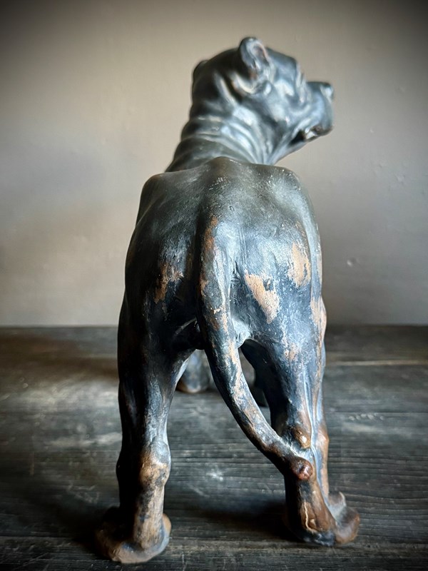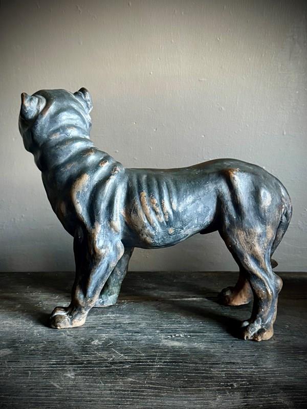 An early compact and muscular cast terracotta 'cane corso' hunting dog, with dark weathered patina and warm abrasions revealing its age and hand modelled character; late 18th century, Italy.