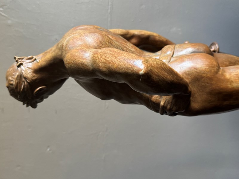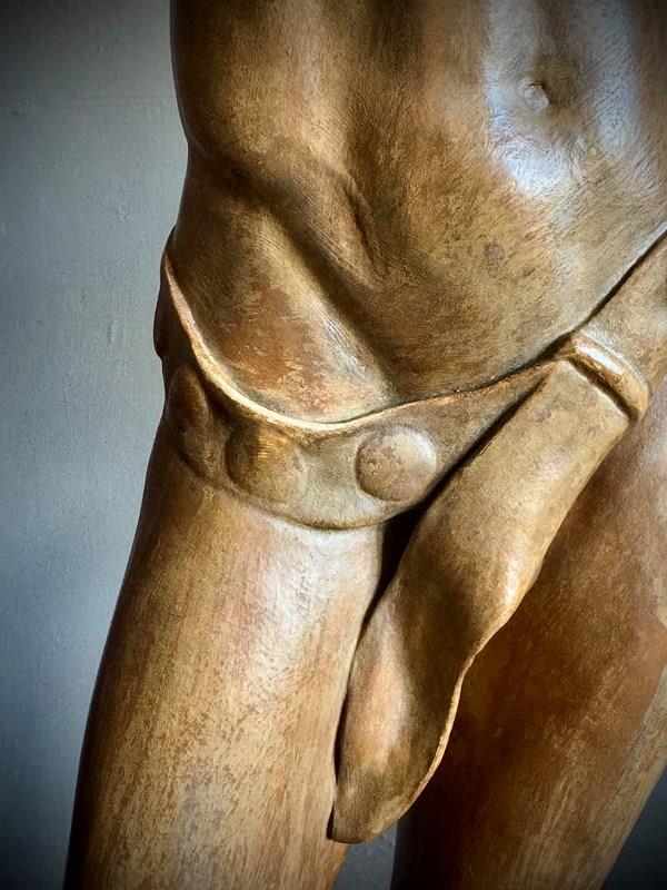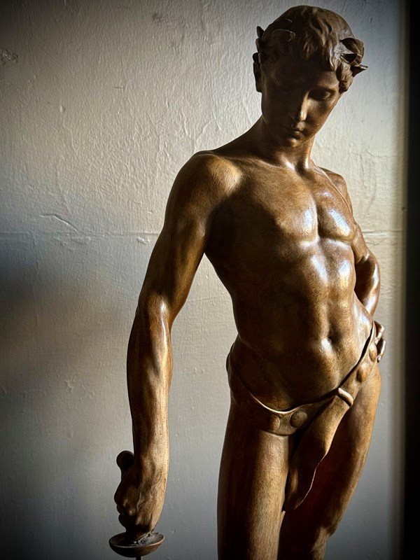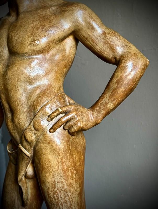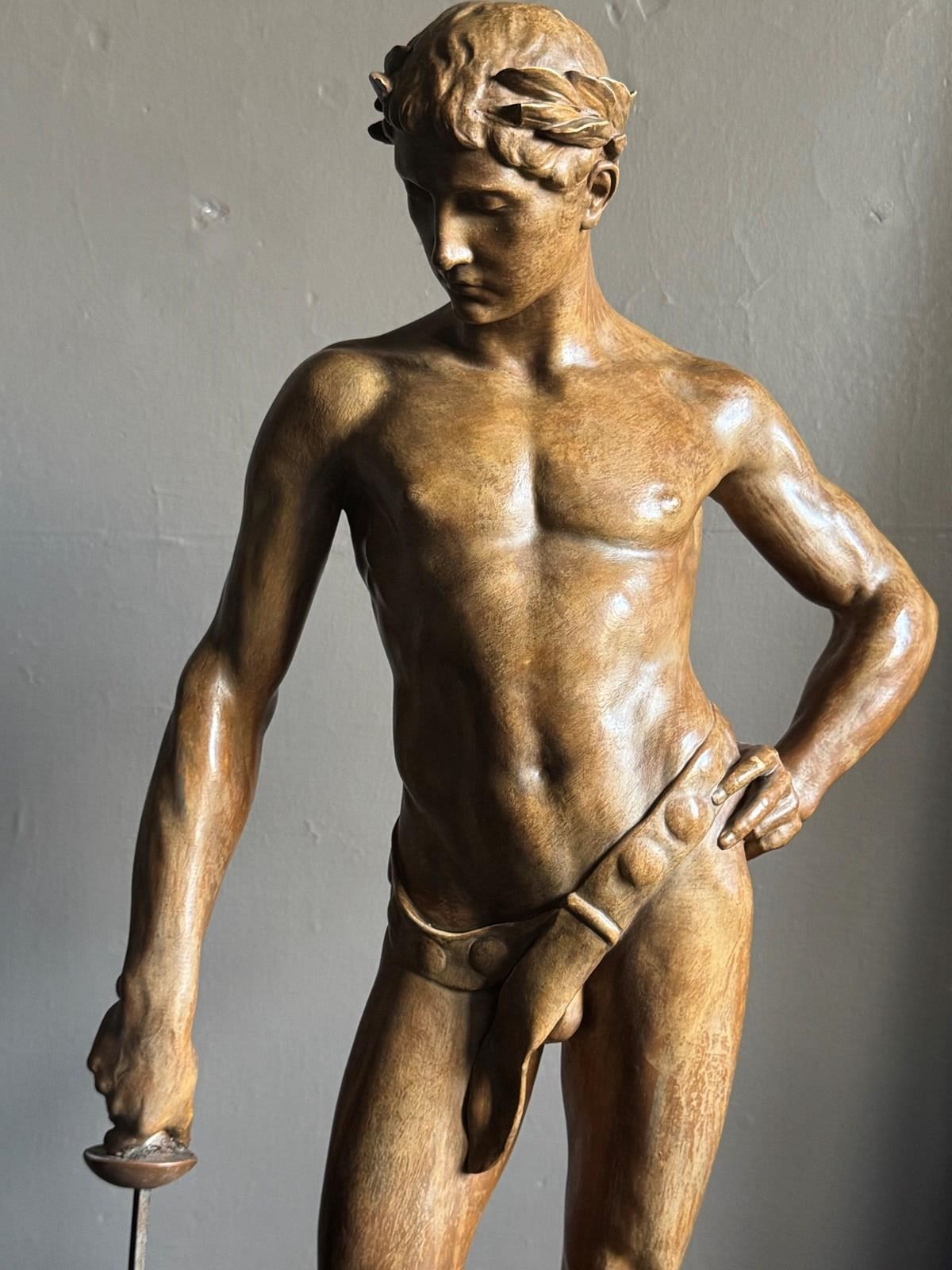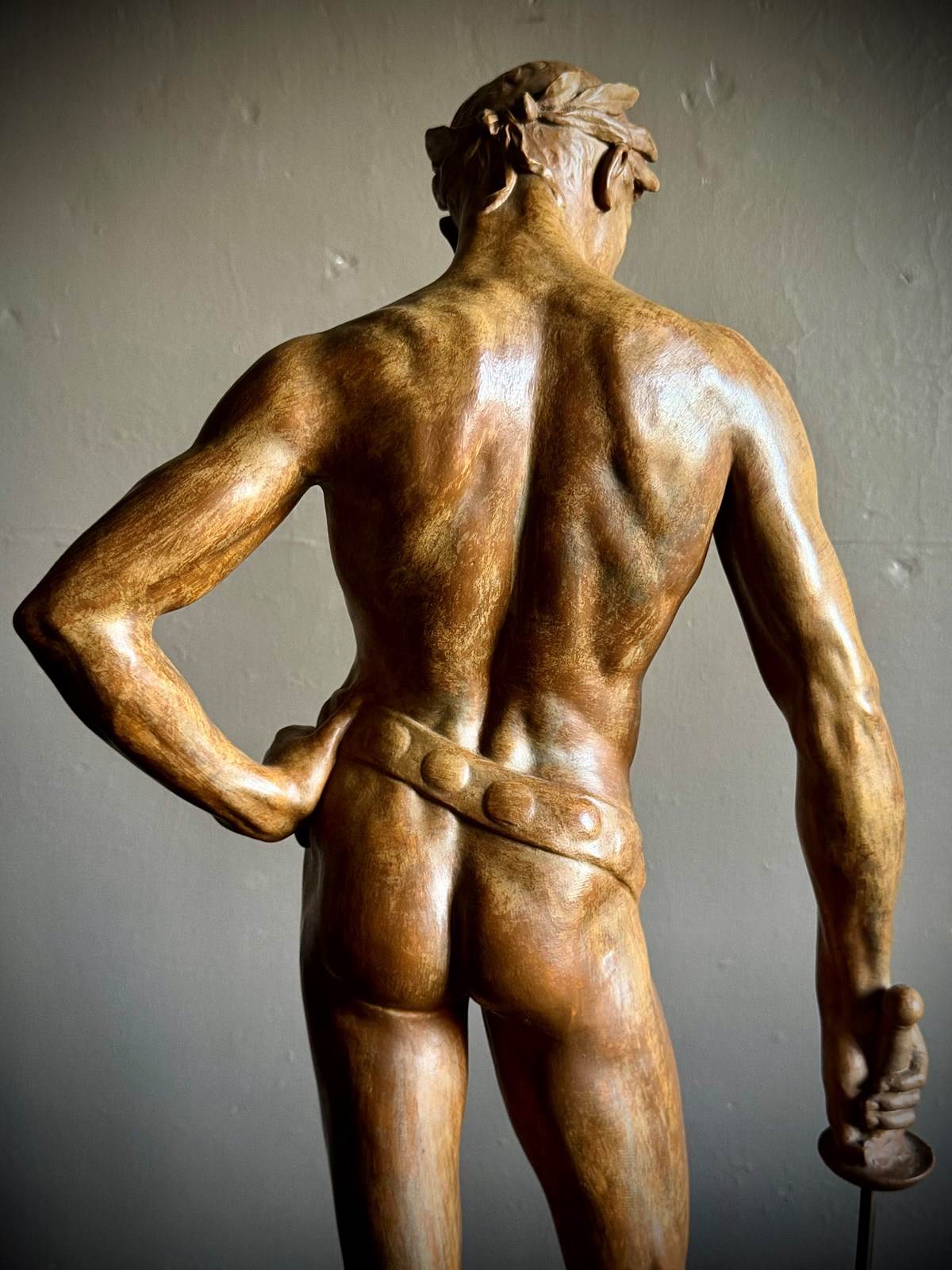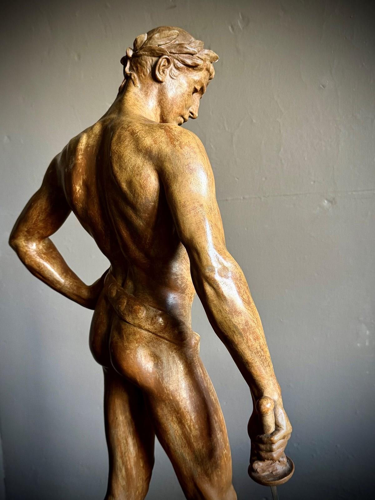 A cast terracotta figure of a fencer, 'Il Vincatore'; the wreath he wears symbolising his victory and the sculpture and modelling depicting physical perfection from every angle, circa 1920, Italy