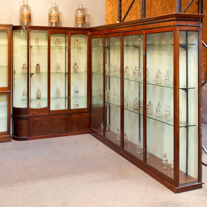 Edwardian L shaped Jeweller's cabinet froma shop in the North of England. Full length glazed doors to one side, and bow ended glass to the other.