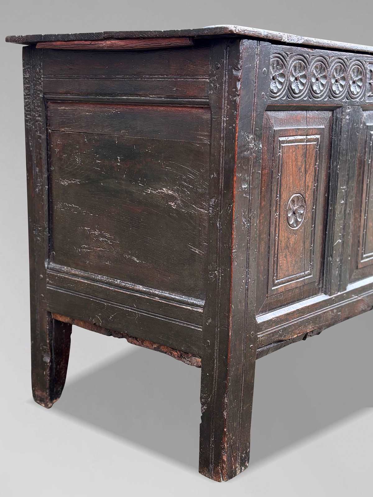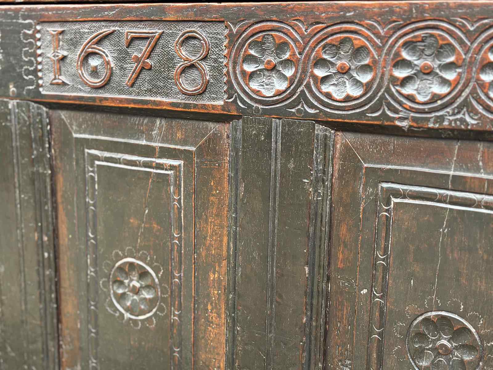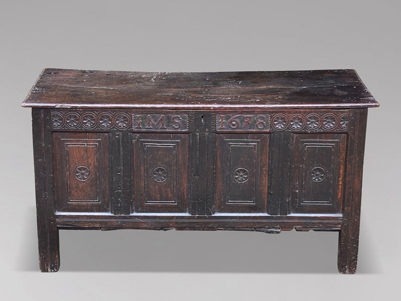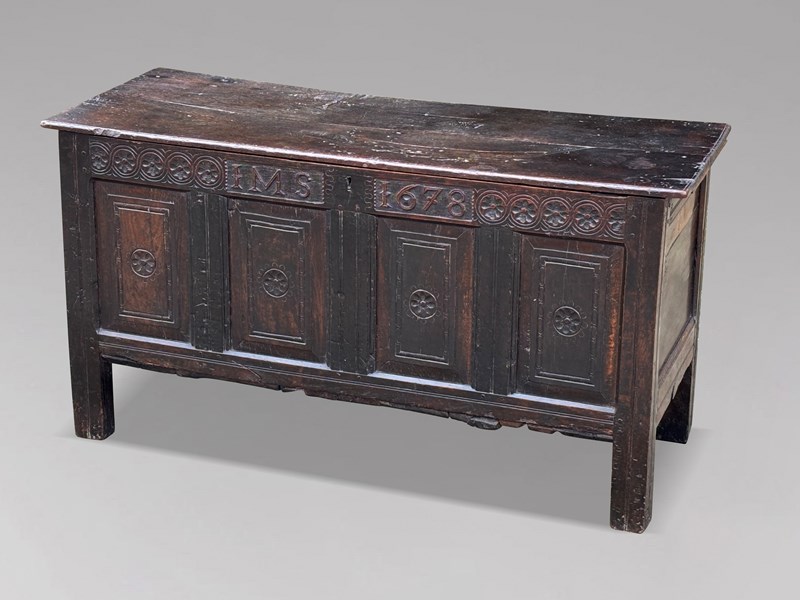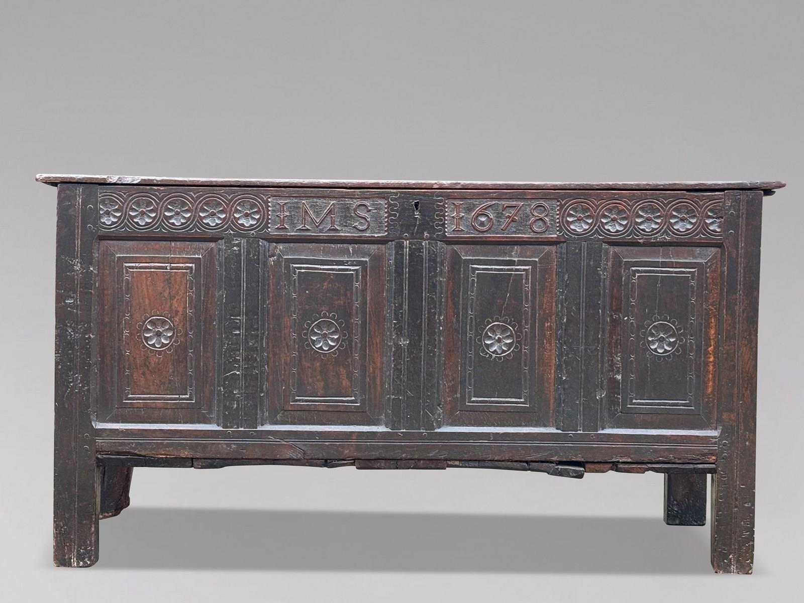 The coffer retains its original hinged lid with large iron strap hinges, above a finely worked four-panel front. Each panel is carved with a petal flowerhead roundel, while the top rail is decorated with a guilloche border enclosing various flower heads, and bears the inscription “IMS 1678”. The whole stands on slender, run-moulded extended stile supports, integral to the construction.