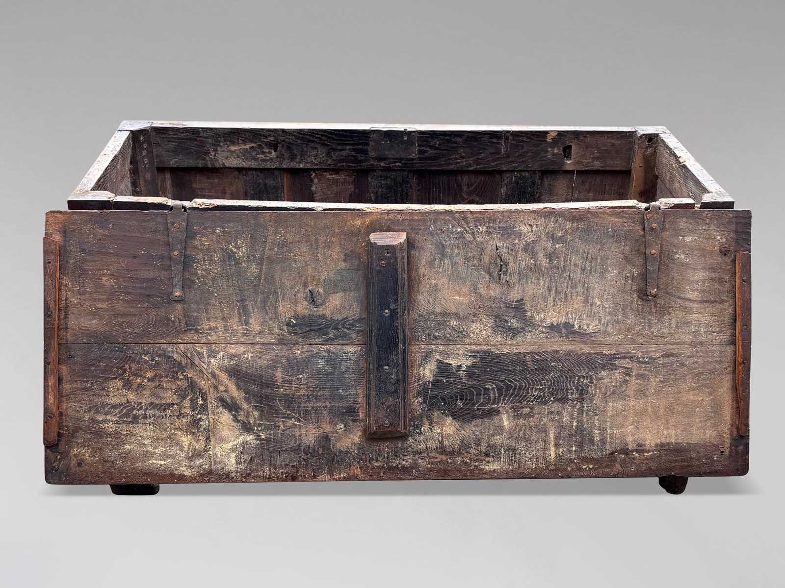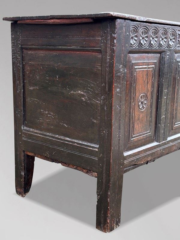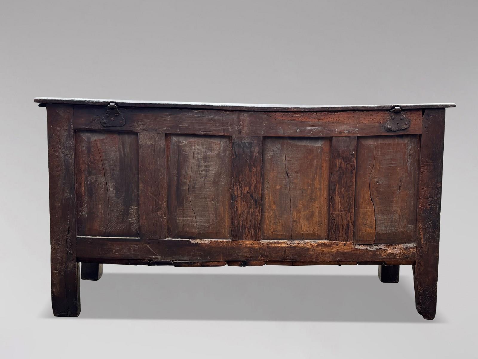 Large and impressive, with a rich, deep colour and superb surface, this 17th-century oak coffer is both highly decorative and functional. It would make a striking focal point in a hallway, living room or at the foot of a bed, and is a lovely, authentic piece for collectors of early oak and period country furniture.