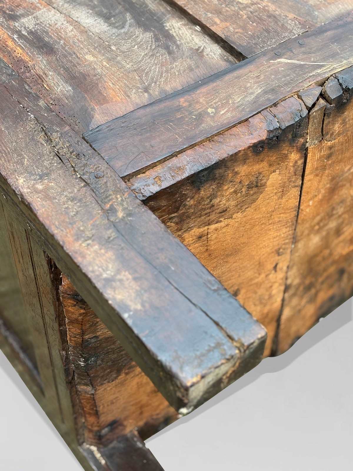 In completely honest, unrestored condition, this is an excellent early example of English country furniture, traditionally used for storing bedding, linens or valuables. Constructed from solid oak planks with pegged joints, it remains strong and practical, raised on its original stile feet.