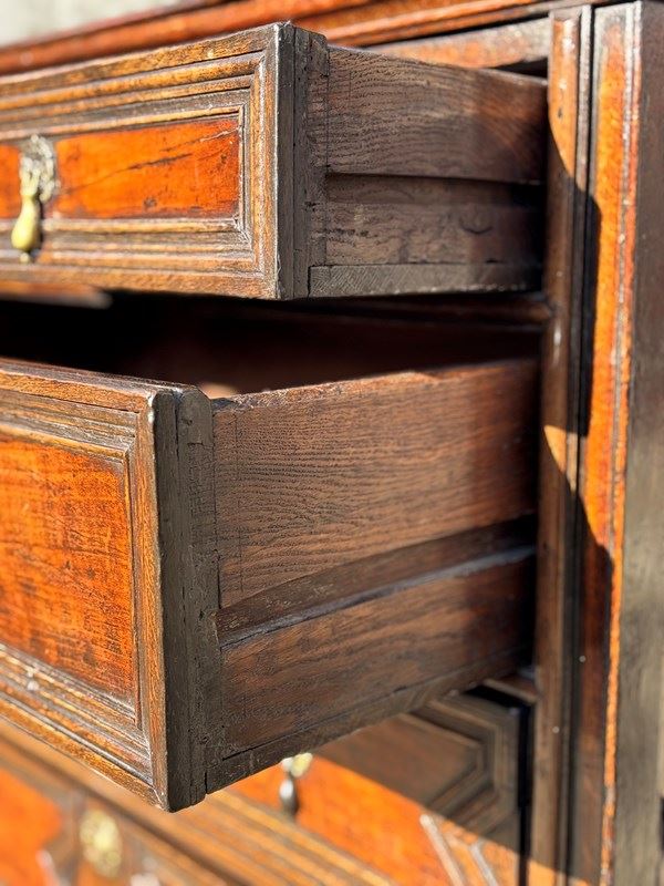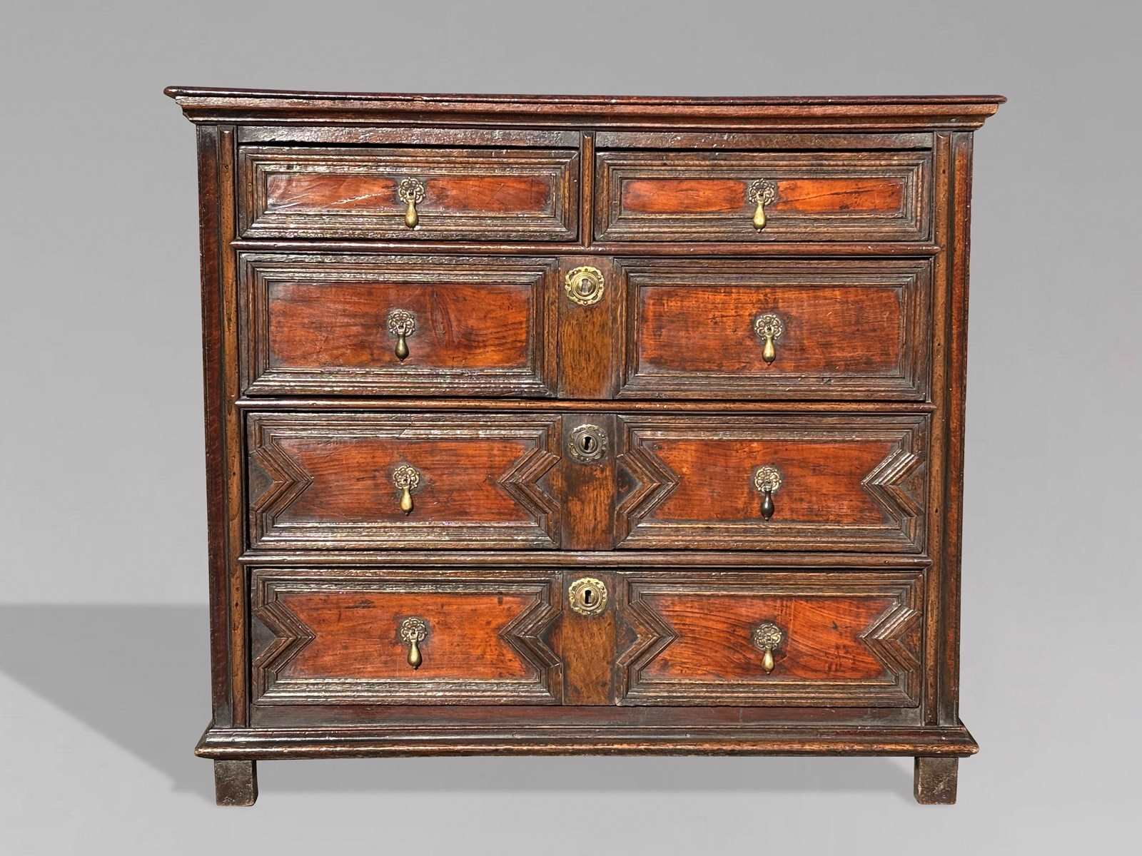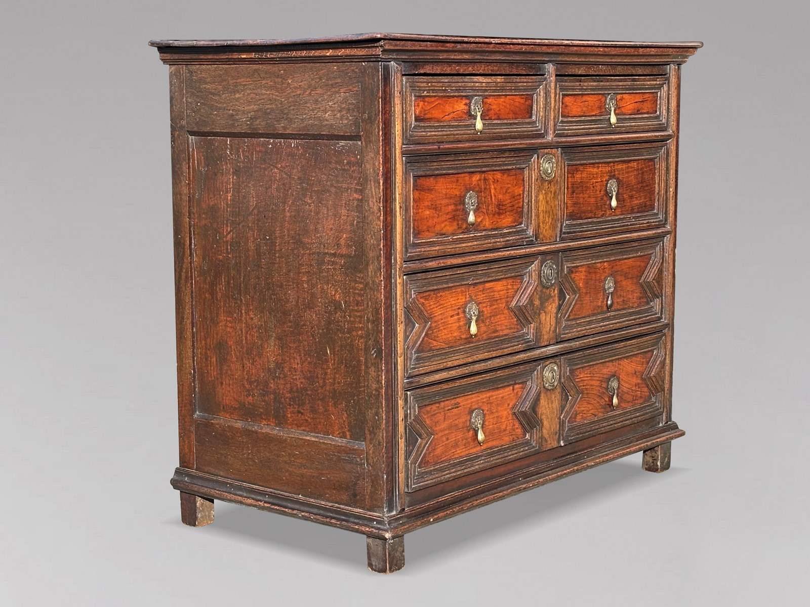 A wonderfully characterful late 17th-century Charles II Jacobean oak geometric chest of drawers, boasting exceptional colour, depth and patina.