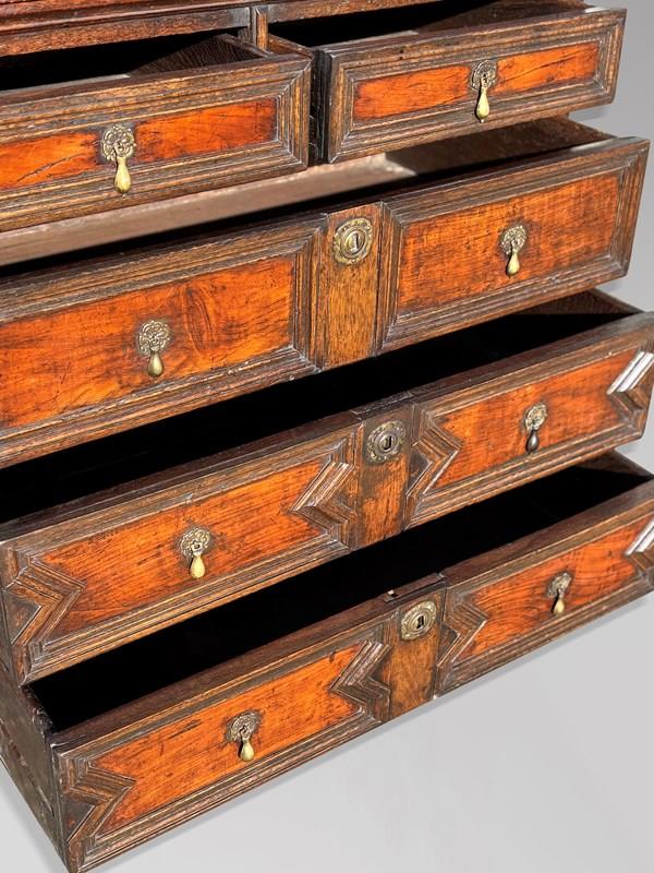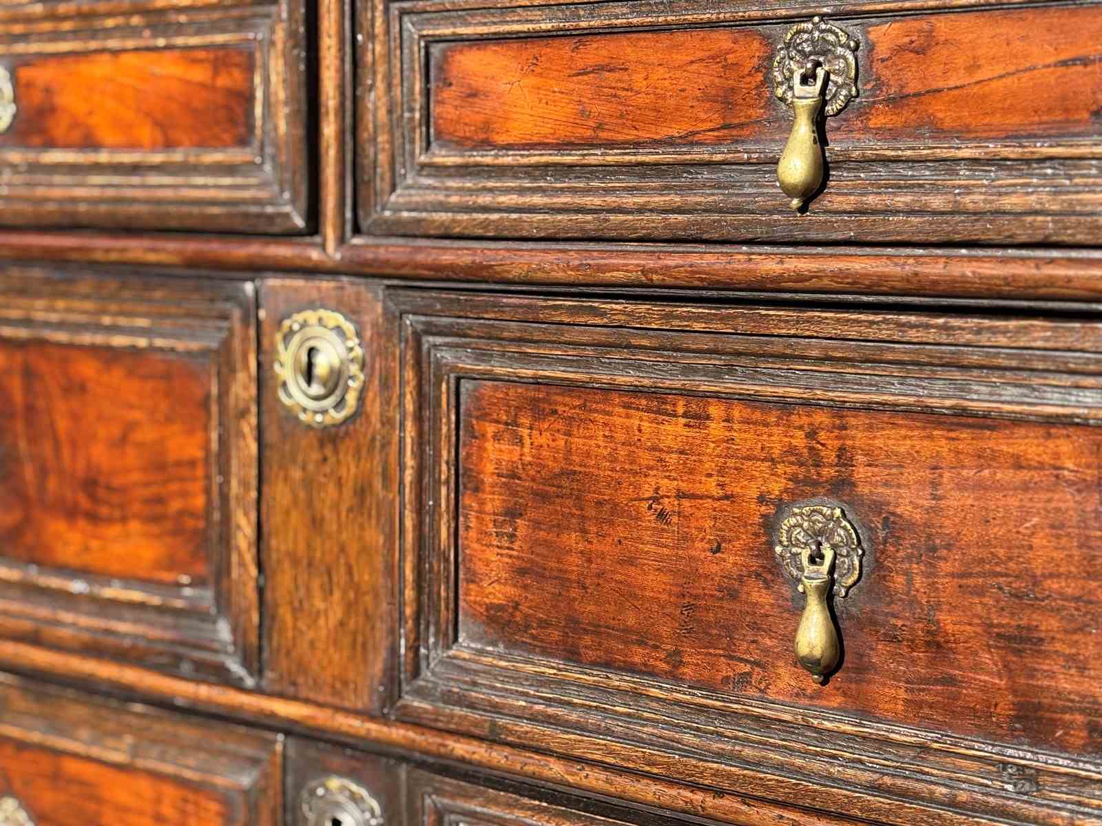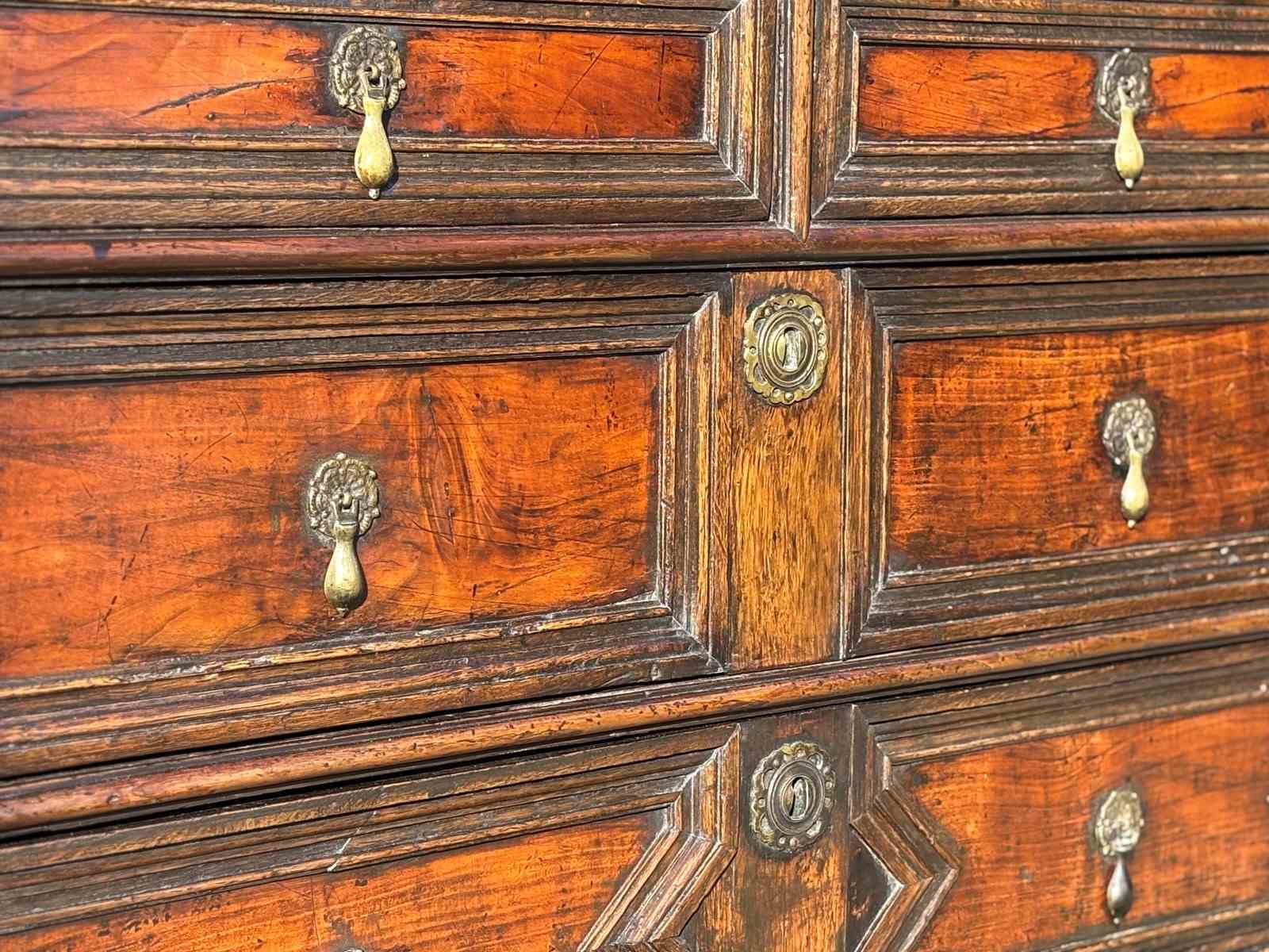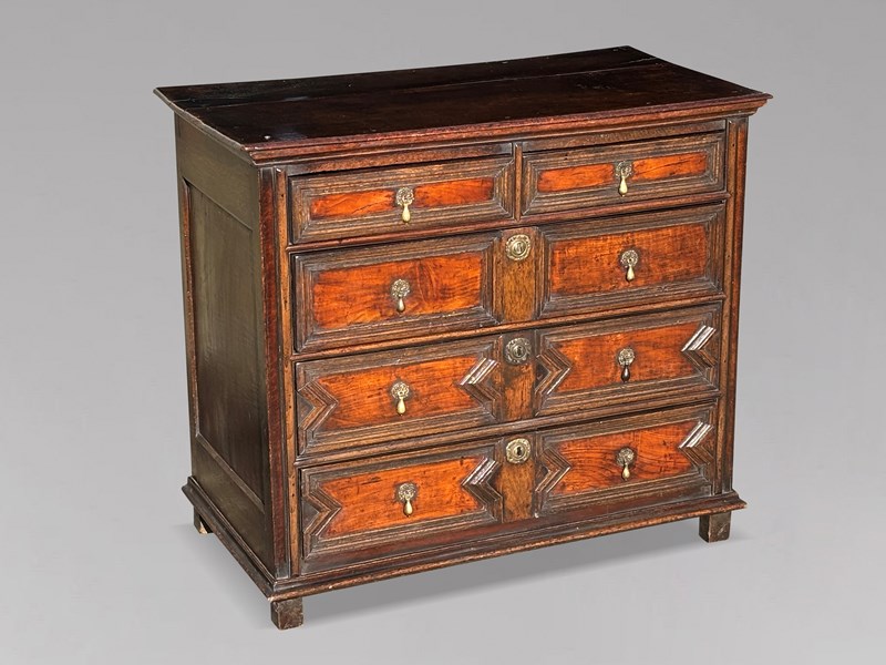 A wonderfully characterful late 17th-century Charles II Jacobean oak geometric chest of drawers, boasting exceptional colour, depth and patina.