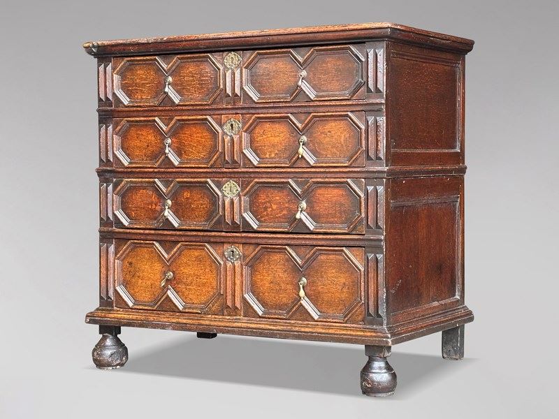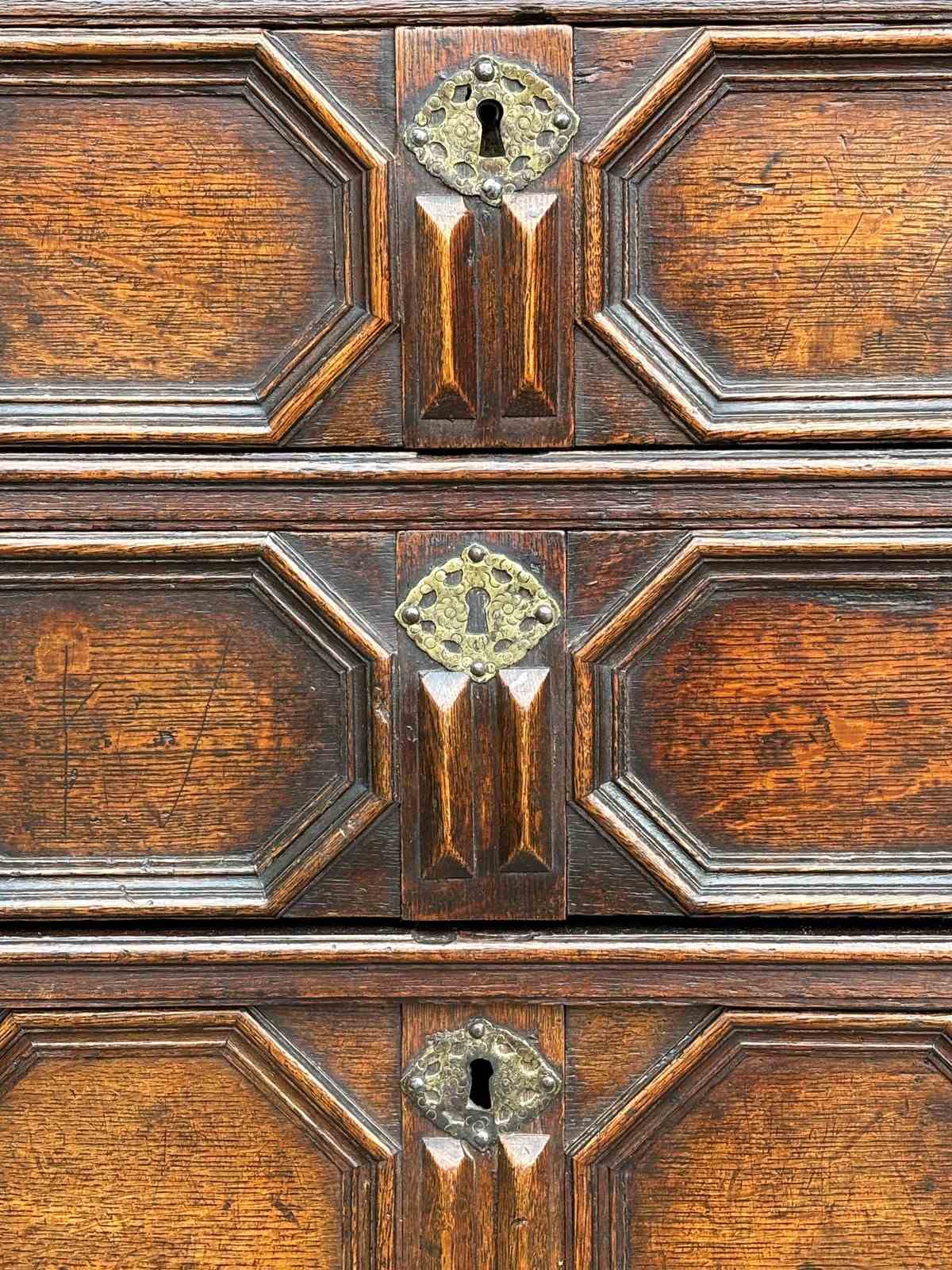 A wonderfully characterful late 17th-century Charles II Jacobean oak geometric chest of drawers, boasting exceptional colour, depth and patina.