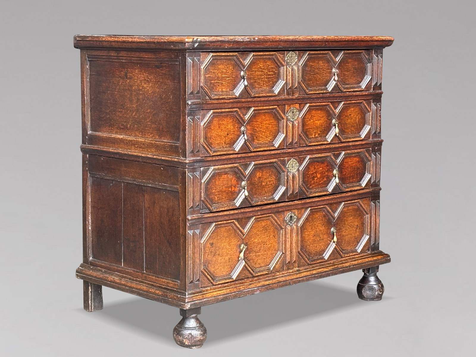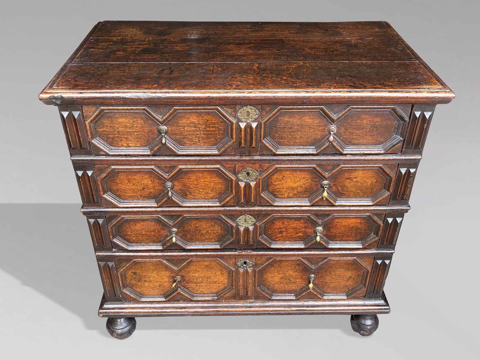 This finely crafted piece features a rectangular planked top with moulded edge, above four long graduated, oak lined drawers, all enriched with crisp geometric moulding. The drawers retain their original brass drop handles, escutcheons and locks, adding both visual interest and great authenticity. Raised on its original front bun feet and rear square stile feet, with original planked back and panelled sides, this chest offers a completely honest, untouched feel that is increasingly hard to find. The rich, warm colour and beautifully matured surface bear the hallmark of over three centuries of careful use and polishing.