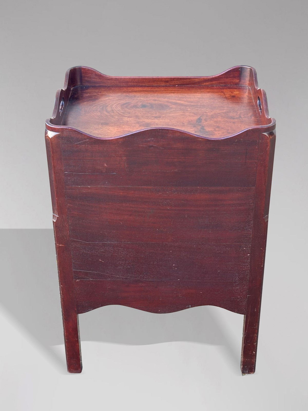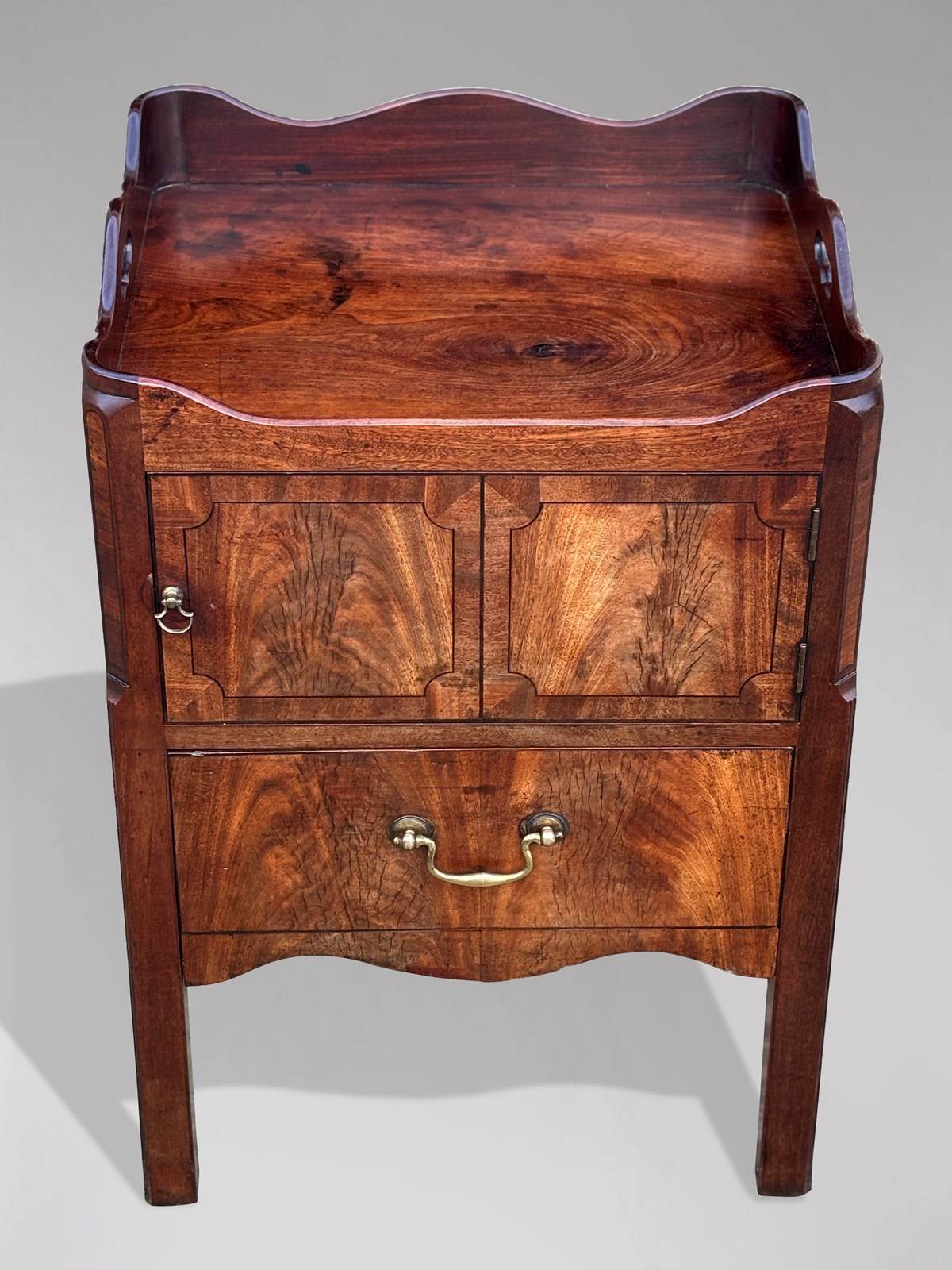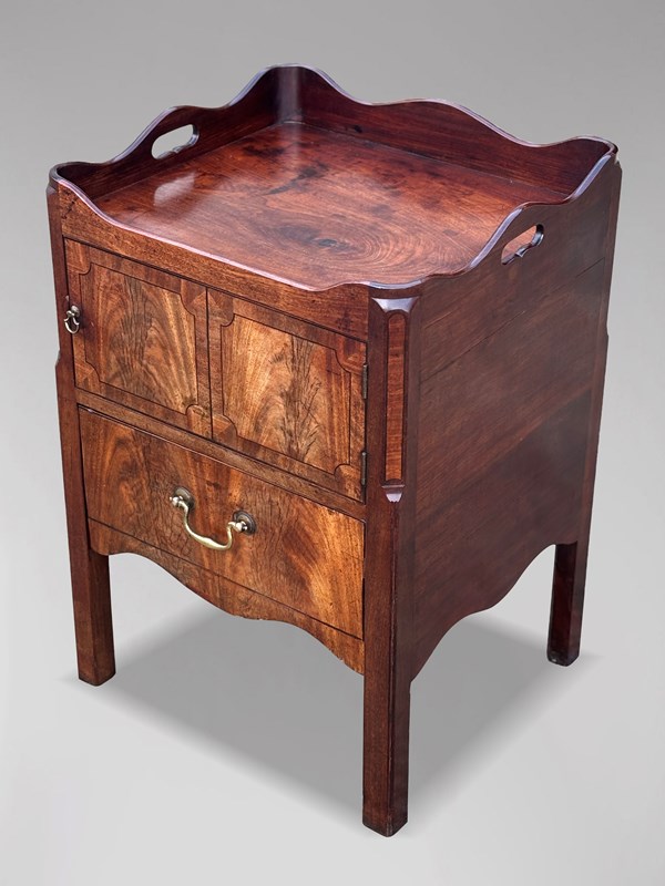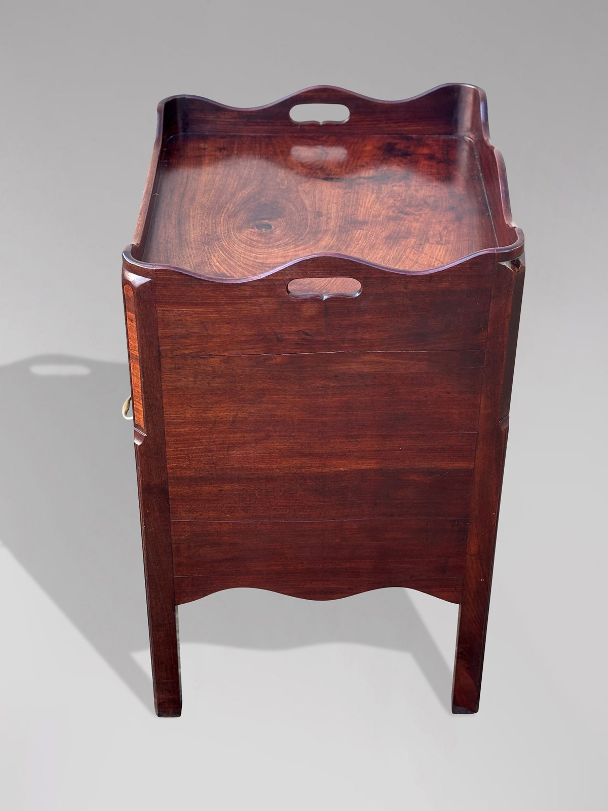 A wonderful late 18th-century George III period mahogany tray-top commode, in good original condition. The rounded rectangular galleried top with pierced carrying handles sits above beautifully figured mahogany doors with ebony stringing, flanked by inlaid canted corners. Below is a single commode drawer with its original brass swan-neck handle and a shaped, waved apron, all raised on square moulded legs.