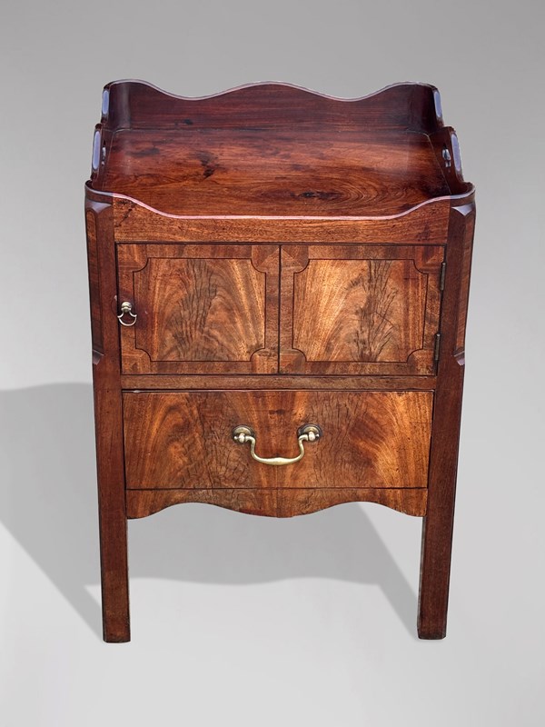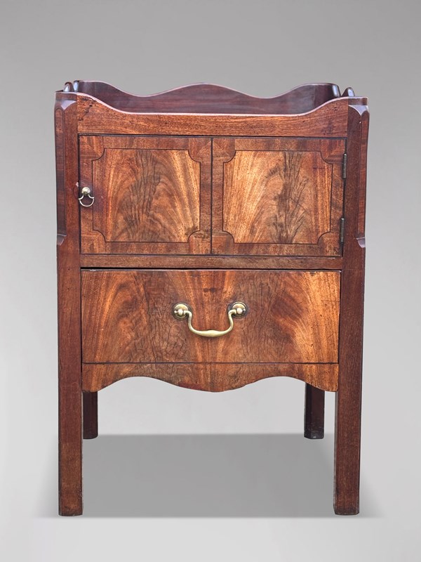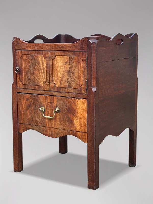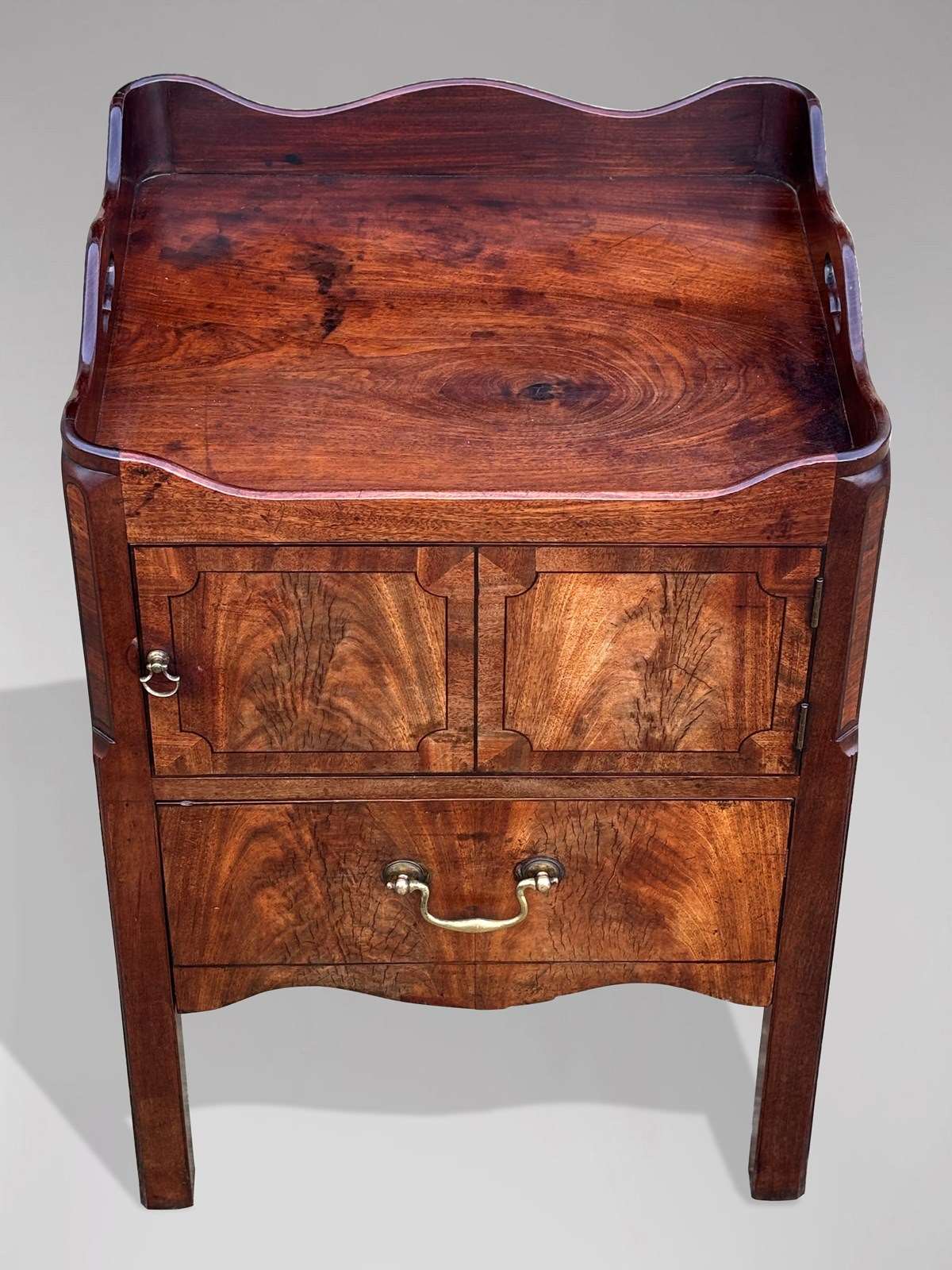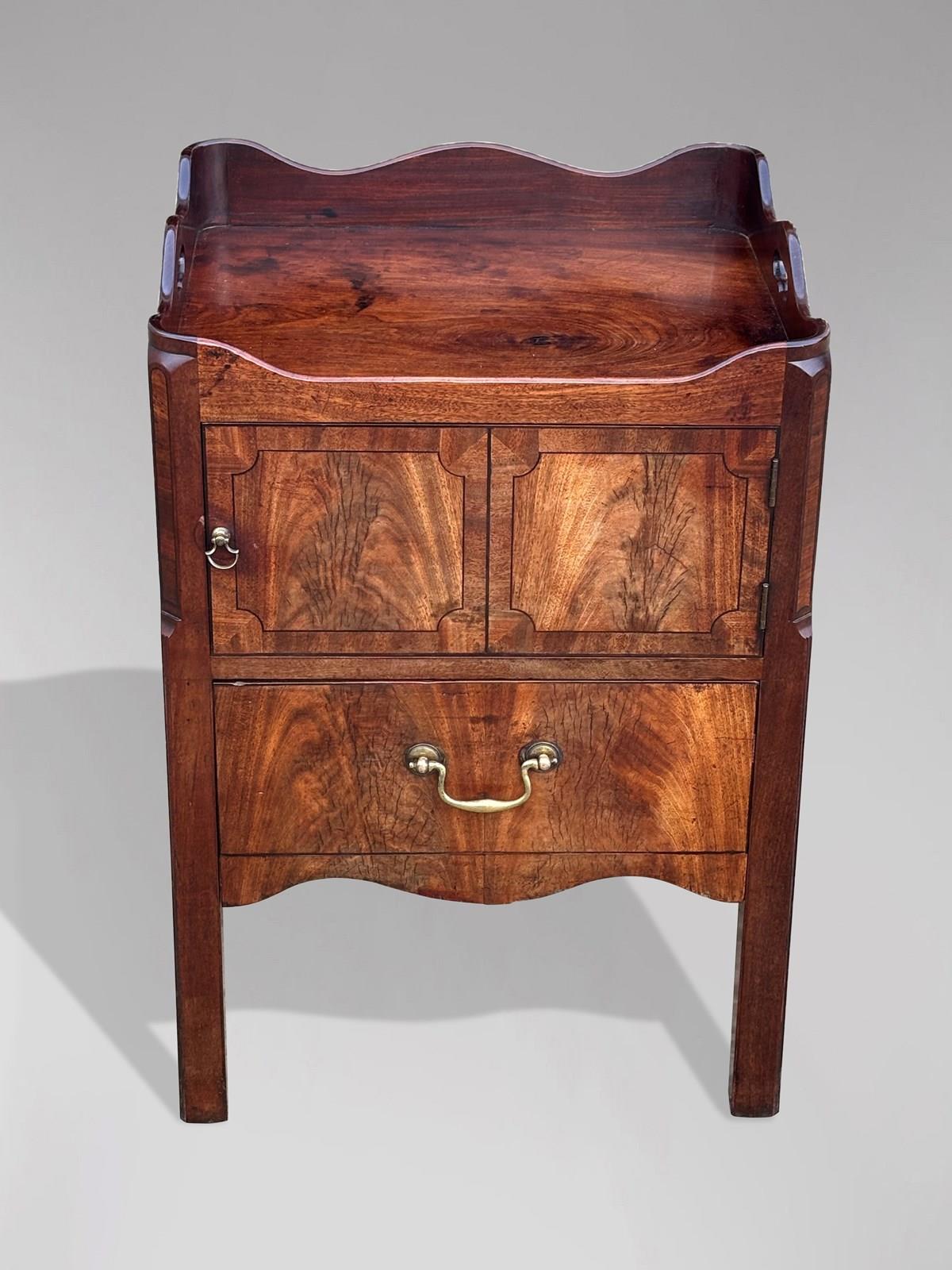 A wonderful late 18th-century George III period mahogany tray-top commode, in good original condition. The rounded rectangular galleried top with pierced carrying handles sits above beautifully figured mahogany doors with ebony stringing, flanked by inlaid canted corners. Below is a single commode drawer with its original brass swan-neck handle and a shaped, waved apron, all raised on square moulded legs.