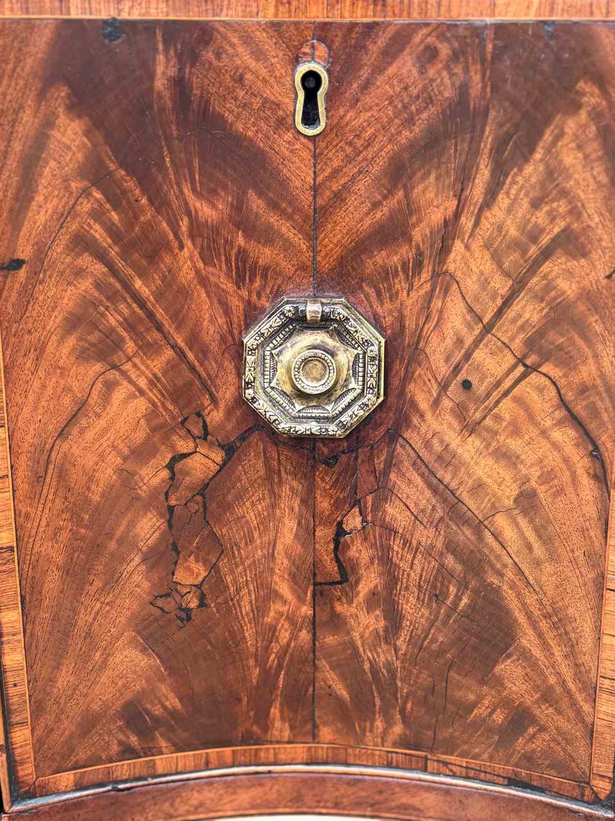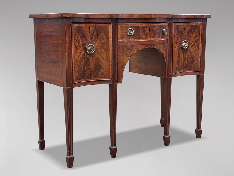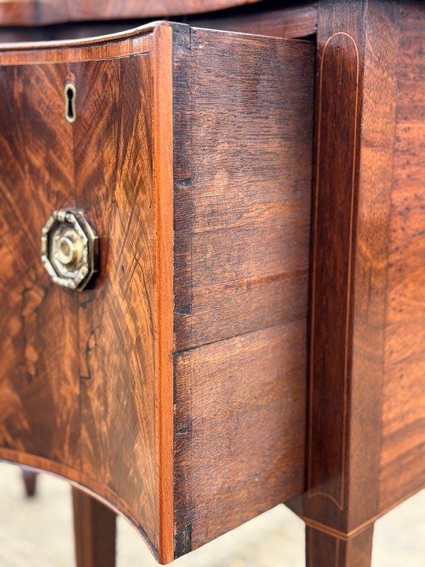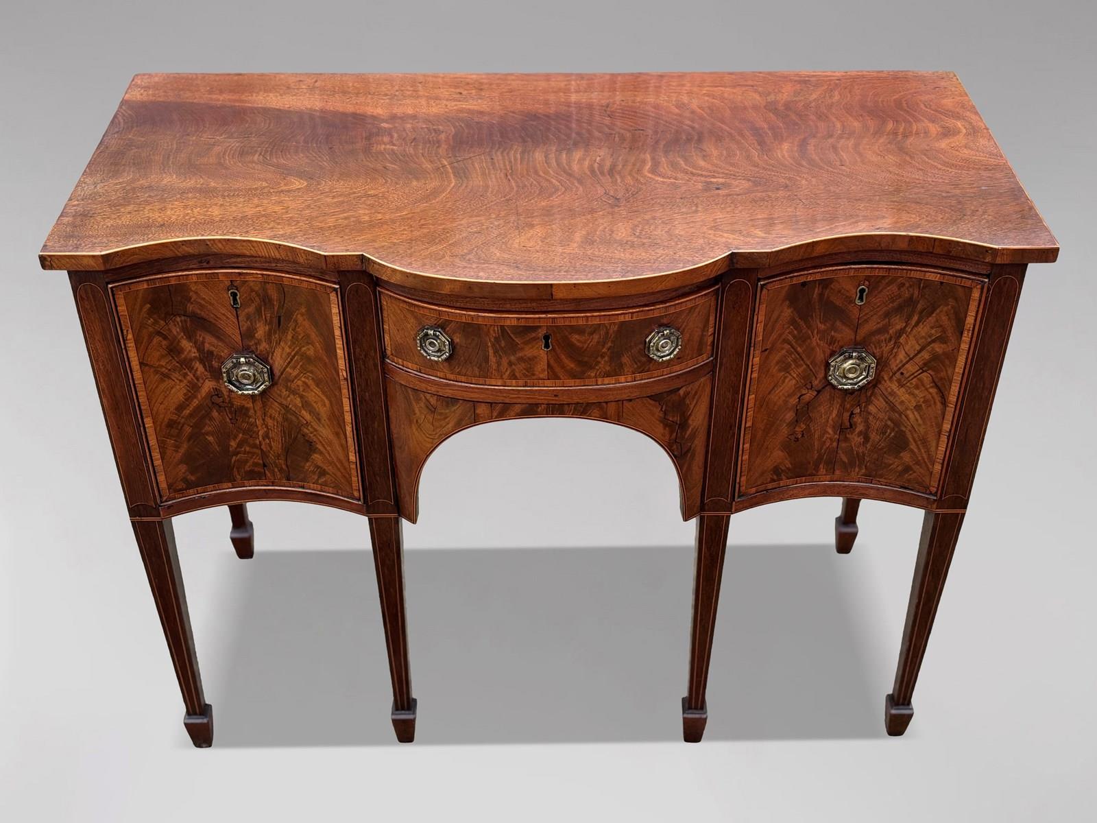 Of very attractive, practical small proportions, this sideboard features a well figured solid mahogany serpentine top with satinwood stringing to the edge and finely crossbanded inlay to the drawers. The front is beautifully shaped, with a combination of convex and concave drawer fronts, veneered in symmetrically arranged flame mahogany and finished with inlaid and crossbanded borders.