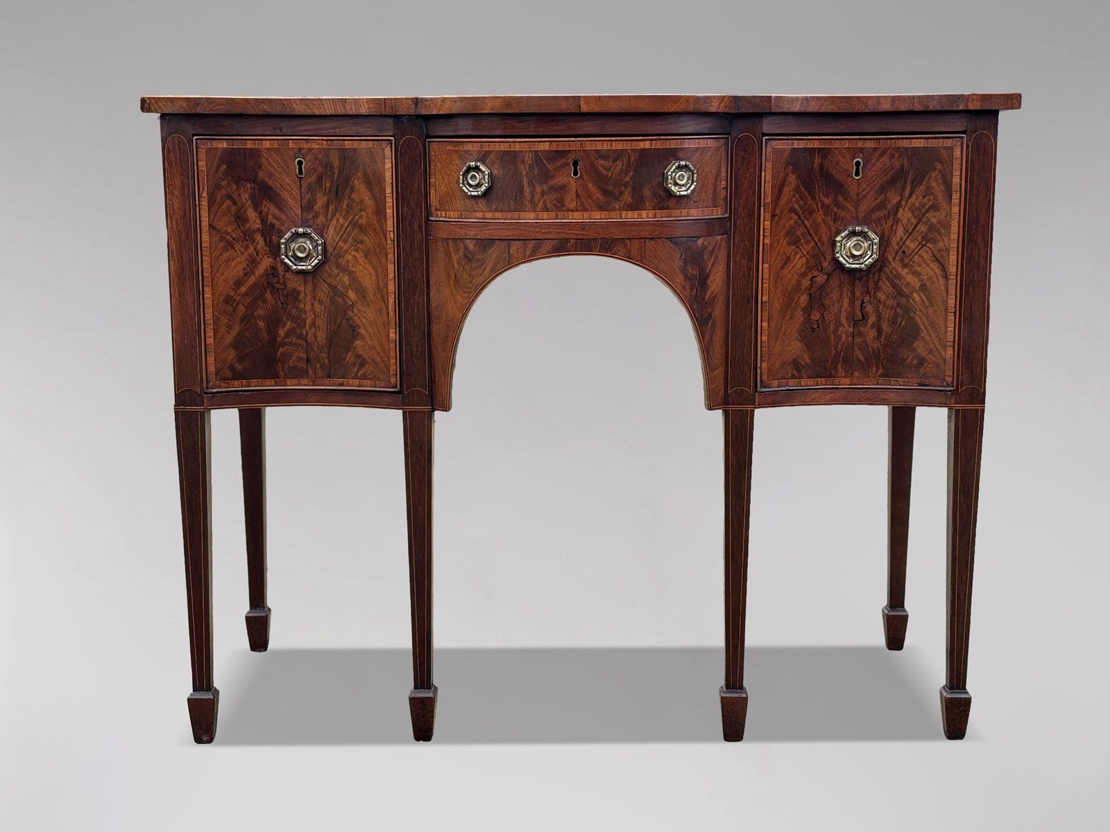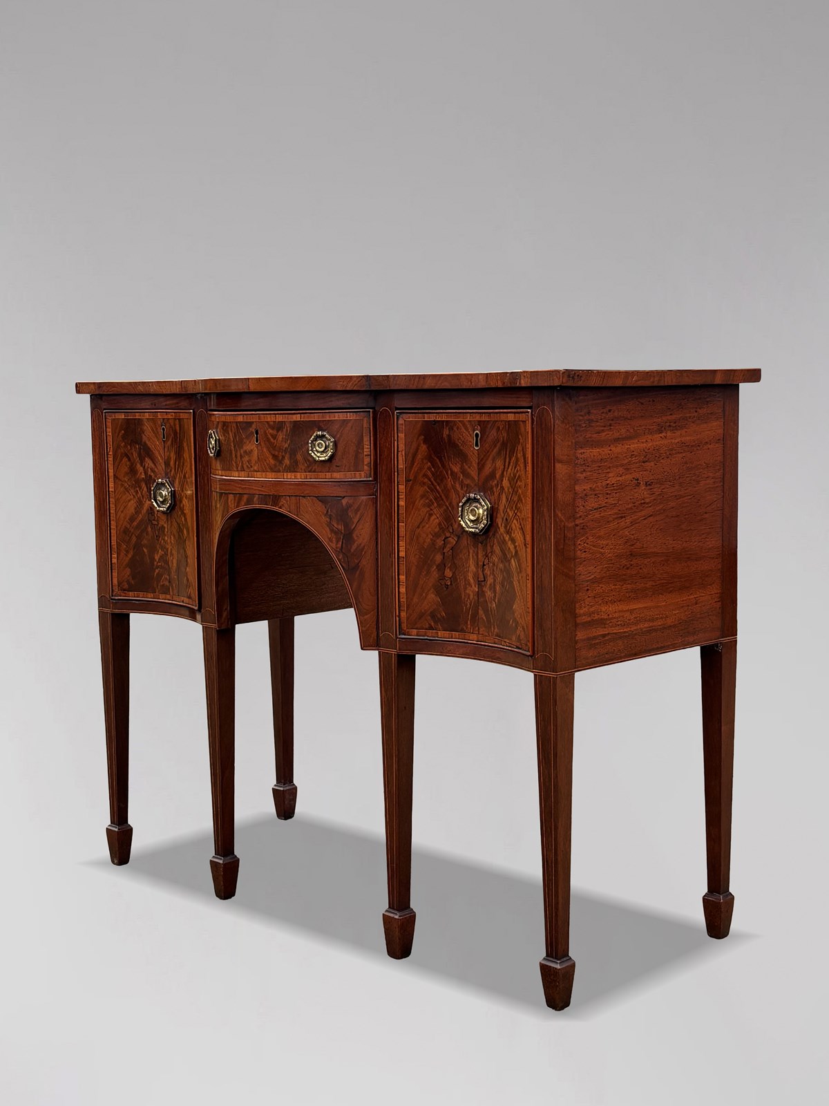 An exceptionally elegant late 18th century George III period mahogany and marquetry serpentine sideboard, dating from around 1790, in the Sheraton style.