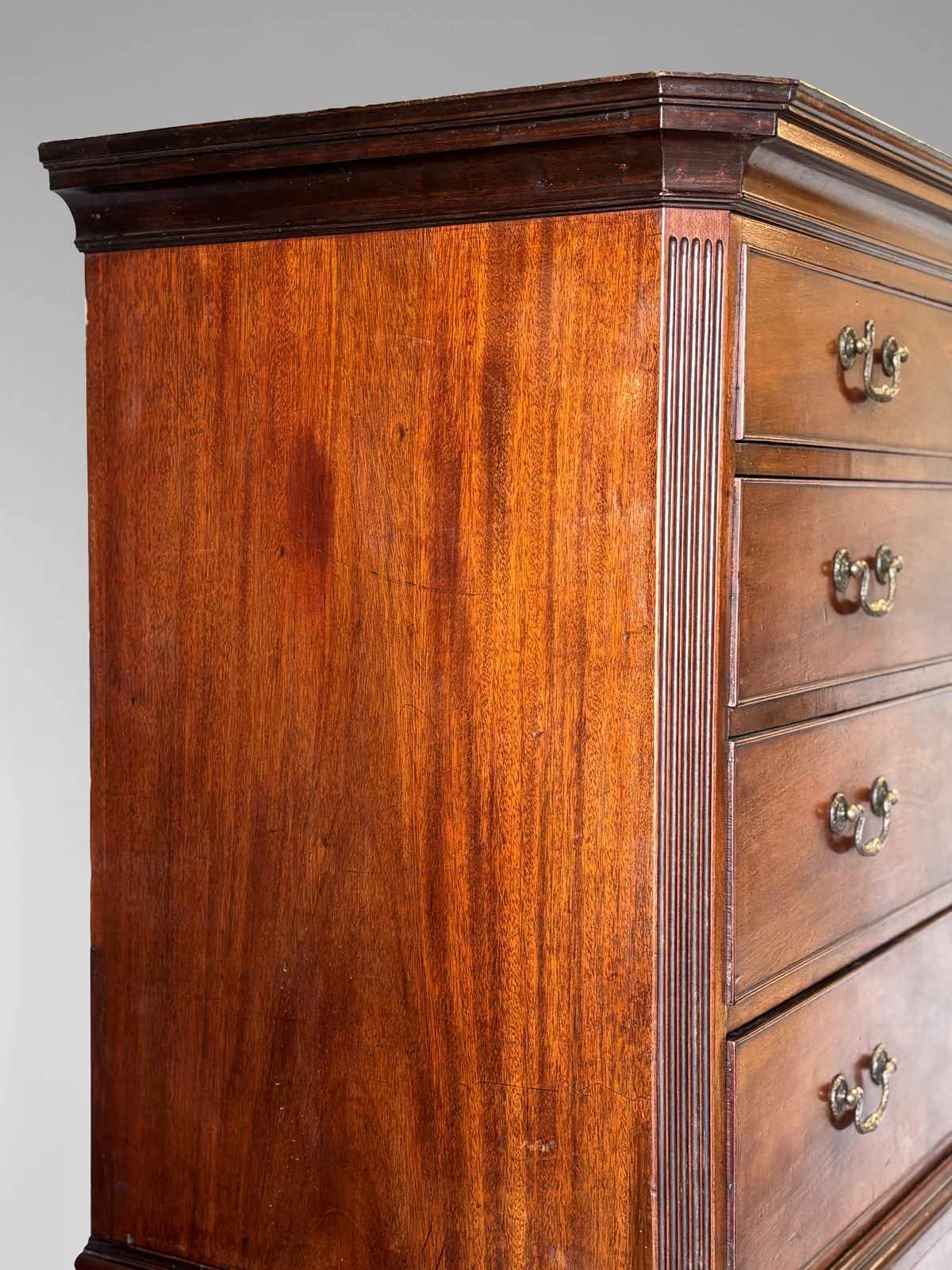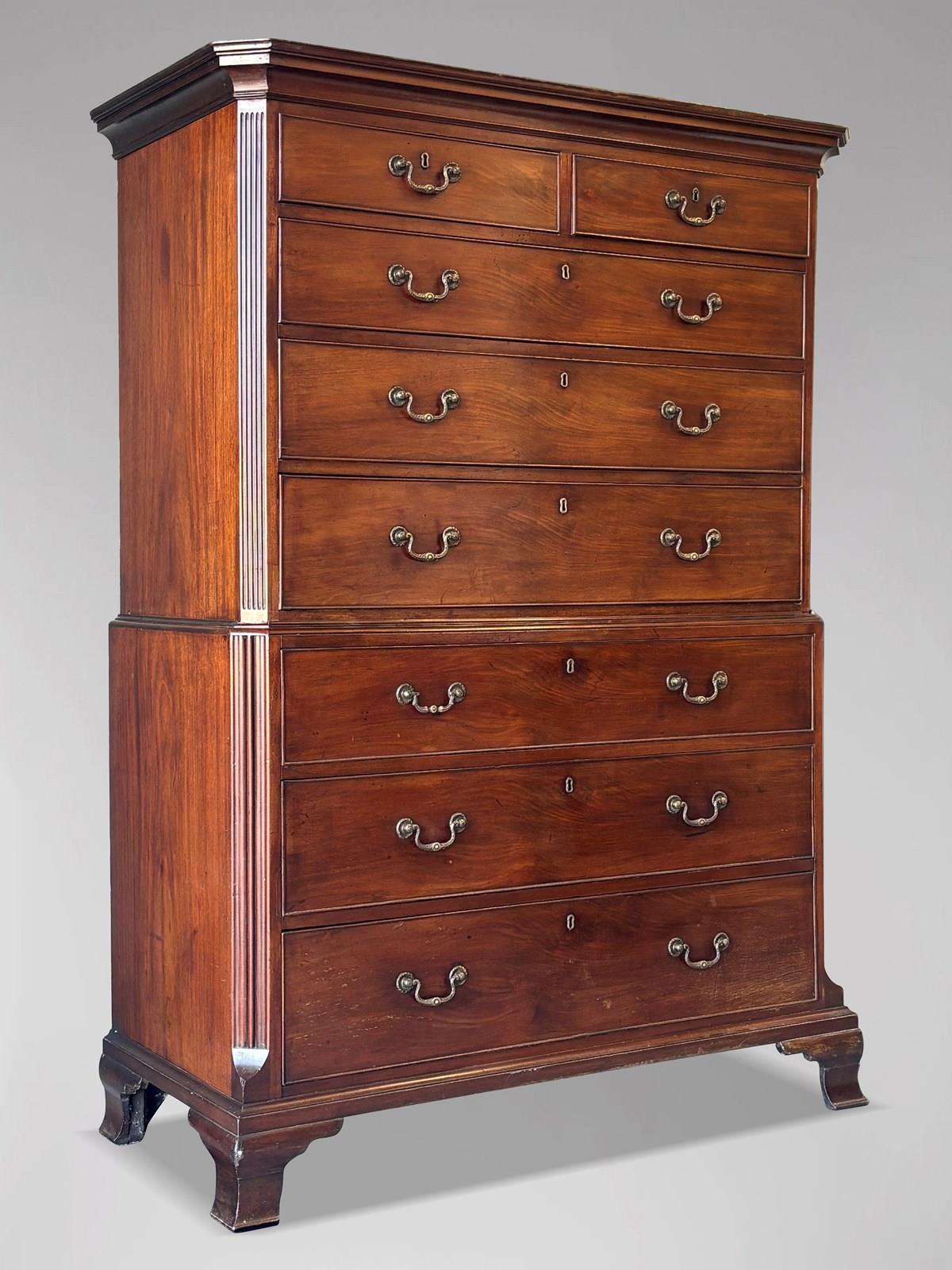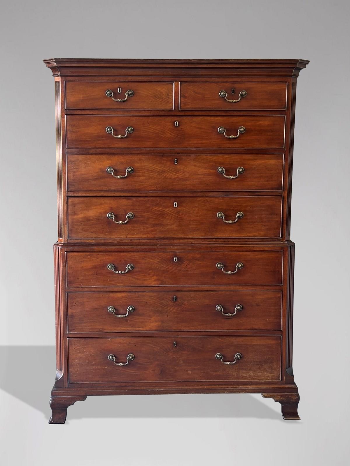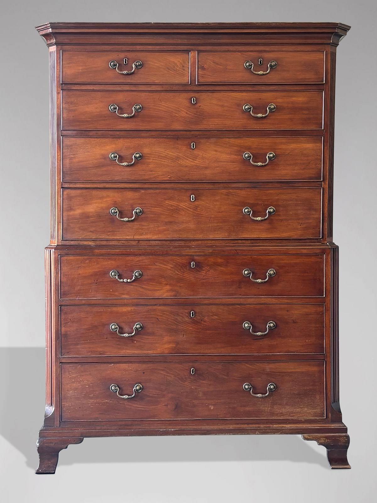 An untouched late 18th-century George III period figured solid mahogany chest-on-chest, with a moulded cornice above two short and six long, cockbeaded, graduated oak-lined drawers, fitted with the original finely cast brass swan-neck handles and escutcheons, and flanked by reeded, fluted pilasters. The whole stands on its original ogee bracket feet. Circa 1780.