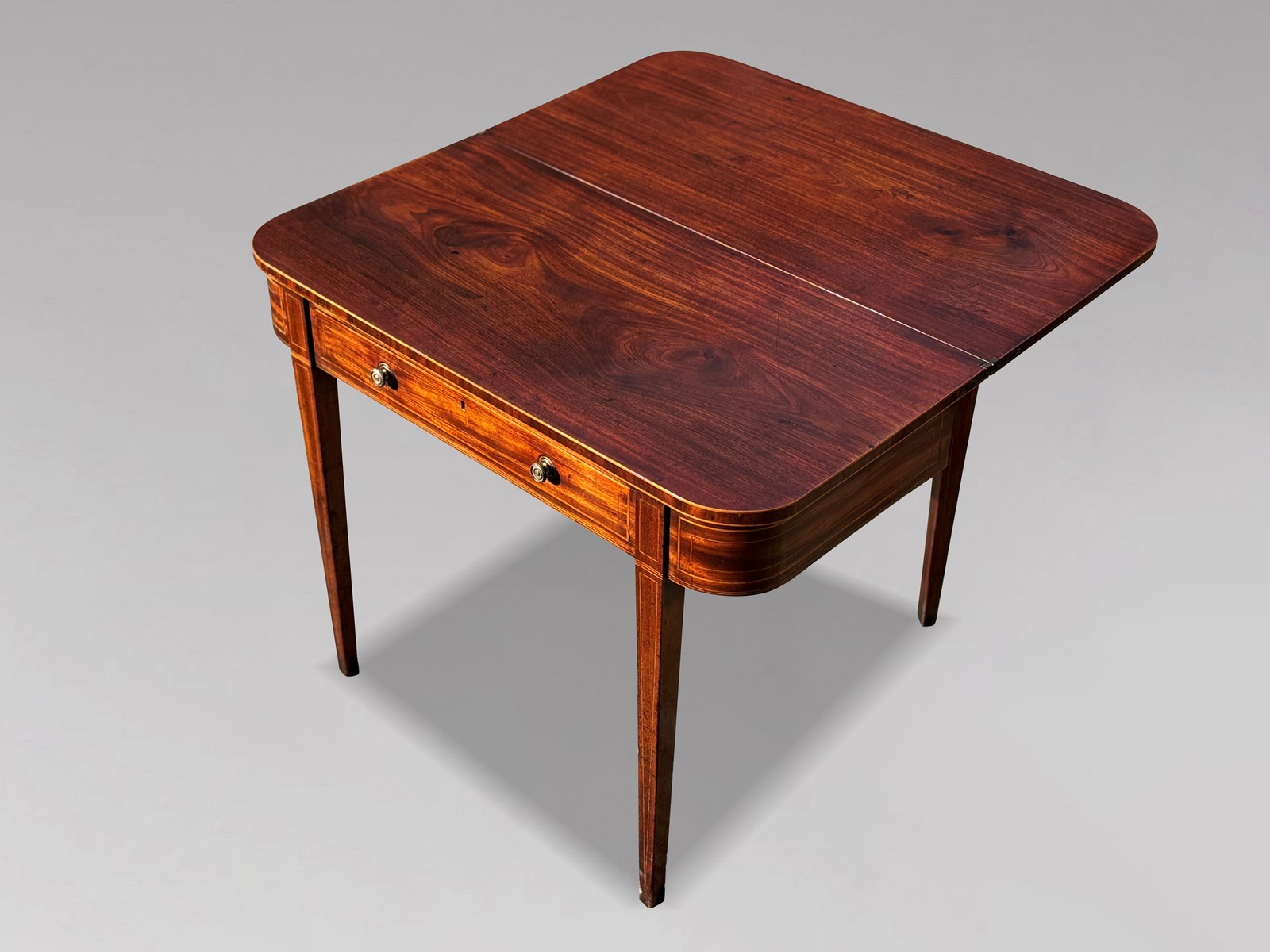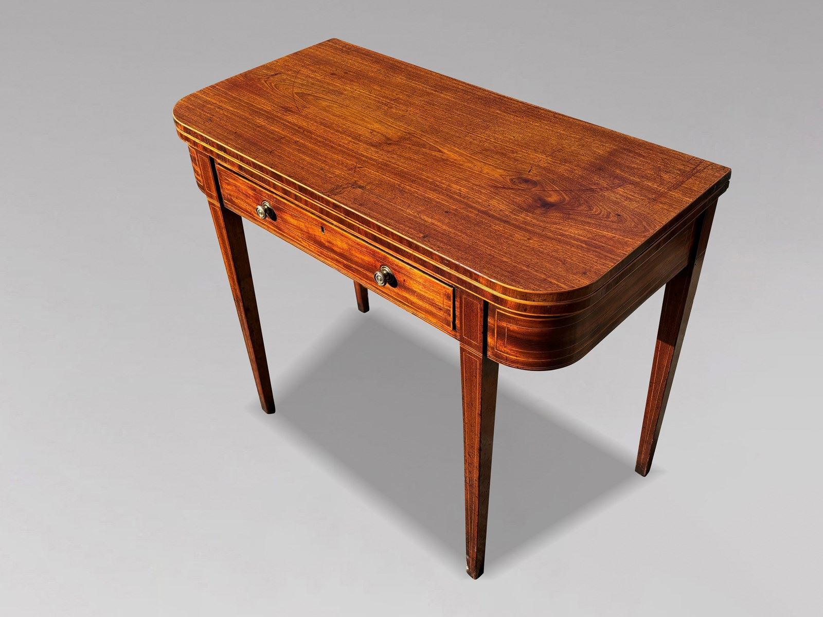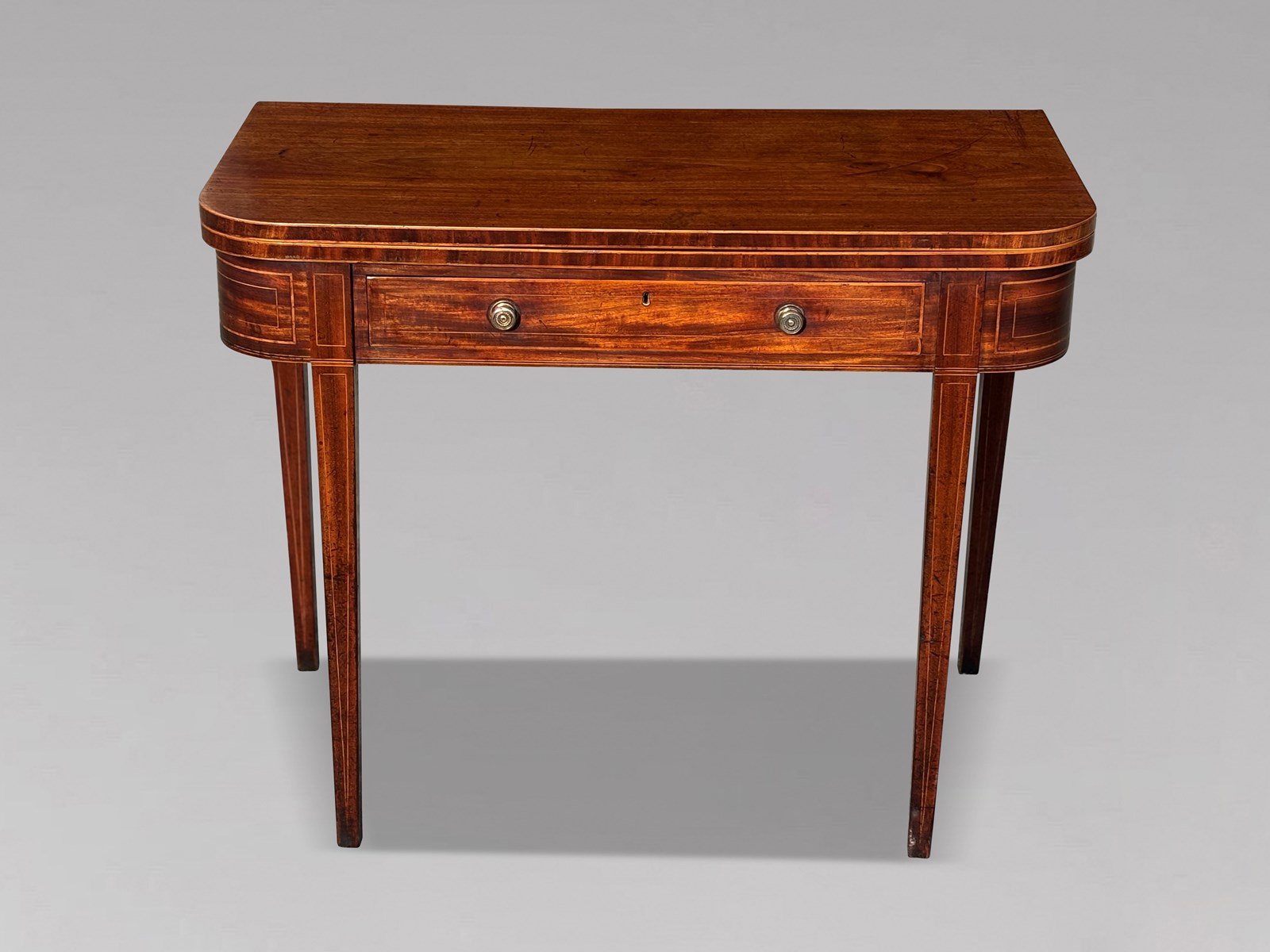A superb late 18th-century George III mahogany fold-over tea table, of elegant D-shaped form, finely inlaid throughout with satinwood stringing and banding. The top is crafted from beautifully figured flame mahogany with delicate satinwood inlay, and hinges open to reveal an interior of rich, unfaded mahogany with exposed brass hinges, all in excellent original condition. The frieze incorporates a full-length mahogany drawer, again detailed with satinwood stringing, and lined in oak, a hallmark of quality Georgian cabinetmaking. The table stands on four refined, square tapering legs, all inlaid, with the back legs hinged to swing out and support the top when open.
