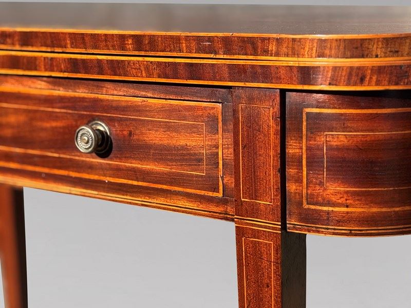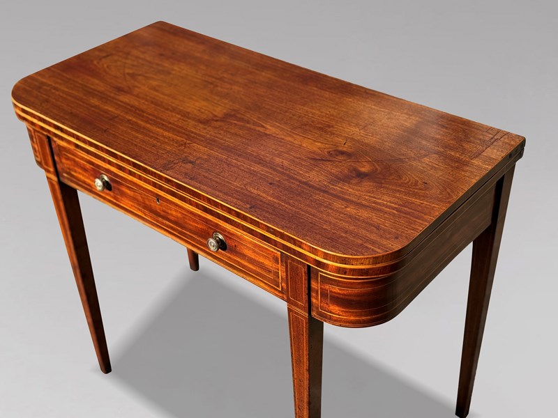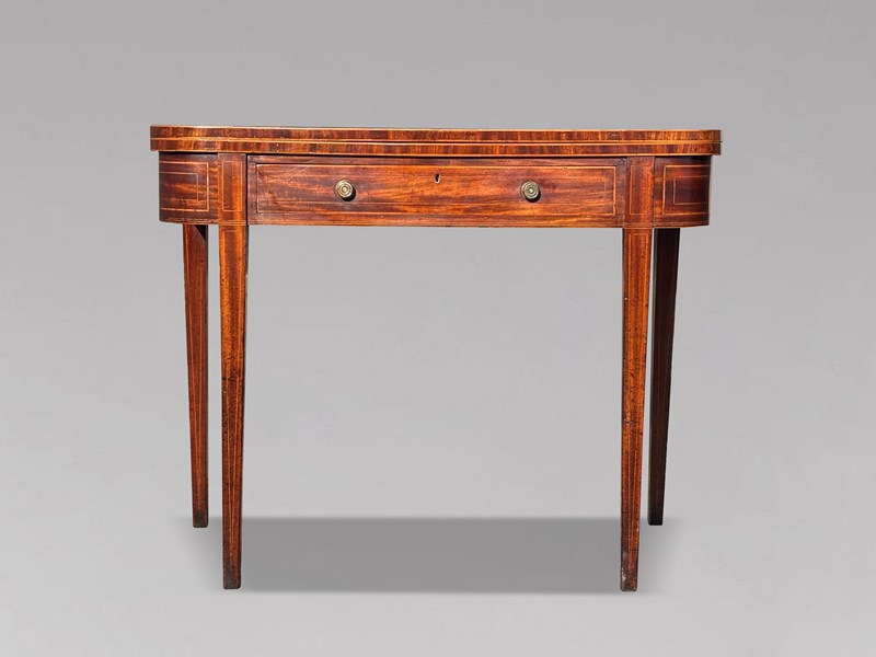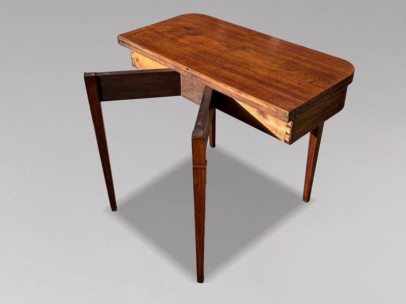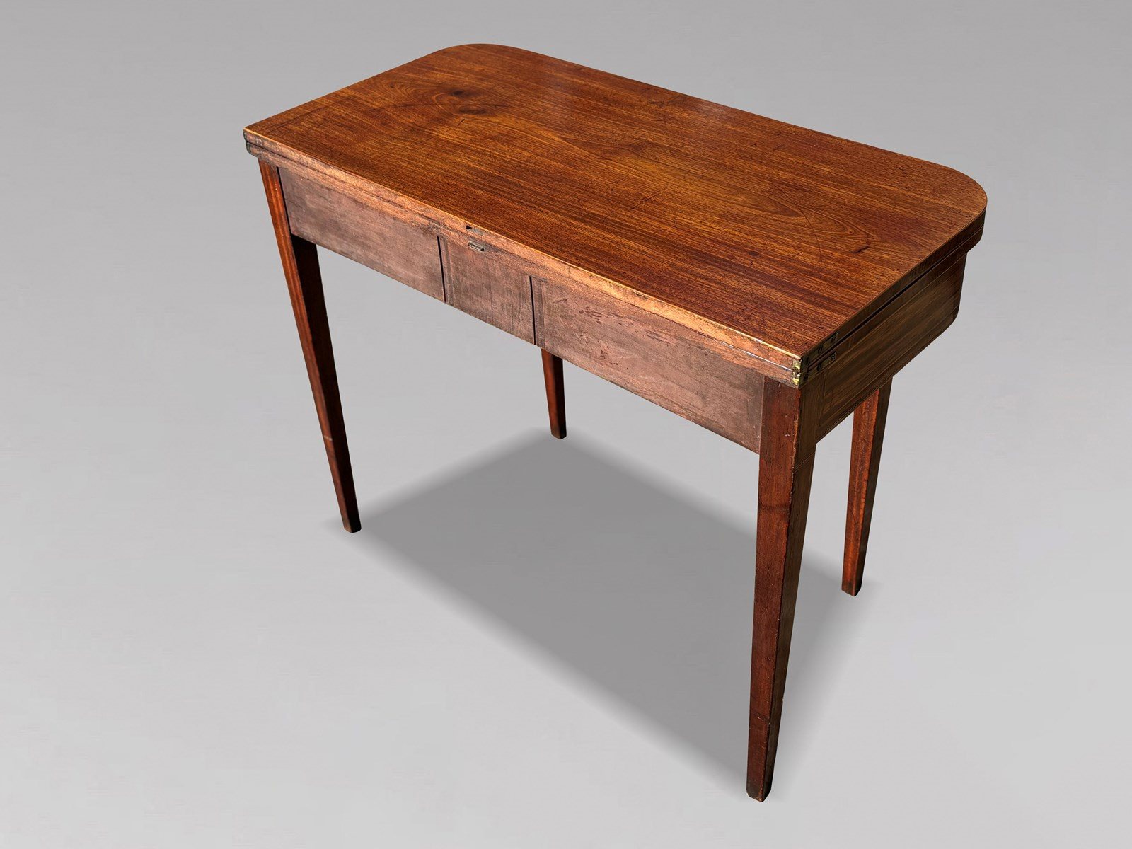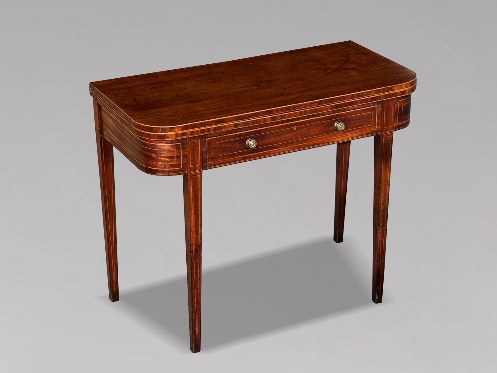 A superb late 18th-century George III mahogany fold-over tea table, of elegant D-shaped form, finely inlaid throughout with satinwood stringing and banding. The top is crafted from beautifully figured flame mahogany with delicate satinwood inlay, and hinges open to reveal an interior of rich, unfaded mahogany with exposed brass hinges, all in excellent original condition. The frieze incorporates a full-length mahogany drawer, again detailed with satinwood stringing, and lined in oak, a hallmark of quality Georgian cabinetmaking. The table stands on four refined, square tapering legs, all inlaid, with the back legs hinged to swing out and support the top when open.