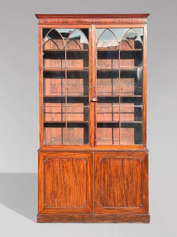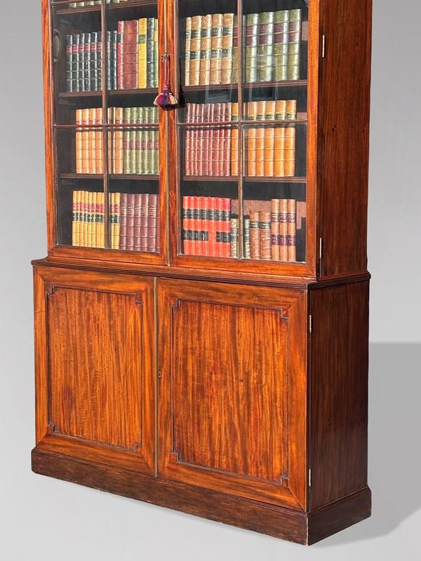 A superb quality, elegant late 18th-century George III period solid mahogany two-door library bookcase. The upper section has a moulded cornice above a pair of original glazed doors enclosing four fully adjustable shelves. The lower section is fitted with beautifully figured mahogany panelled cupboard doors, enclosing a further two adjustable shelves, and the whole stands on an integral moulded plinth base. England, circa 1790.