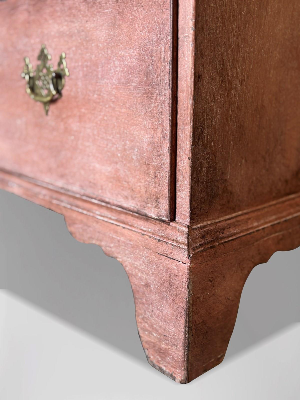 A late 18th-century George III painted mahogany chest-on-chest, also known as a tallboy. The piece is divided into two sections by a moulding. The upper section has a moulded cornice over two short drawers and three long, graduating, cockbeaded oak-lined drawers, all flanked by canted corners. The lower section features a painted secretaire drawer above two long, graduating cockbeaded drawers, again beautifully oak-lined, and stands proudly on its original shaped bracket feet. All drawers retain their original finely cast brass handles and escutcheons, enhancing its period character and authenticity.