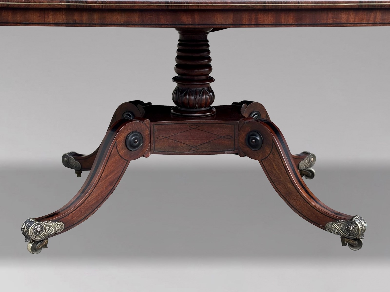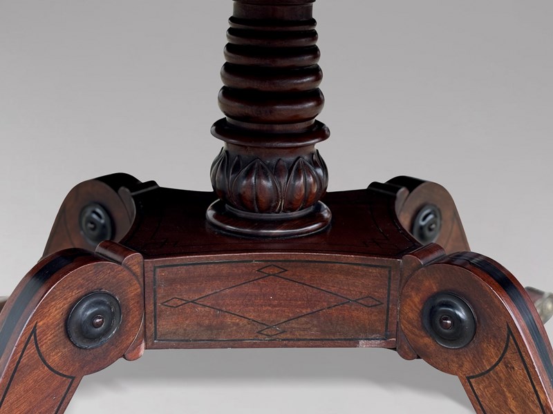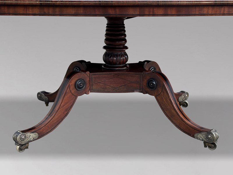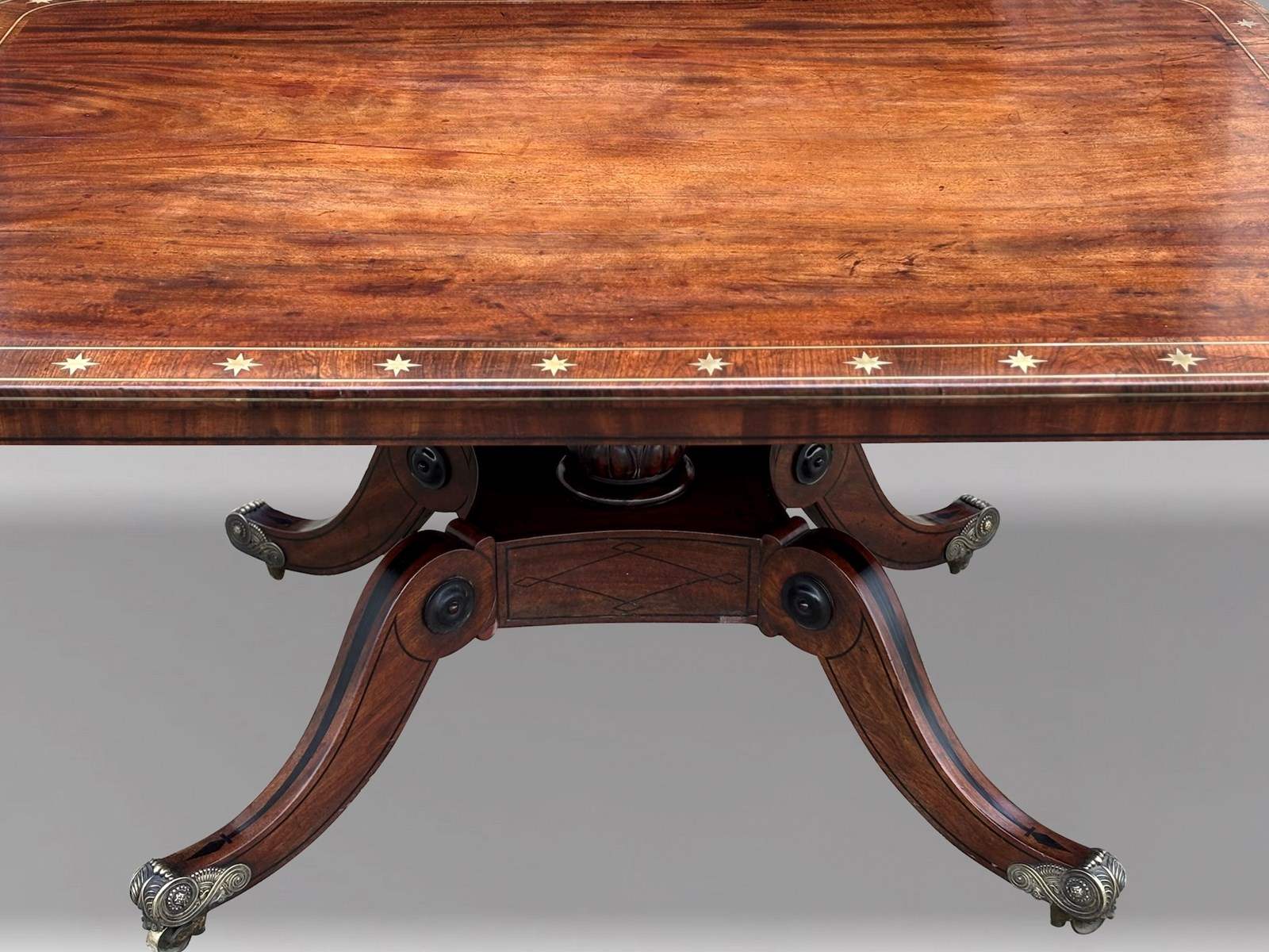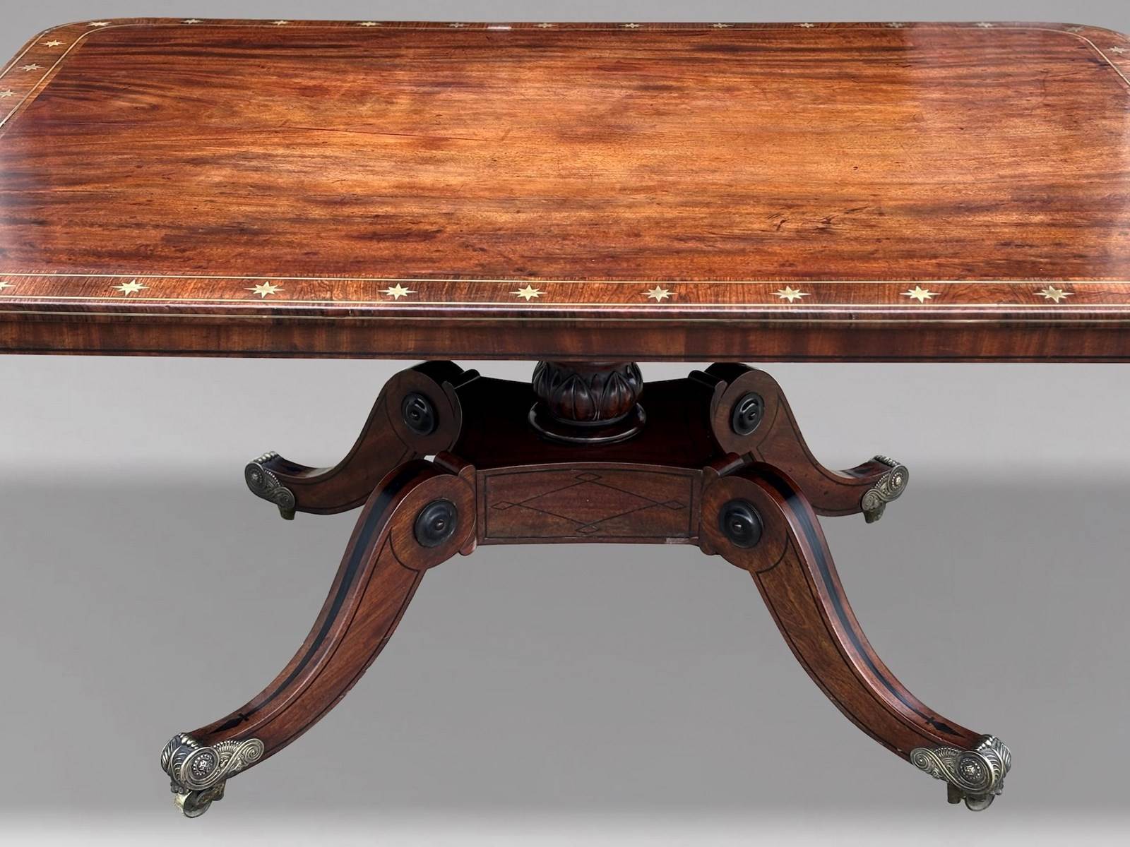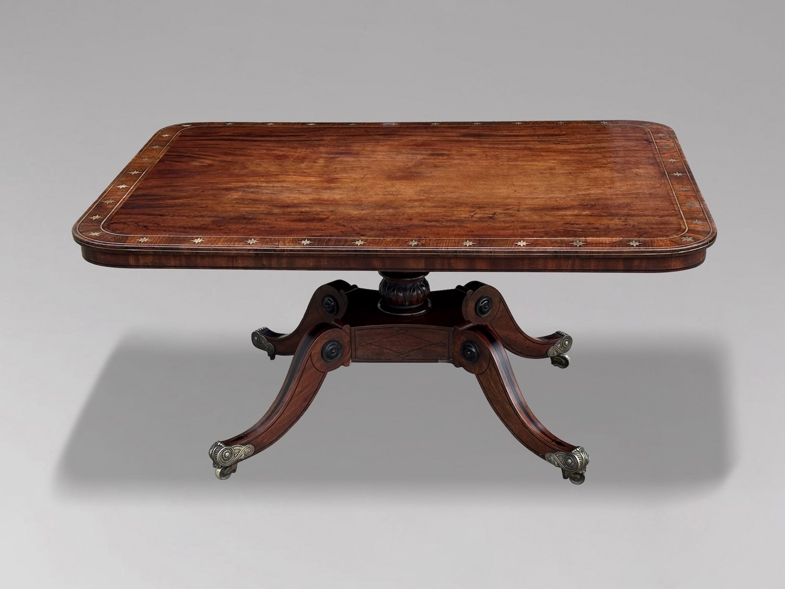 An outstanding late 18th-century George III period mahogany centre table of superb quality, dating from circa 1790. The finely figured rectangular mahogany top, with gently rounded corners, is framed by a broad rosewood cross banding and embellished with decorative brass star inlays and brass stringing to the edge. A refined apron with ebony stringing further accentuates the elegance of the design. The top is raised on a striking quattro form pedestal base centred by a finely turned column. The fluted platform, enriched with intricate ebony marquetry, flows into four gracefully hipped and scrolled legs, each inlaid with ebony and terminating in the original decorative brass castors.