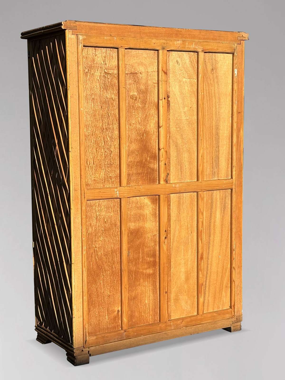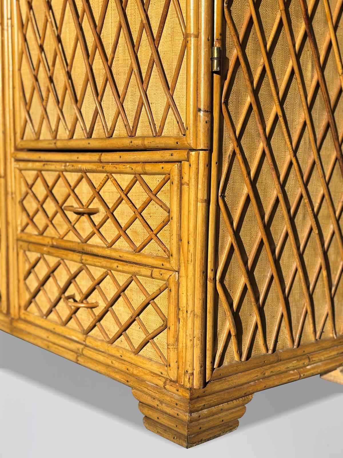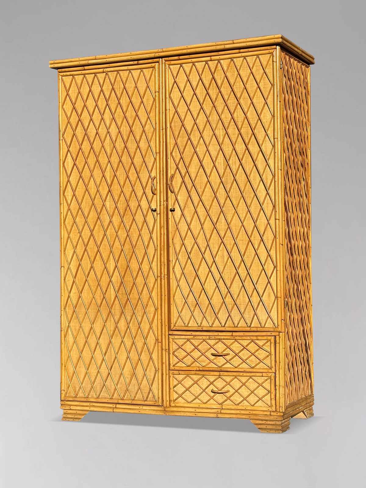 This charming mid-20th-century French Riviera wardrobe in woven wicker and bamboo features two doors and two drawers, with exquisite colouring and intricate detailing. Crafted from wicker, rattan and bamboo, it has a natural charm: the woven wicker is adorned with attractive patterns and finished in a warm, natural tone. The wardrobe has integrated wicker handles and retains its original keys with working locks, all raised on bamboo bracket feet that add elegance and lightness. A bamboo-moulded cornice sits above the two doors, which open to reveal a storage space with a hanging rail and a shelved compartment positioned above the two drawers. The woven wicker covers the front and sides and is complemented by the original panelled back. Attractive bamboo trim frames the carcass, doors and drawers, making this piece ideal for bedrooms or living spaces seeking a blend of vintage character and practical storage. With excellent colour and patina, the wardrobe is in very good vintage condition, showing a desirable aged finish together with high?quality joinery and craftsmanship. France, circa 1970.