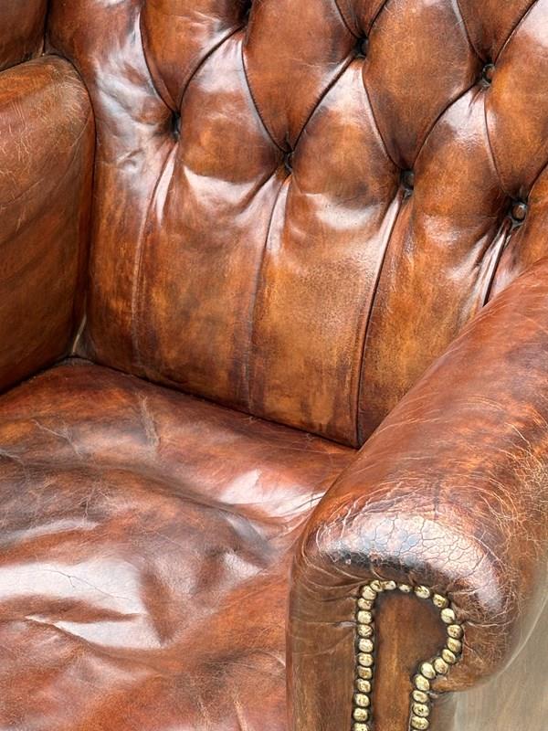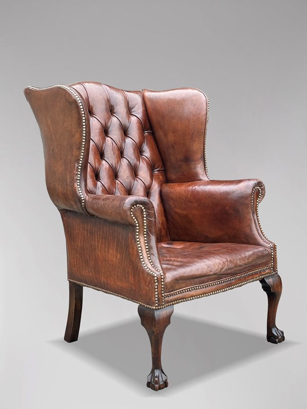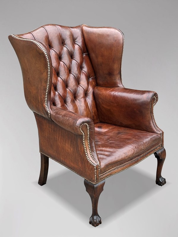 This high-quality, untouched 19th-century brown leather button-back wing armchair is designed in the George III style. The substantial, well-shaped frame features a deep-buttoned upholstered back and arms, all covered in the original brown leather.