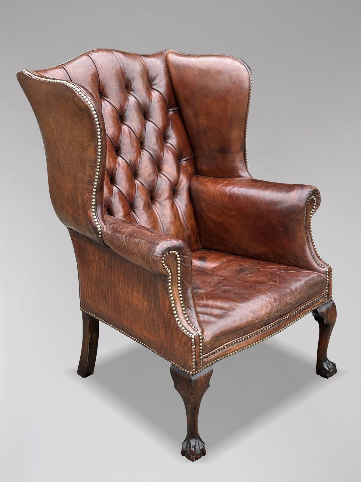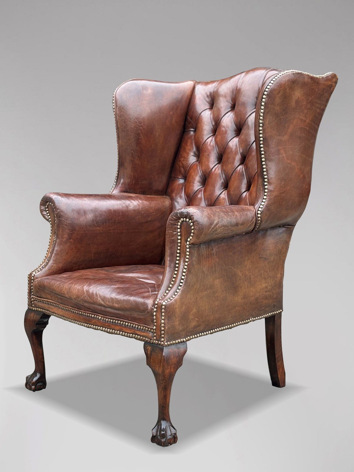 Notable features include scrolling arms, a sprung seat, and close-nailed brass stud detailing. The chair is raised on cabriole legs that terminate in claw-and-ball feet, adding to its classic elegance.