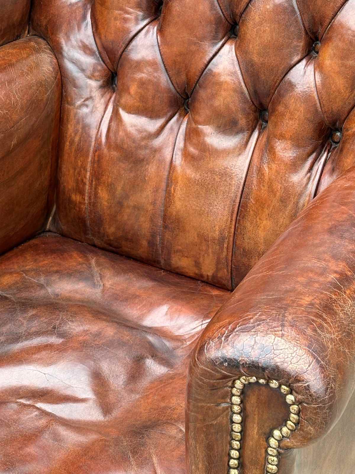 It exhibits a beautiful, untouched colour and rich patination, making it very comfortable. Please note that there is a small tear in the leather on the back.