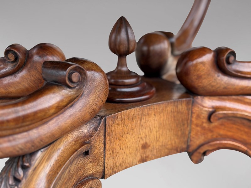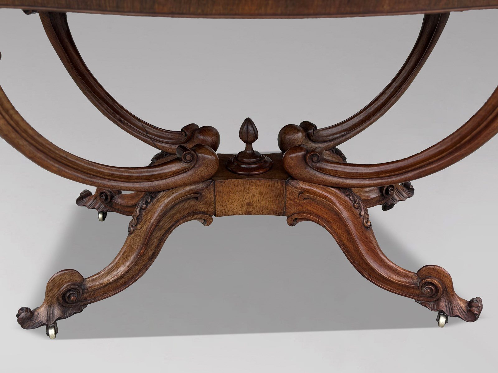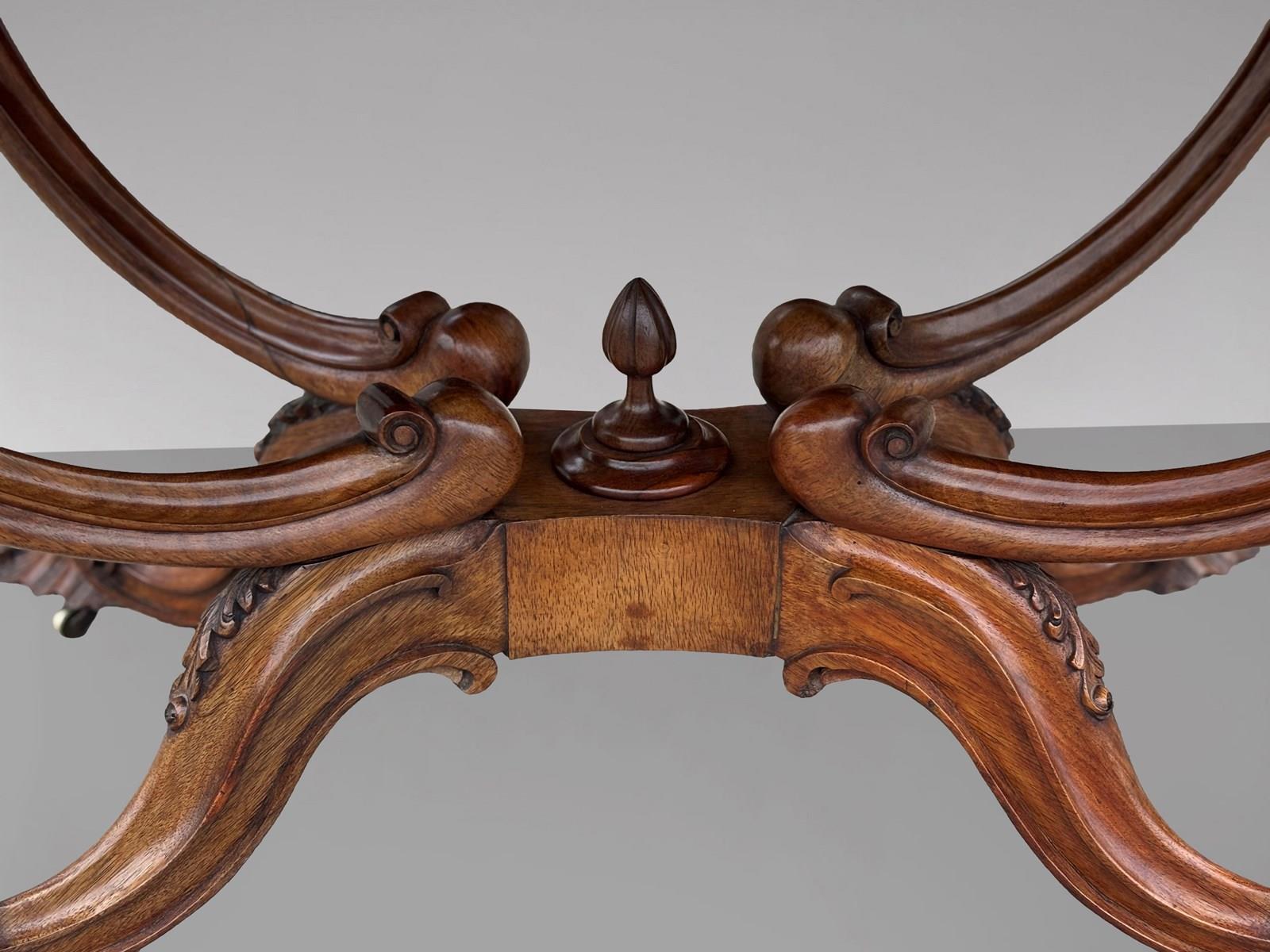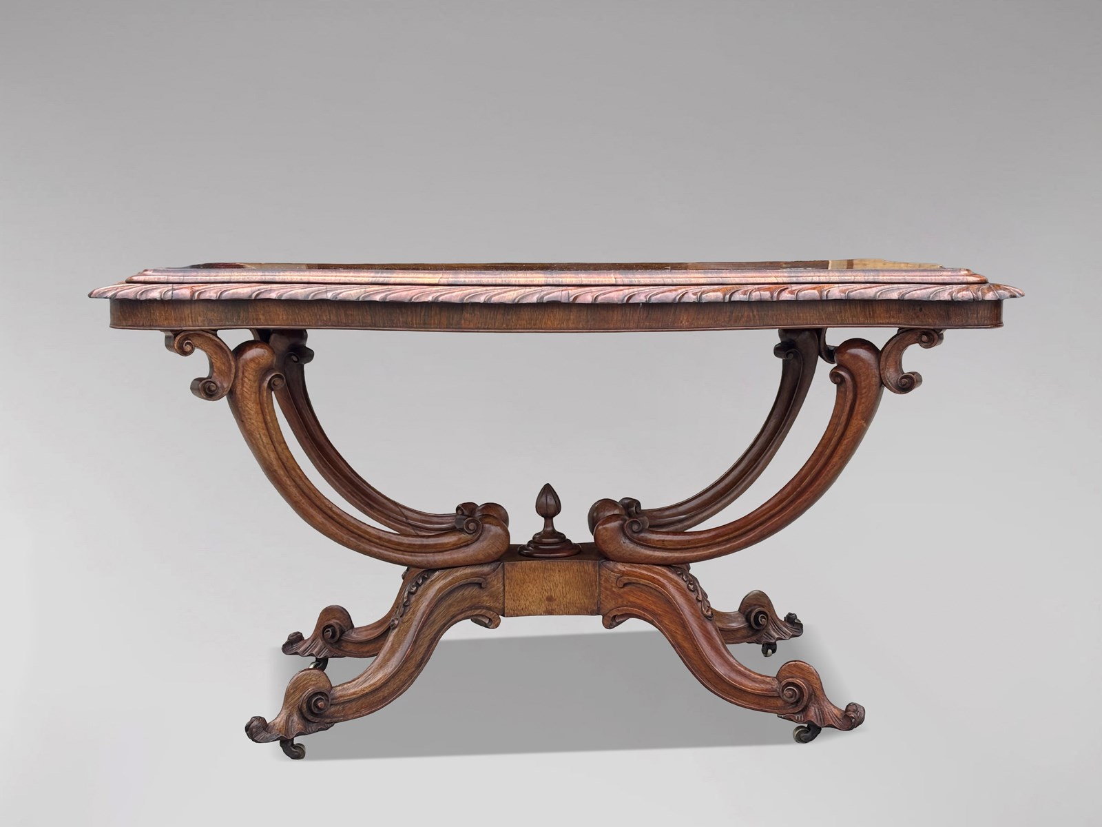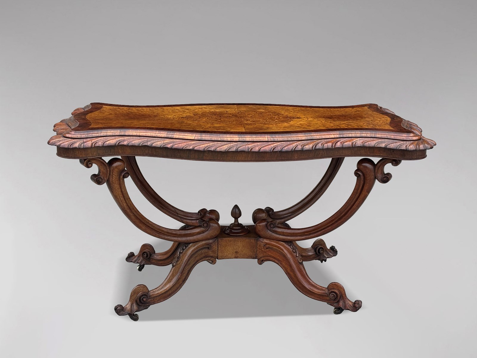 A superb example of mid 19th century English craftsmanship, this very fine Victorian burr walnut carved centre table combines exceptional quality, striking design and real decorative presence. Dating from 1850, the table features a beautifully shaped top in richly figured burr walnut, displaying wonderfully vivid grain patterns. The surface is framed with refined rosewood crossbanding and a carved moulded edge, all resting on an impressive solid walnut, basket shaped “birdcage” base. The base stands on elegantly shaped legs with finely carved details, each terminating in the original brass castors. The table also retains its original carved finials, both to the top and the lower stretcher, a mark of its completeness and quality. The colour and patina are entirely original, with a warm, characterful glow that only well preserved period furniture acquires over time. Structurally sound and in excellent original condition, this is a top quality piece throughout.