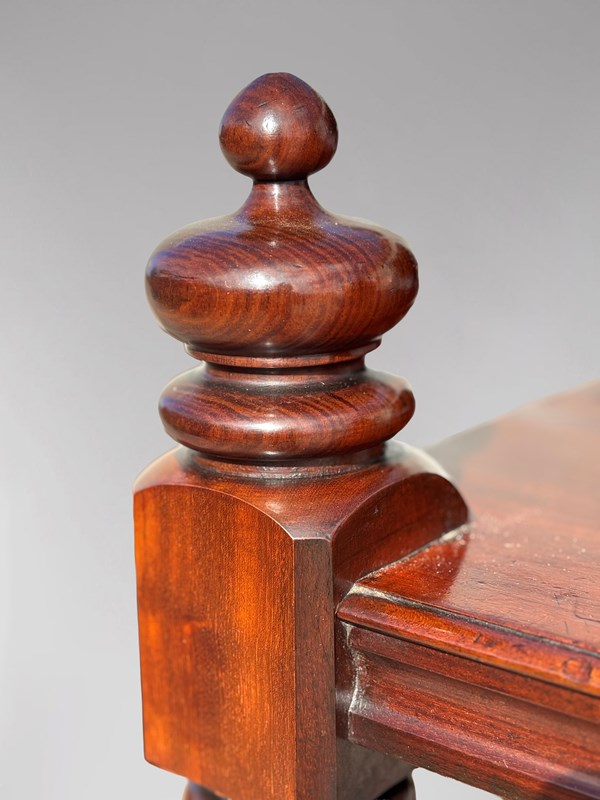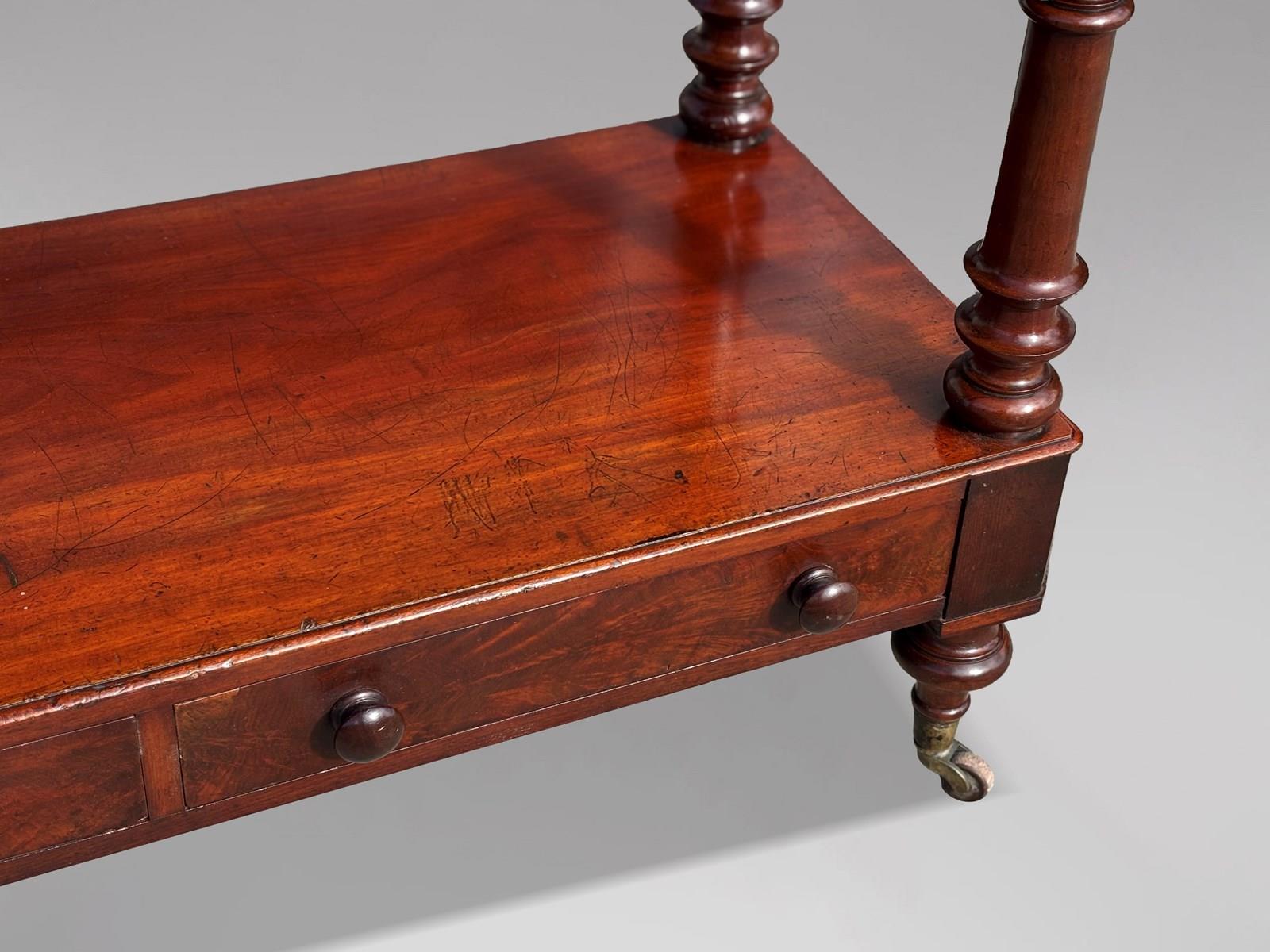 In terms of condition, this buffet or dumb waiter is in excellent original state, boasting a rich patina on the solid mahogany, which speaks to its quality craftsmanship and the care it has received over the years. The figured mahogany exhibits a rich, warm patina, enhancing its visual appeal. This buffet is not only a testament to exceptional early Victorian craftsmanship but also a striking example of classic design, making it an ideal piece for any refined interior.
