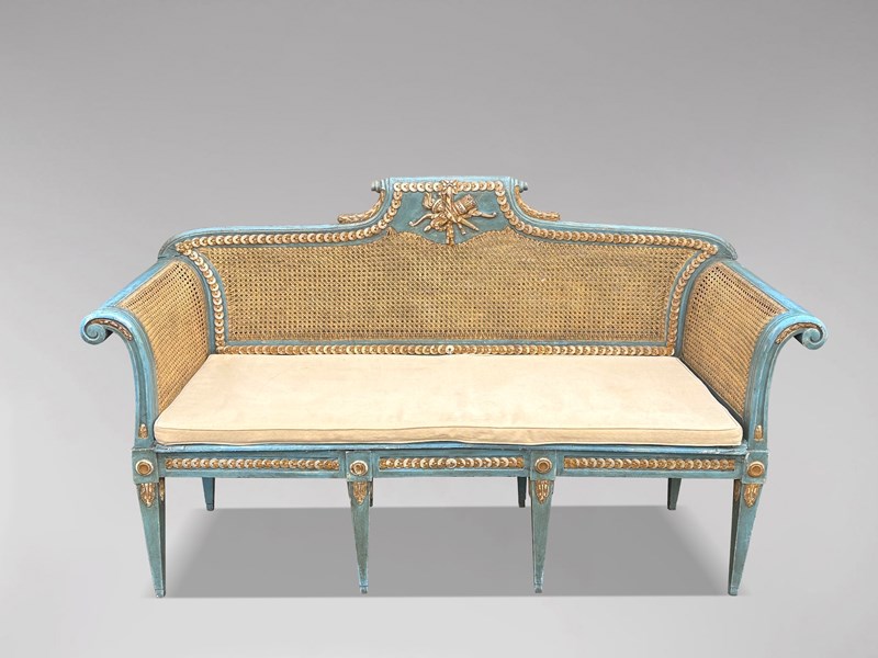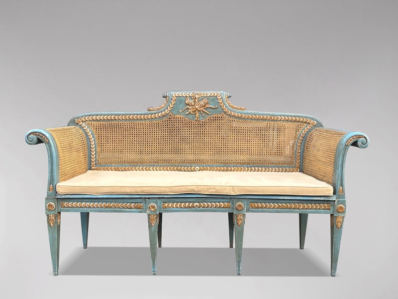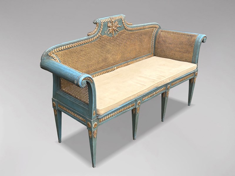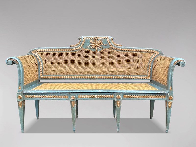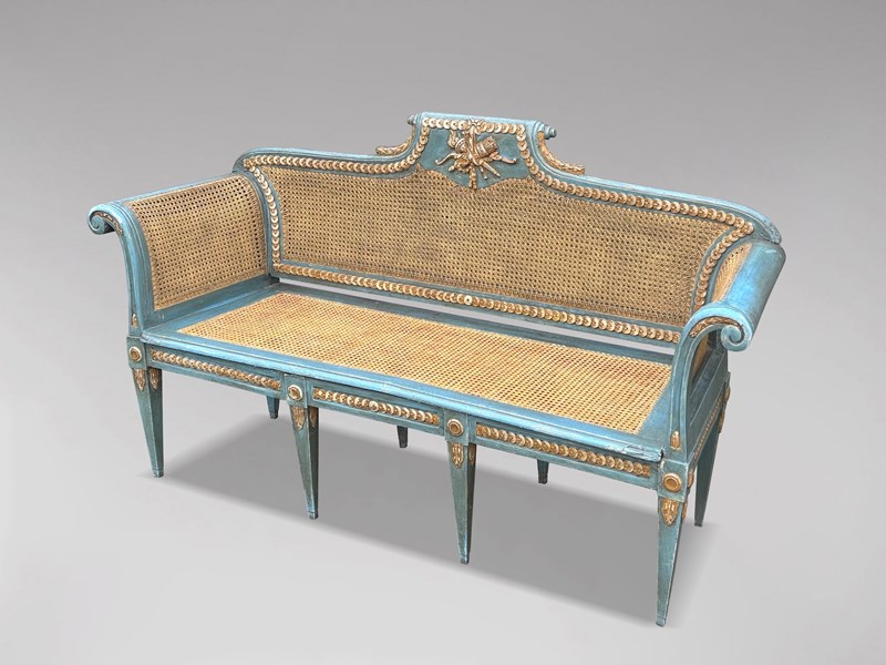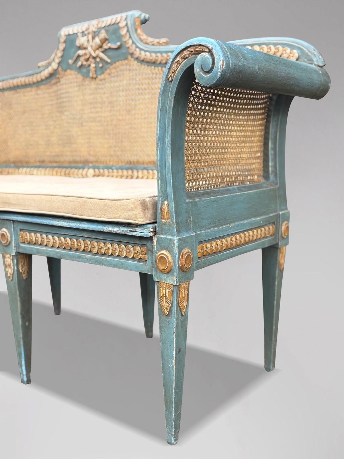This refined piece is crafted in carved and painted wood, with fine cane work to the backs, armrests and seat. Raised on eight tapered, fluted legs, the bench has a straight apron with a recessed central band richly adorned with a giltwood circular ribbon motif. The two caned, scrolled sides are further embellished with giltwood carvings, adding depth and sophistication. The shaped caned back features an intricate intertwined circular top motif flanking a central scrolling reserve. Each back section is crowned with a carved bow, while rosettes decorate the tops of the legs and the centre of the seat. The caned backs and seat are painted with a delicate lozenge design, and the bench comes with a fitted squab cushion, upholstered for comfort and ready to use.