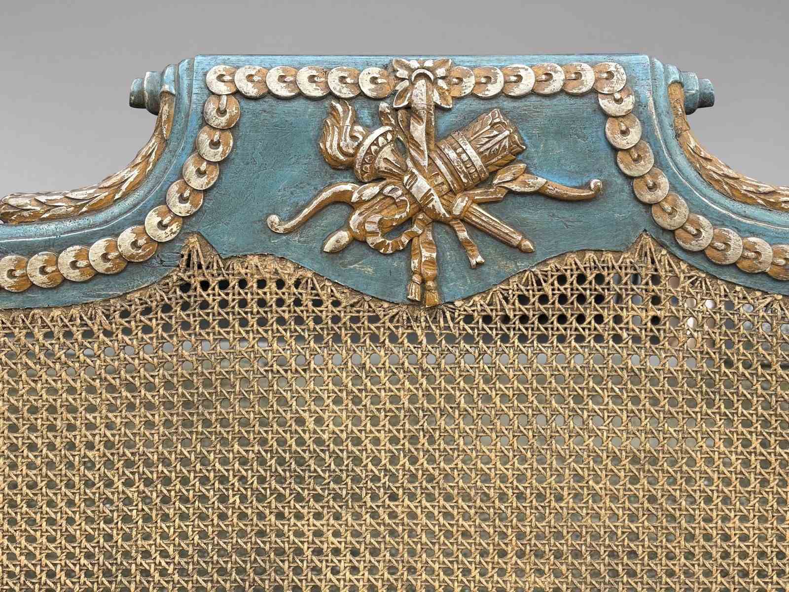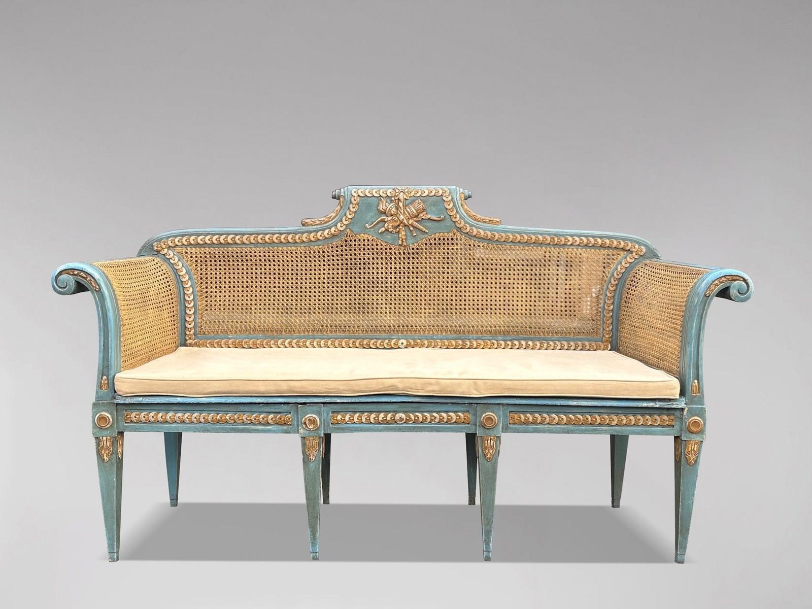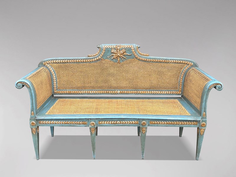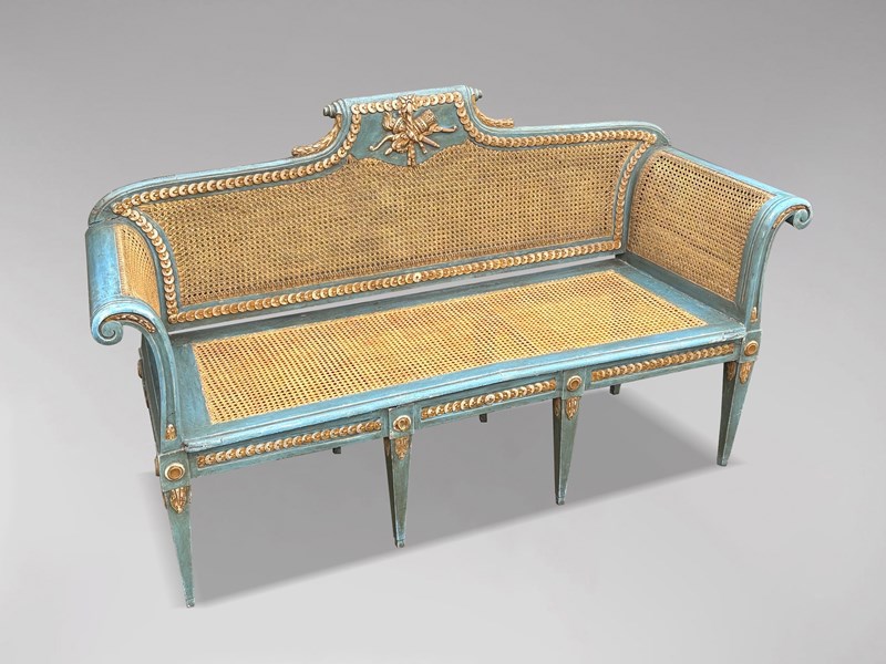 This refined piece is crafted in carved and painted wood, with fine cane work to the backs, armrests and seat. Raised on eight tapered, fluted legs, the bench has a straight apron with a recessed central band richly adorned with a giltwood circular ribbon motif. The two caned, scrolled sides are further embellished with giltwood carvings, adding depth and sophistication. The shaped caned back features an intricate intertwined circular top motif flanking a central scrolling reserve. Each back section is crowned with a carved bow, while rosettes decorate the tops of the legs and the centre of the seat. The caned backs and seat are painted with a delicate lozenge design, and the bench comes with a fitted squab cushion, upholstered for comfort and ready to use.
